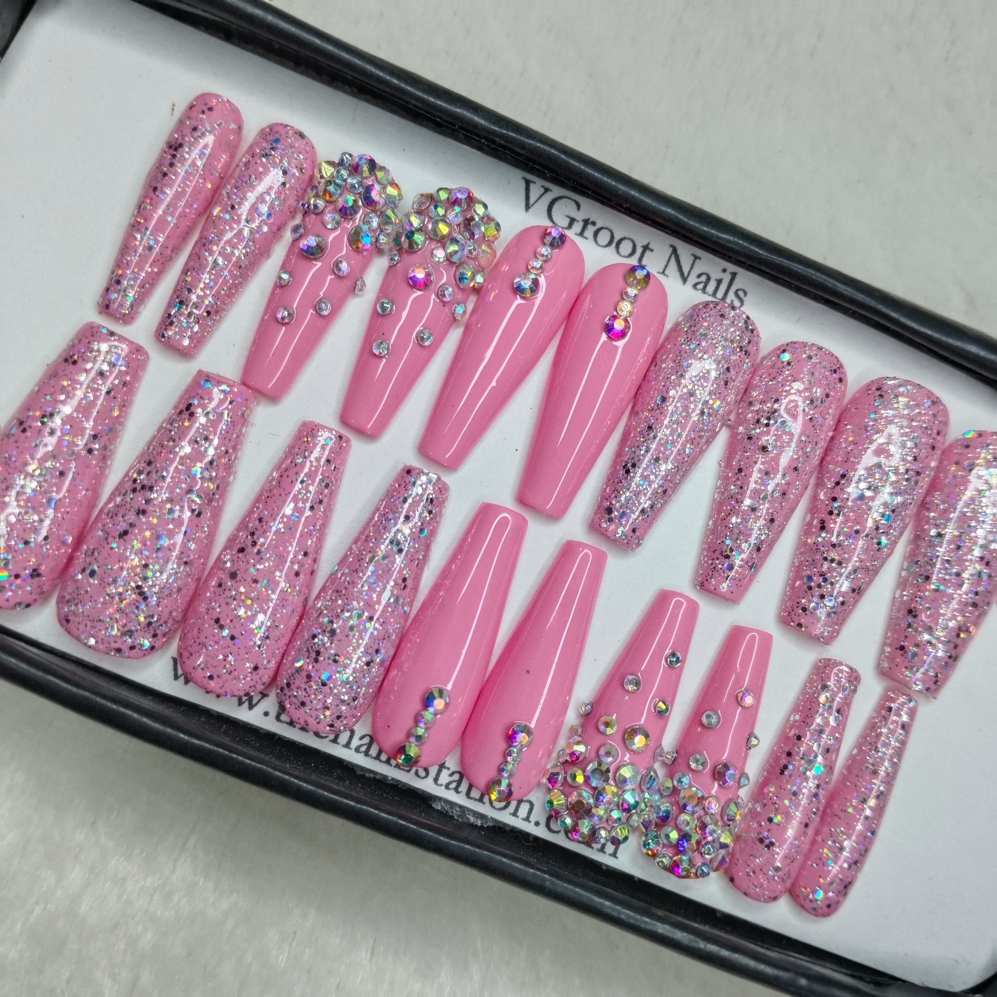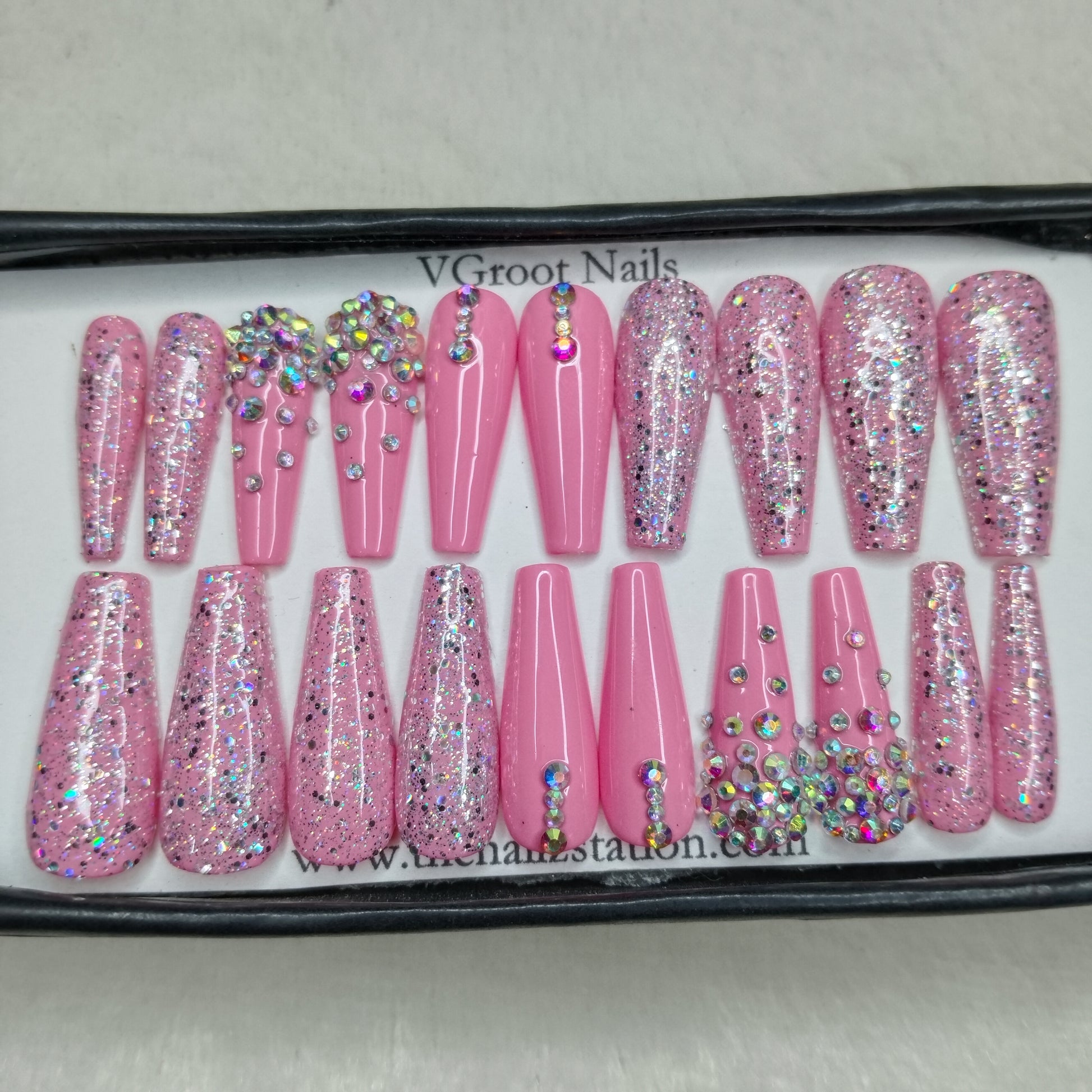 The NailzStation Glossy Light Pink Glitter Studded Press on Fake Artificial Nails Set with glue, filer, sticker application kit // 1182