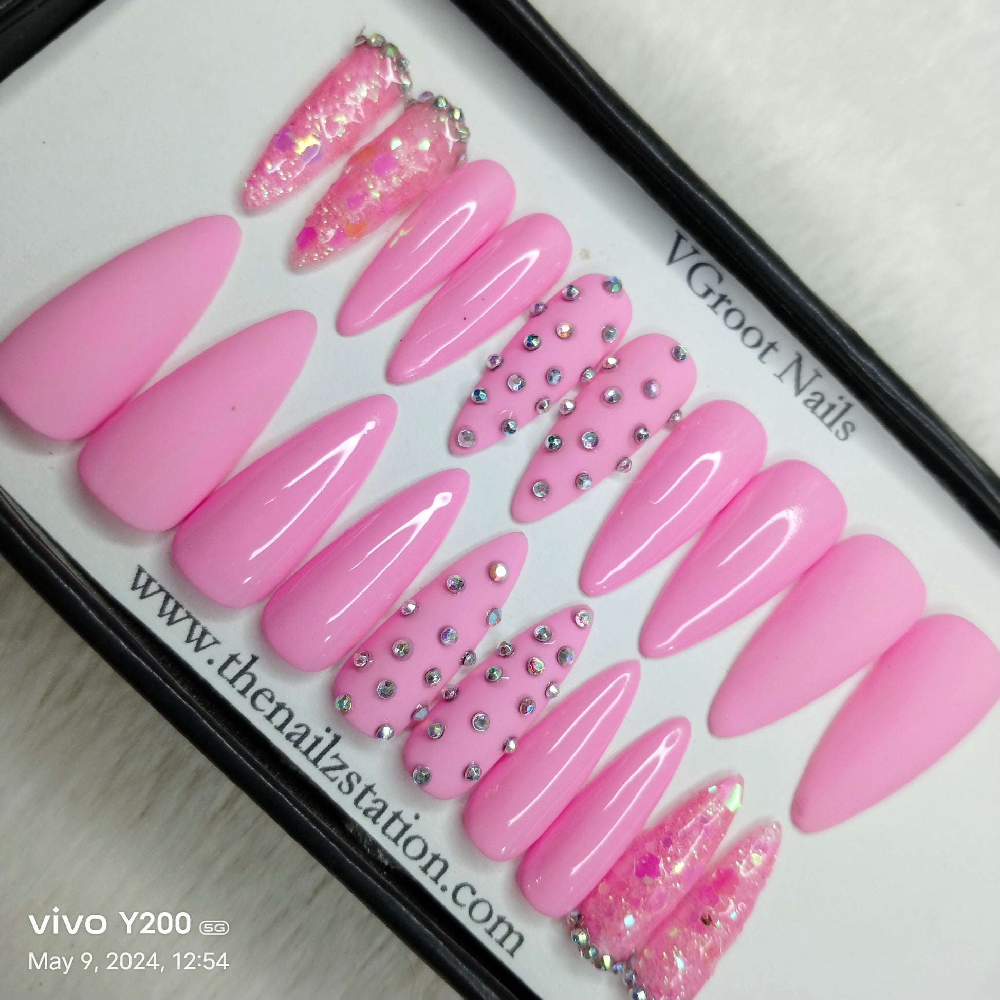The NailzStation Glossy Light Pink Studded Press on Fake Artificial Nails Set with glue, filer, sticker application kit // 1167