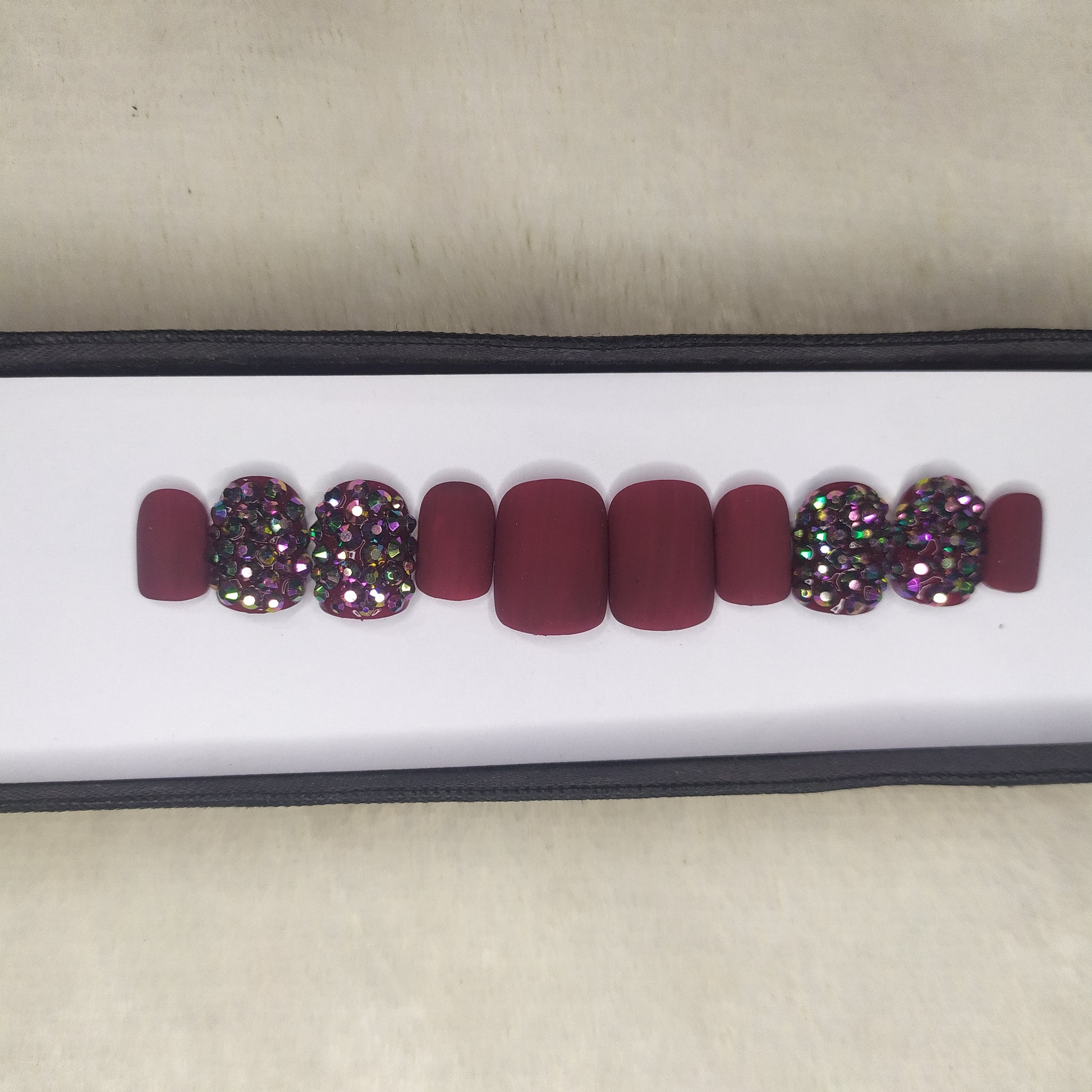 The NailzStation Glossy Maroon Studded Press on Fake Artificial Nails Set with glue, filer, sticker application kit // 1286