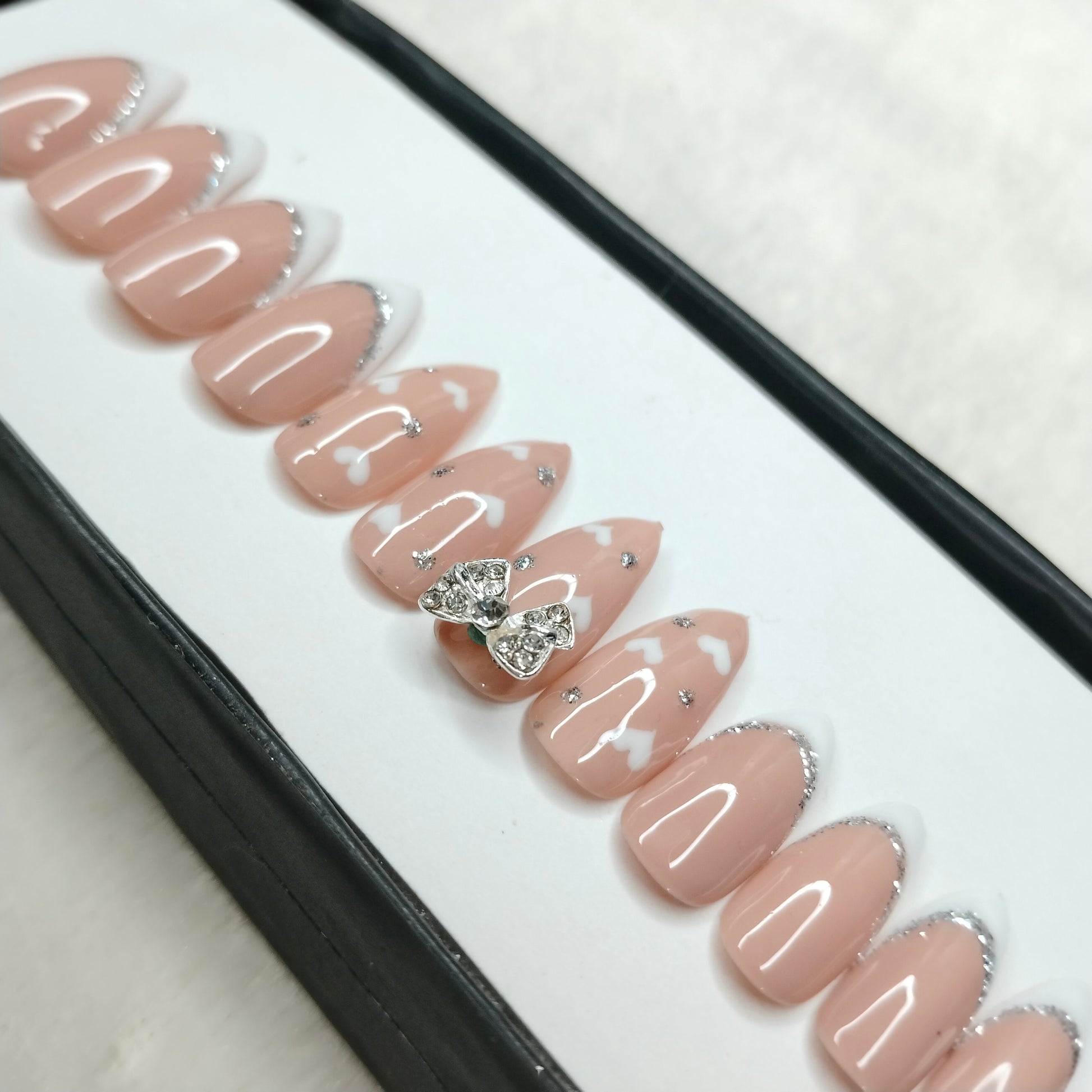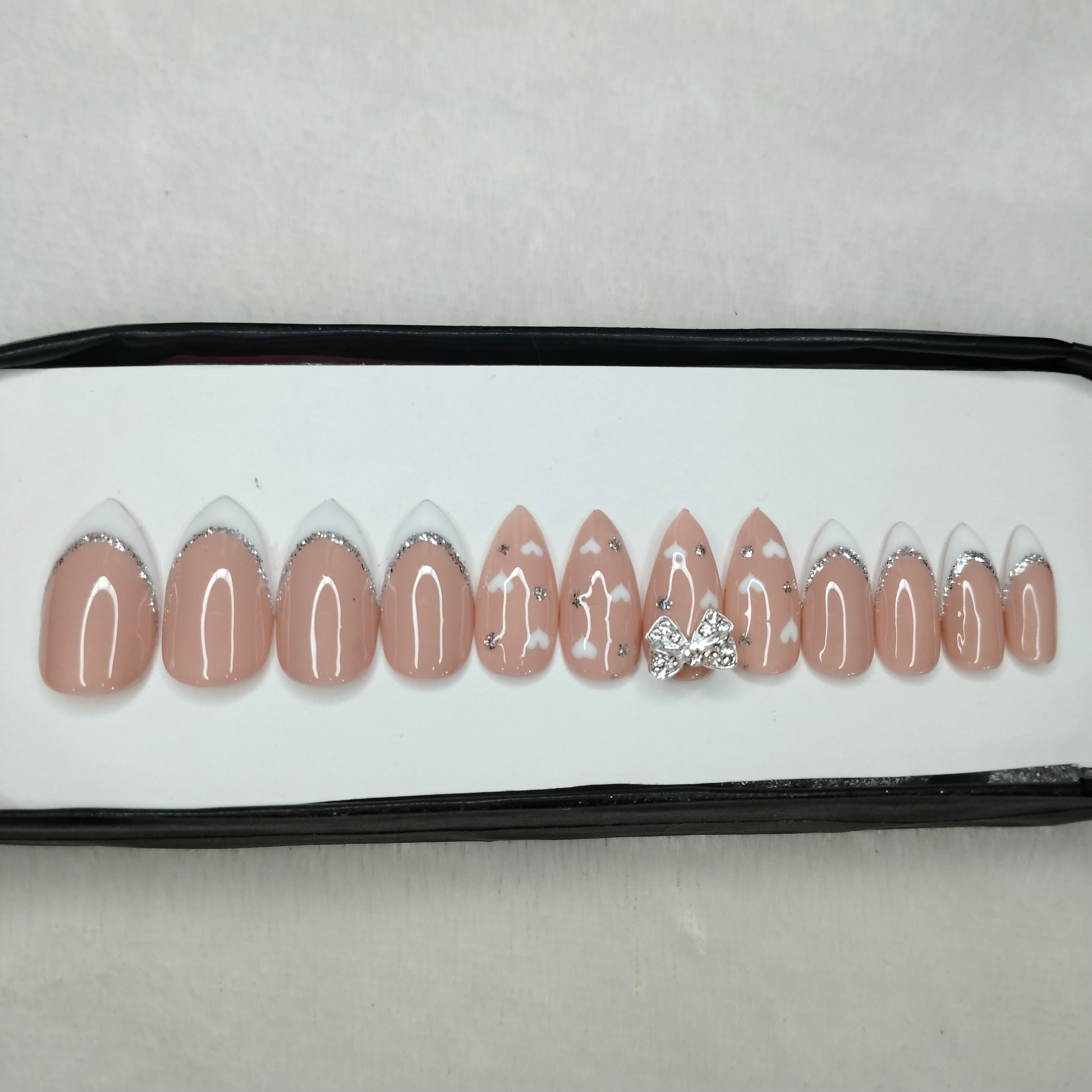 The NailzStation Glossy Nude French 3D Bow Press on Fake Artificial Nails Set with glue, filer, sticker application kit // 1193