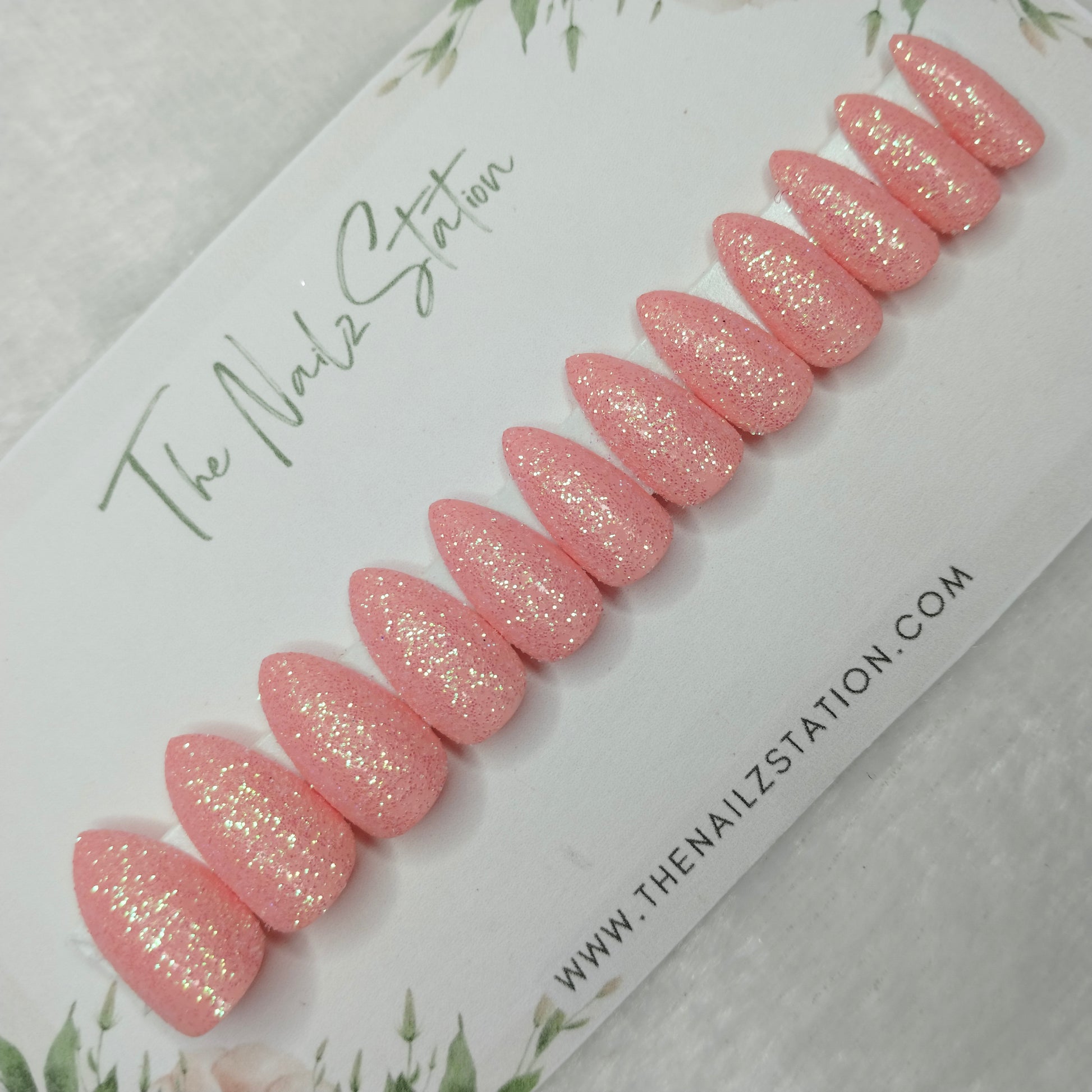 The NailzStation Glossy Peach Glitter Press on Fake Artificial Nails Set with glue, filer, sticker application kit // 1456