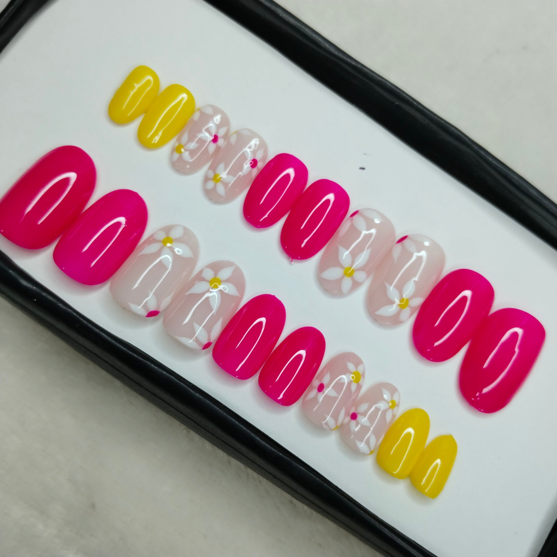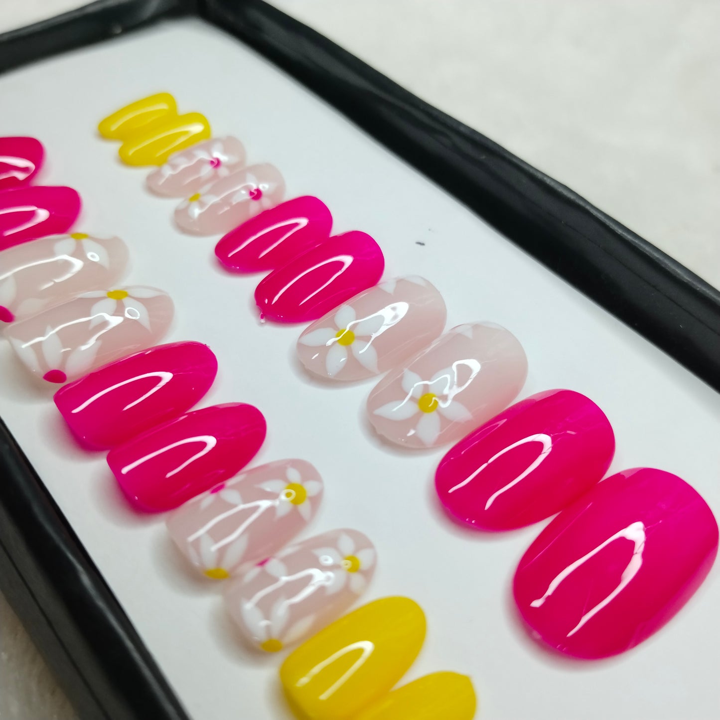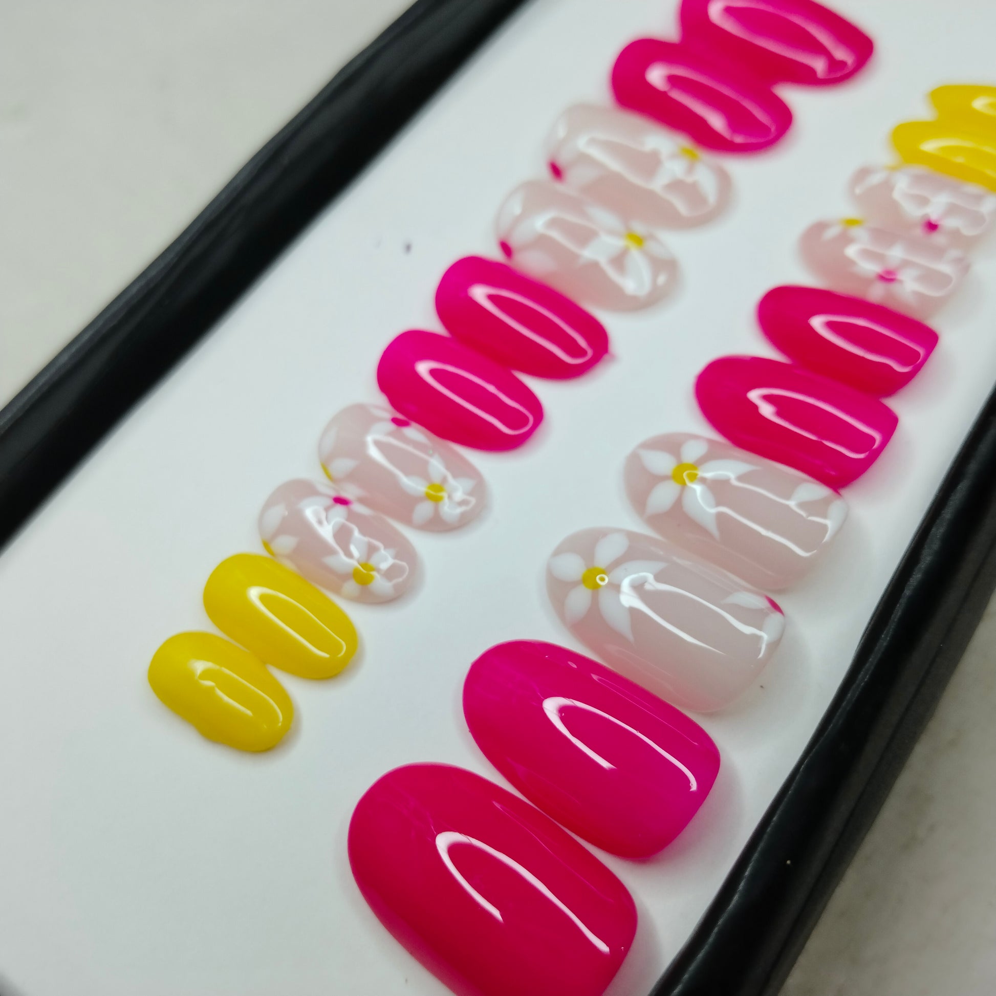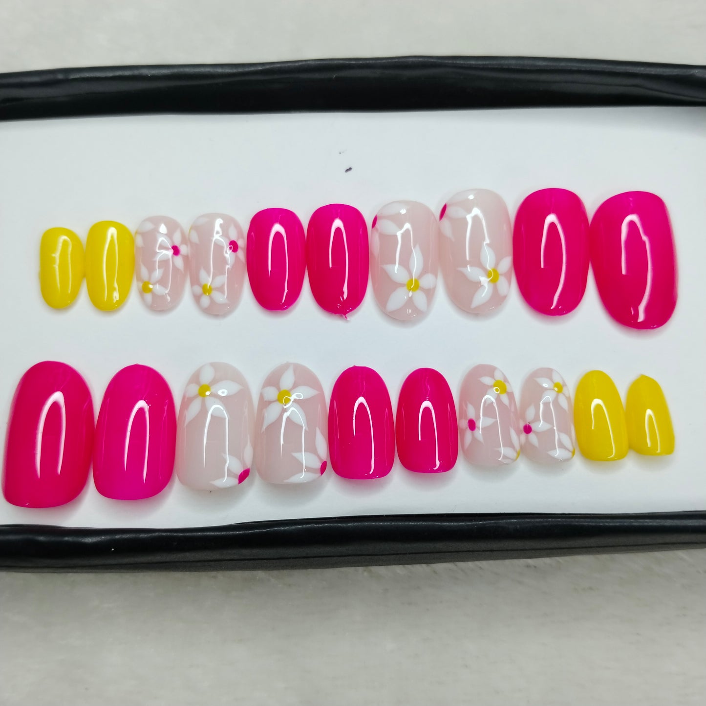 The NailzStation Glossy Pink and Yellow Floral Press on Fake Artificial Nails Set with glue, filer, sticker application kit // 1179