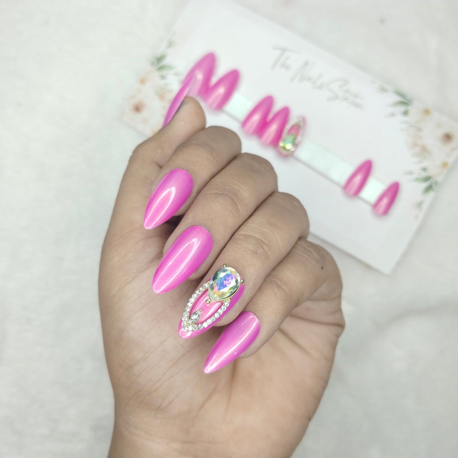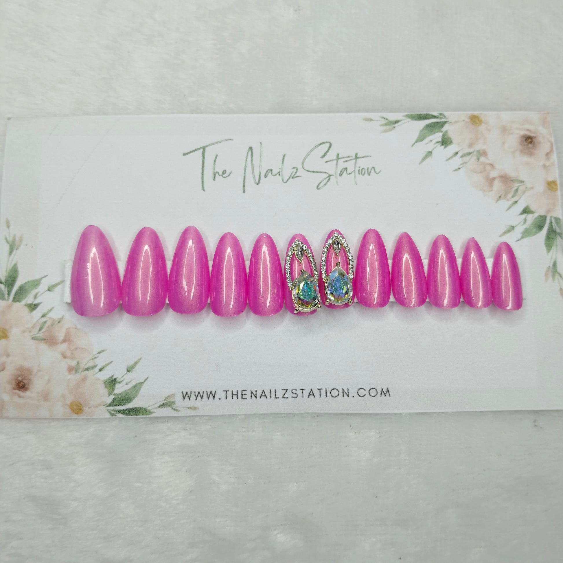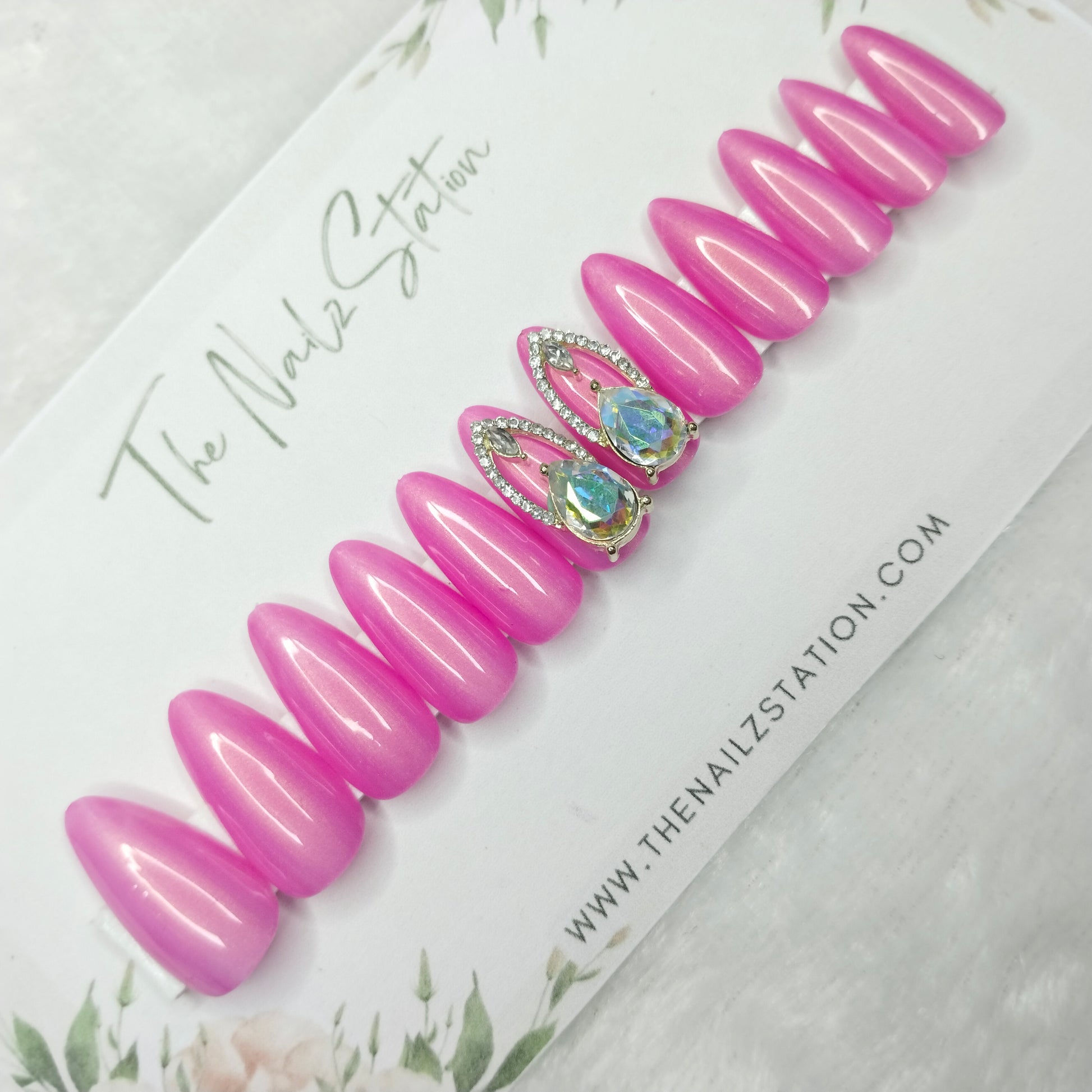 The NailzStation Glossy Pink Chrome 3D Jewelry Press on Fake Artificial Nails Set with glue, filer, sticker application kit // 1457