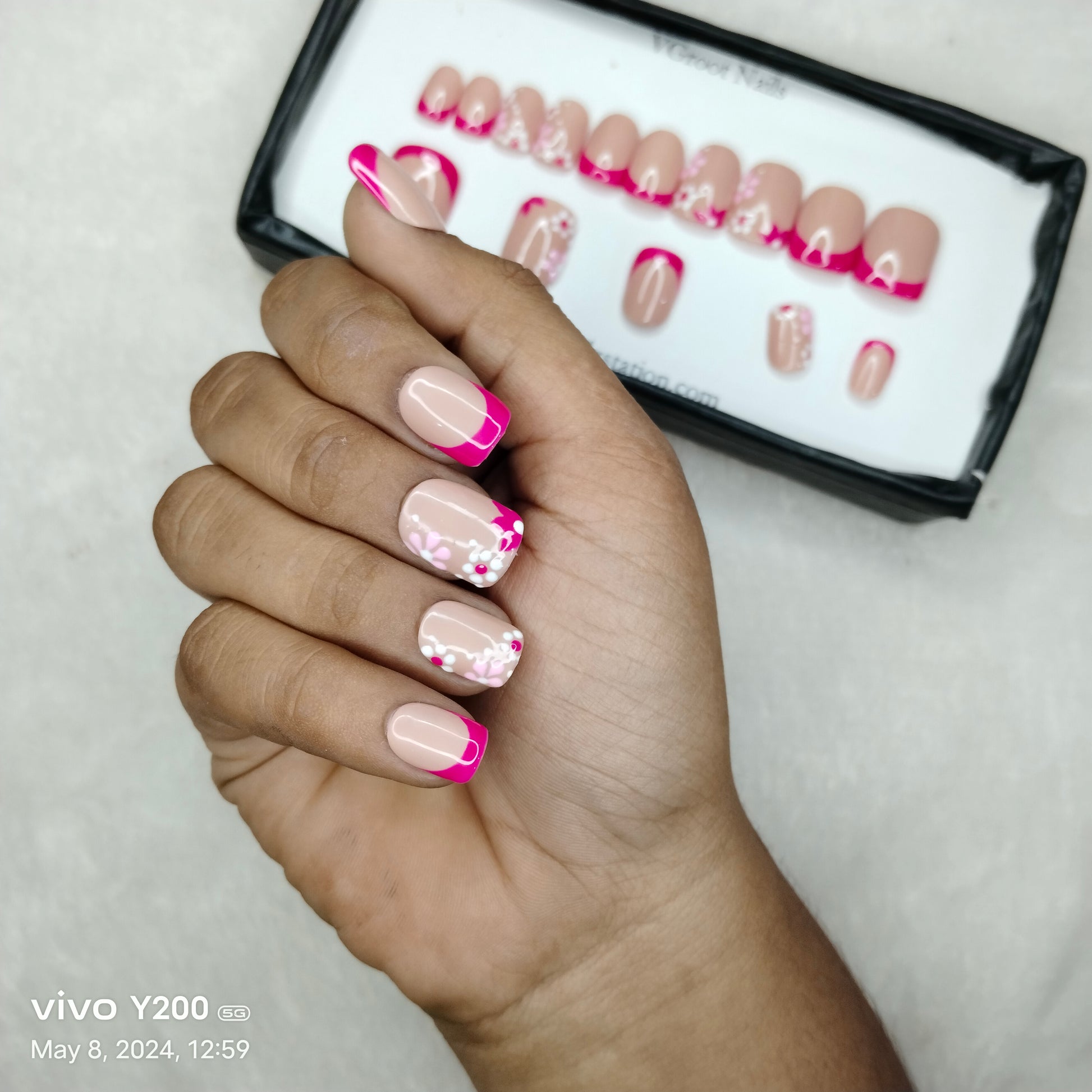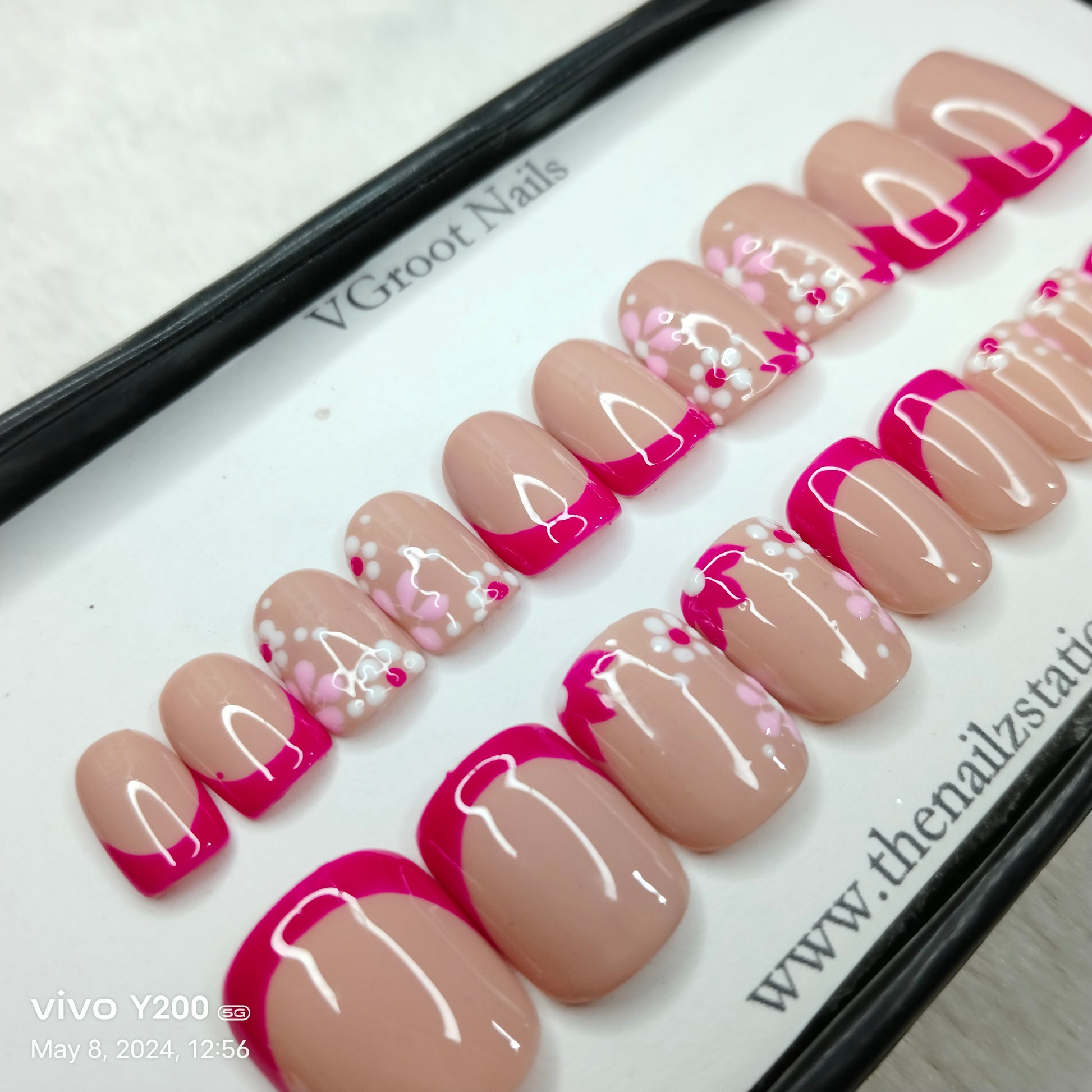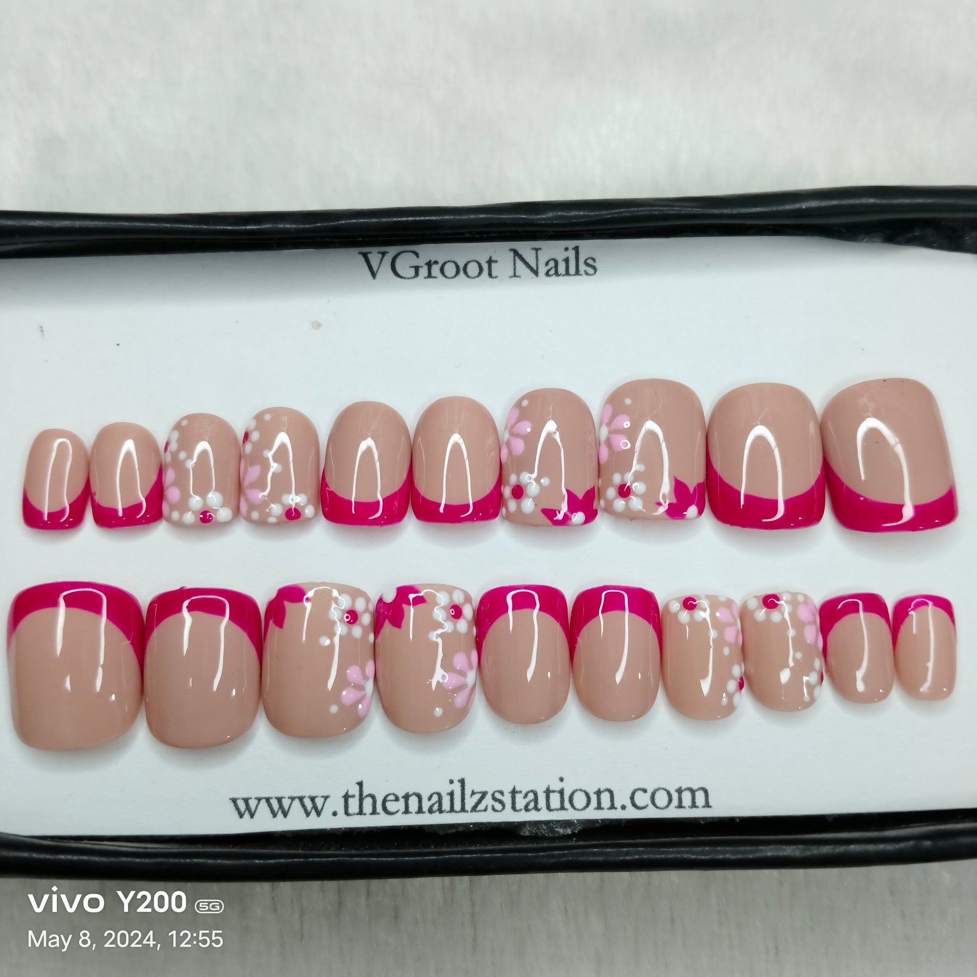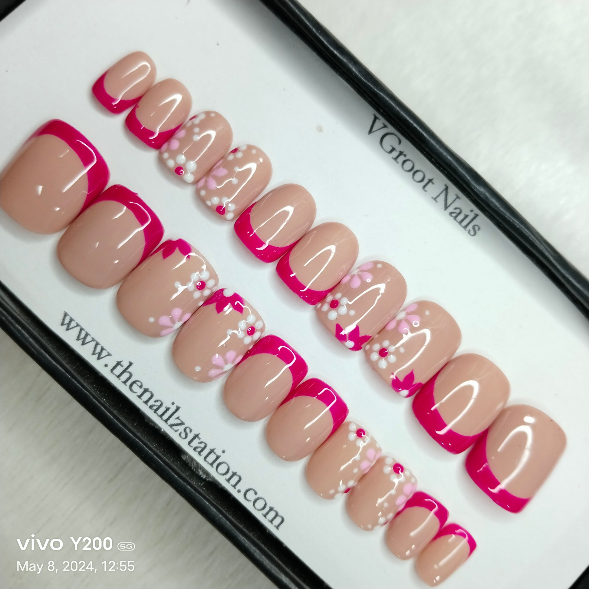 The NailzStation Glossy Pink French Floral Press on Fake Artificial Nails Set with glue, filer, sticker application kit // 1165