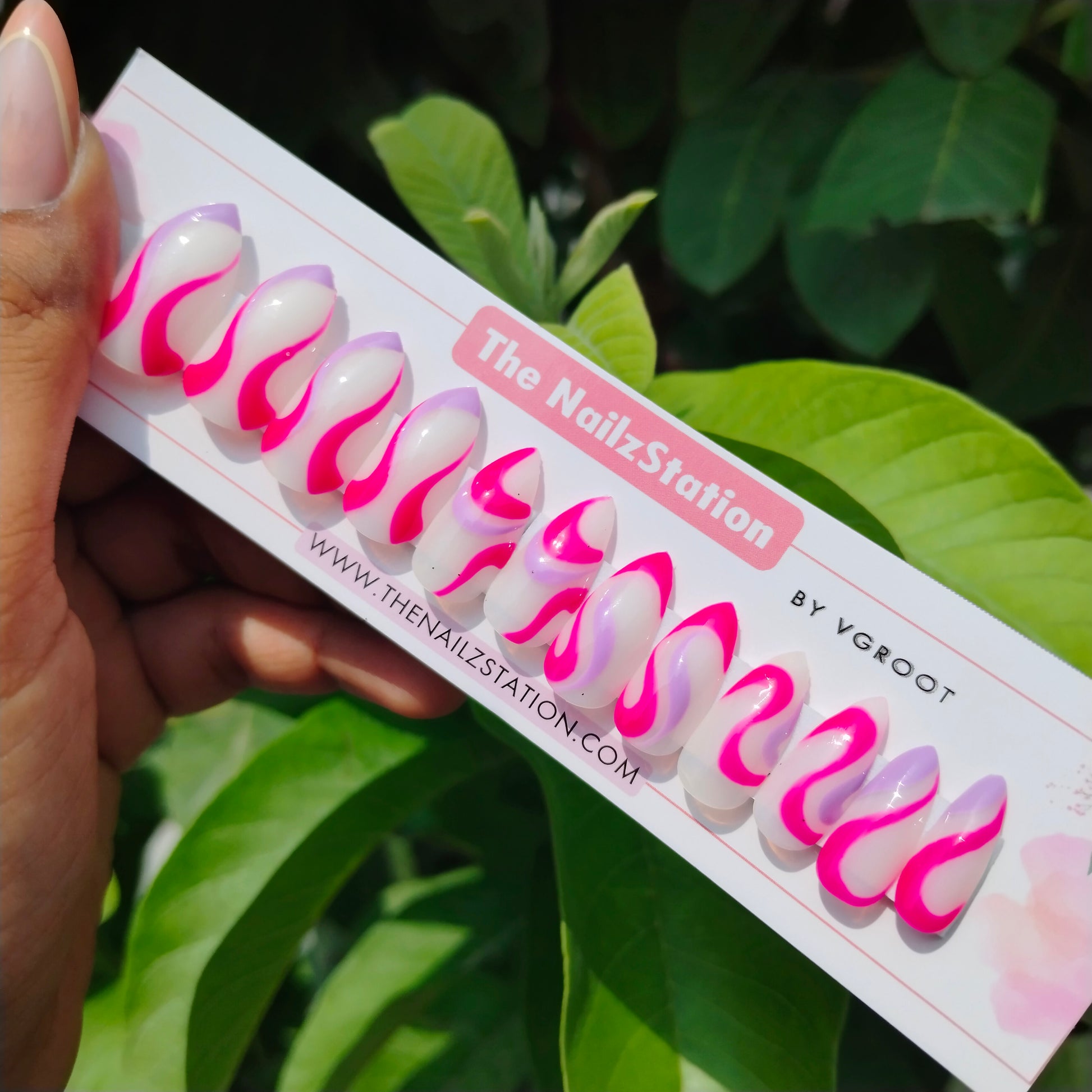 The NailzStation Glossy Pink Swirls Press on Fake Artificial Nails Set with glue, filer, sticker application kit // 1269