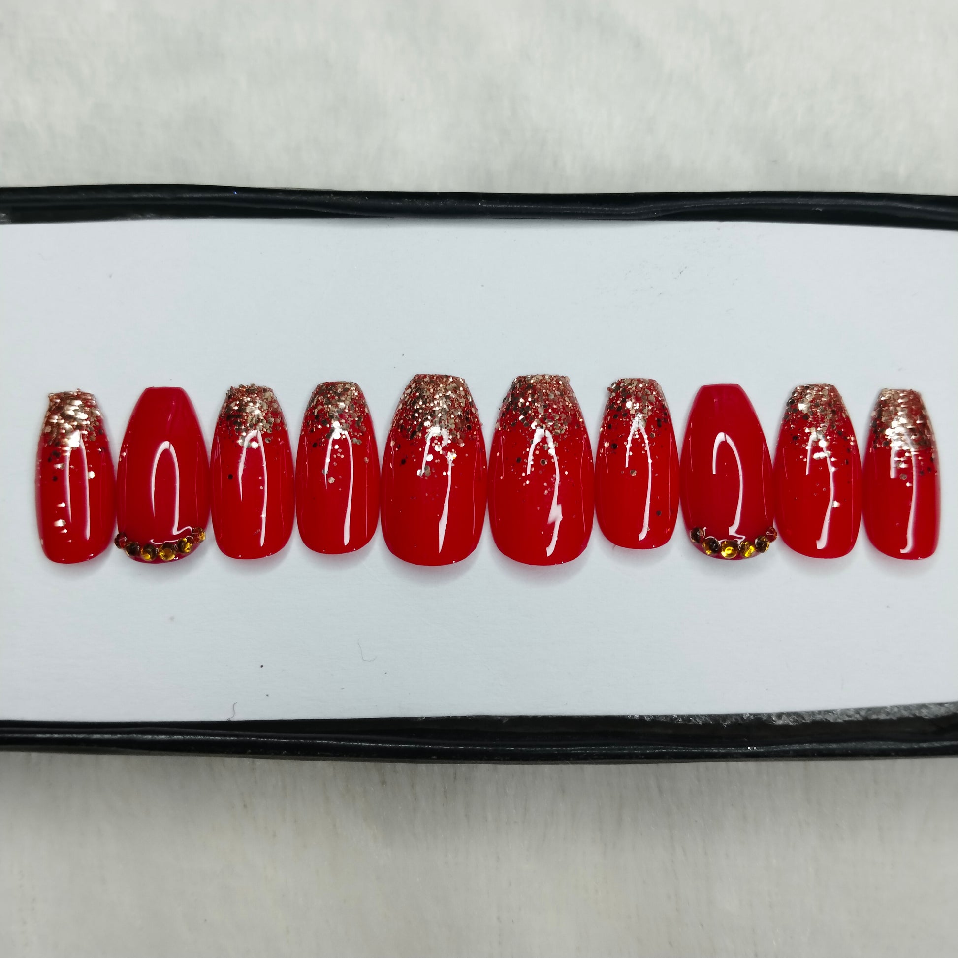 The NailzStation Glossy Red Glitter Studded Press on Fake Artificial Nails Set with glue, filer, sticker application kit // 1417