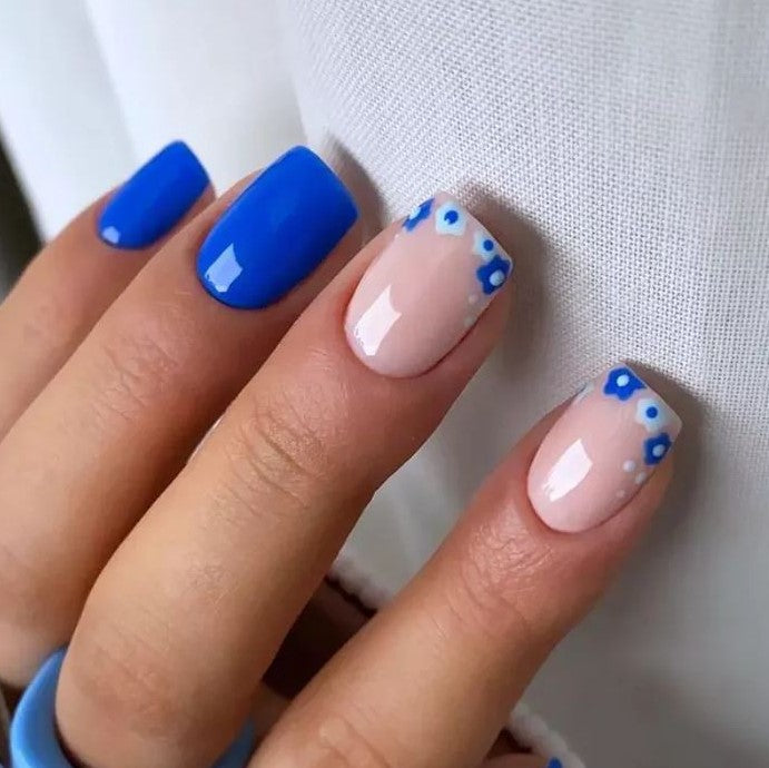 Glossy Blue Floral Press on Fake Artificial Nails / tns752