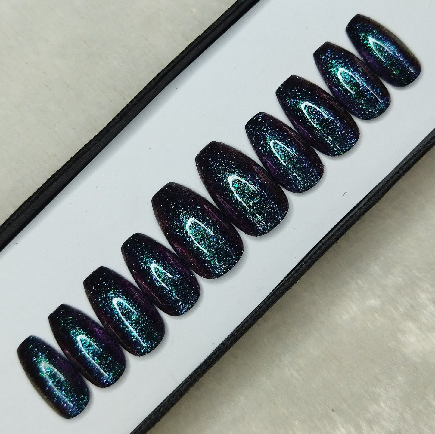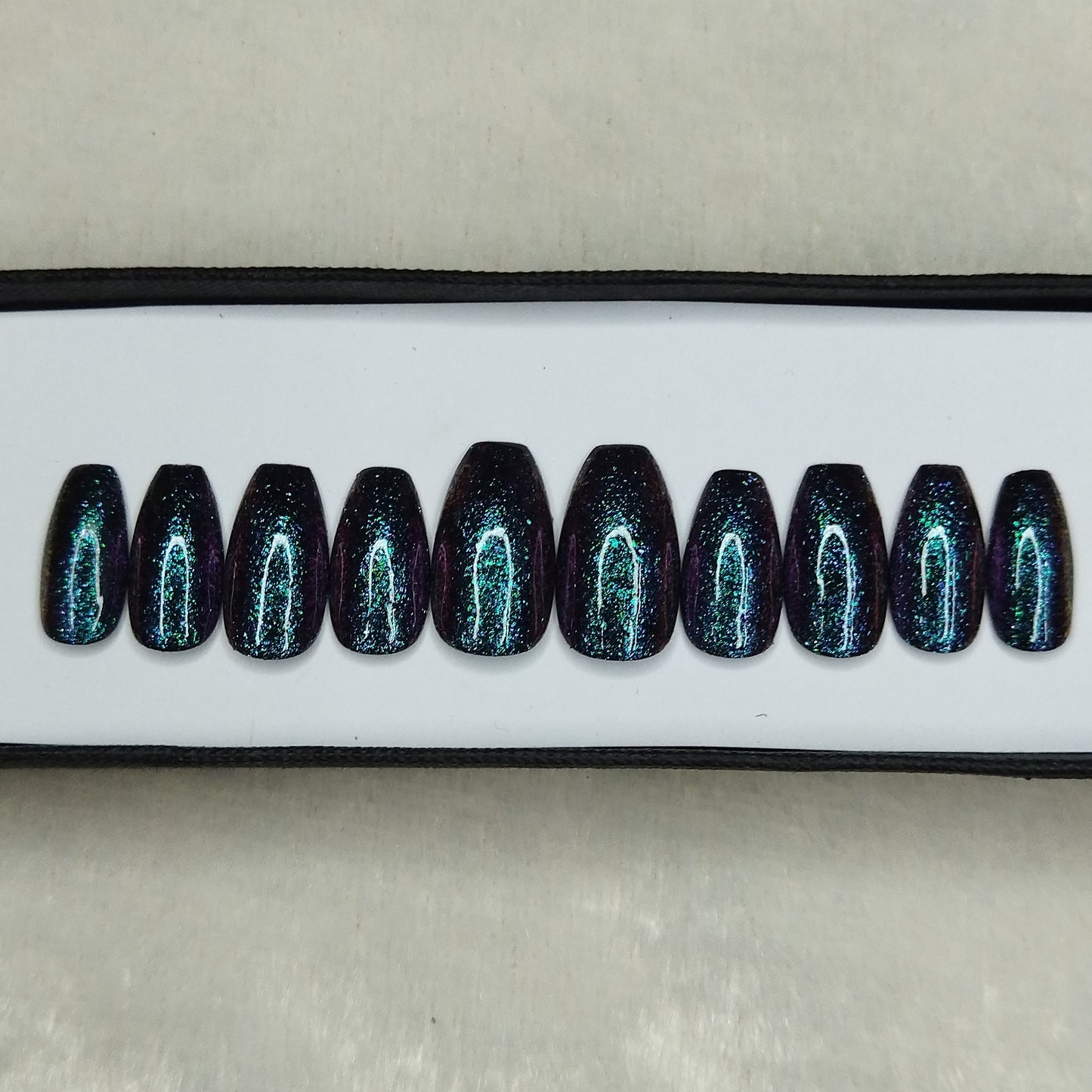 Glossy Blue Multi Chrome Flakes (C03) Print Press on Nails / Fake Nails / Artificial Nails Set // 589
