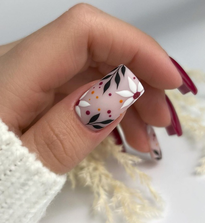 Glossy Maroon Floral Press on Fake Nails // tns860