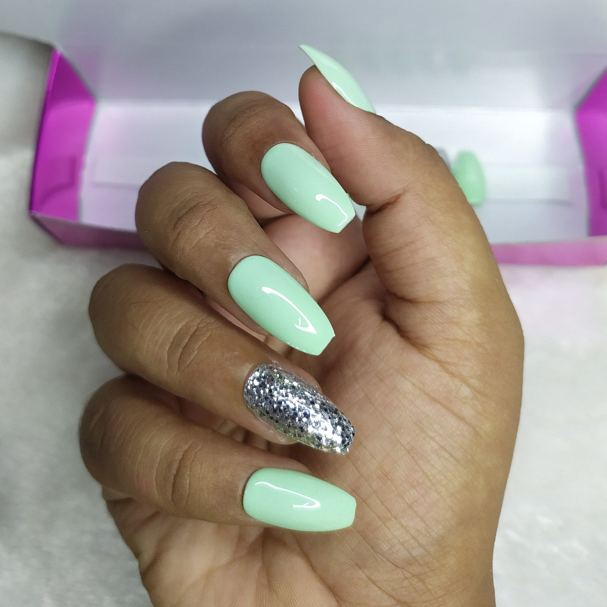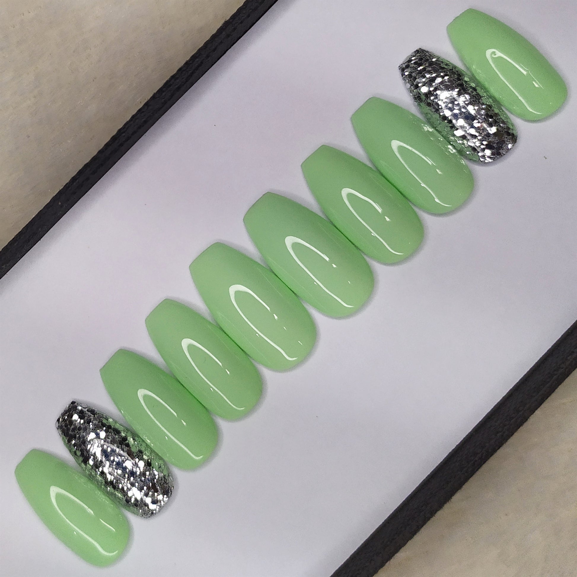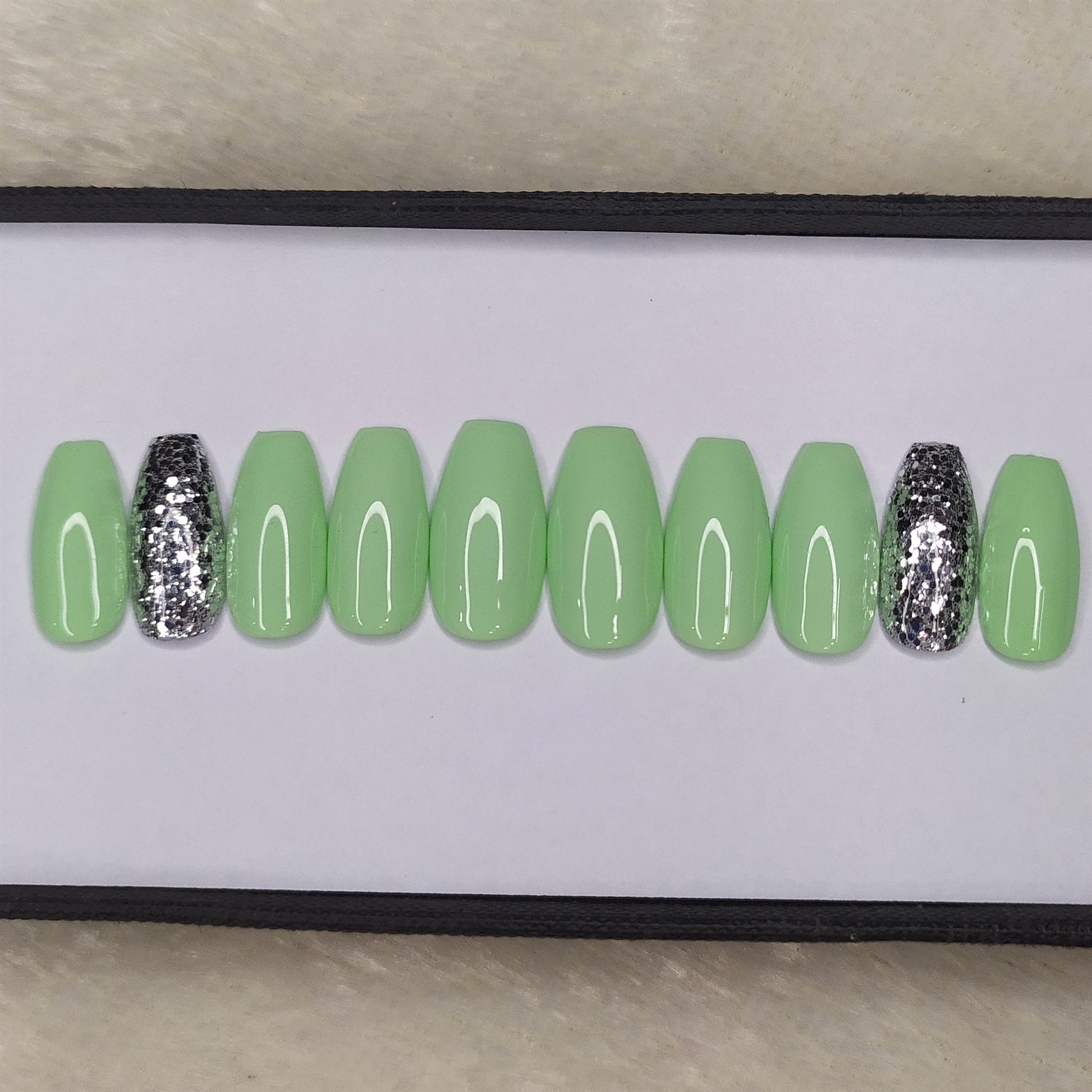 Glossy Pastel Green Silver Glitter Press on Nails Set // 535