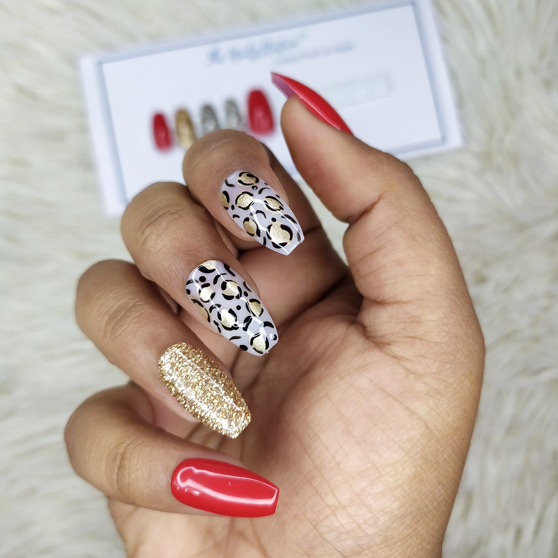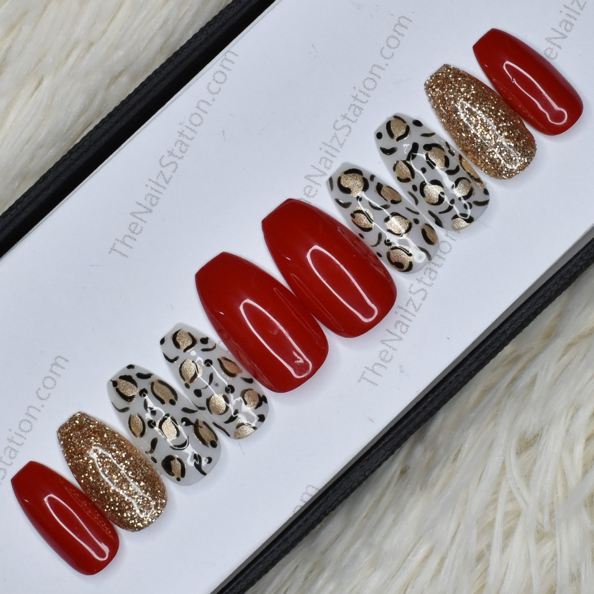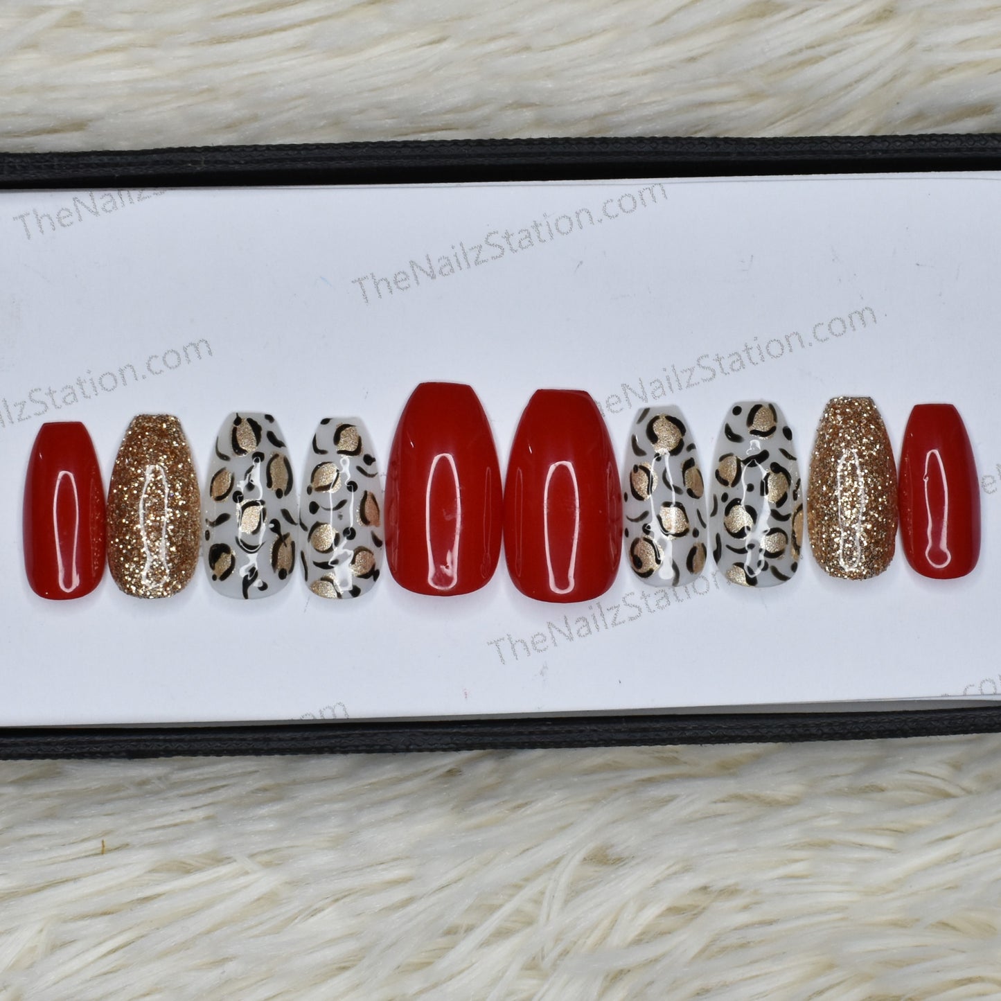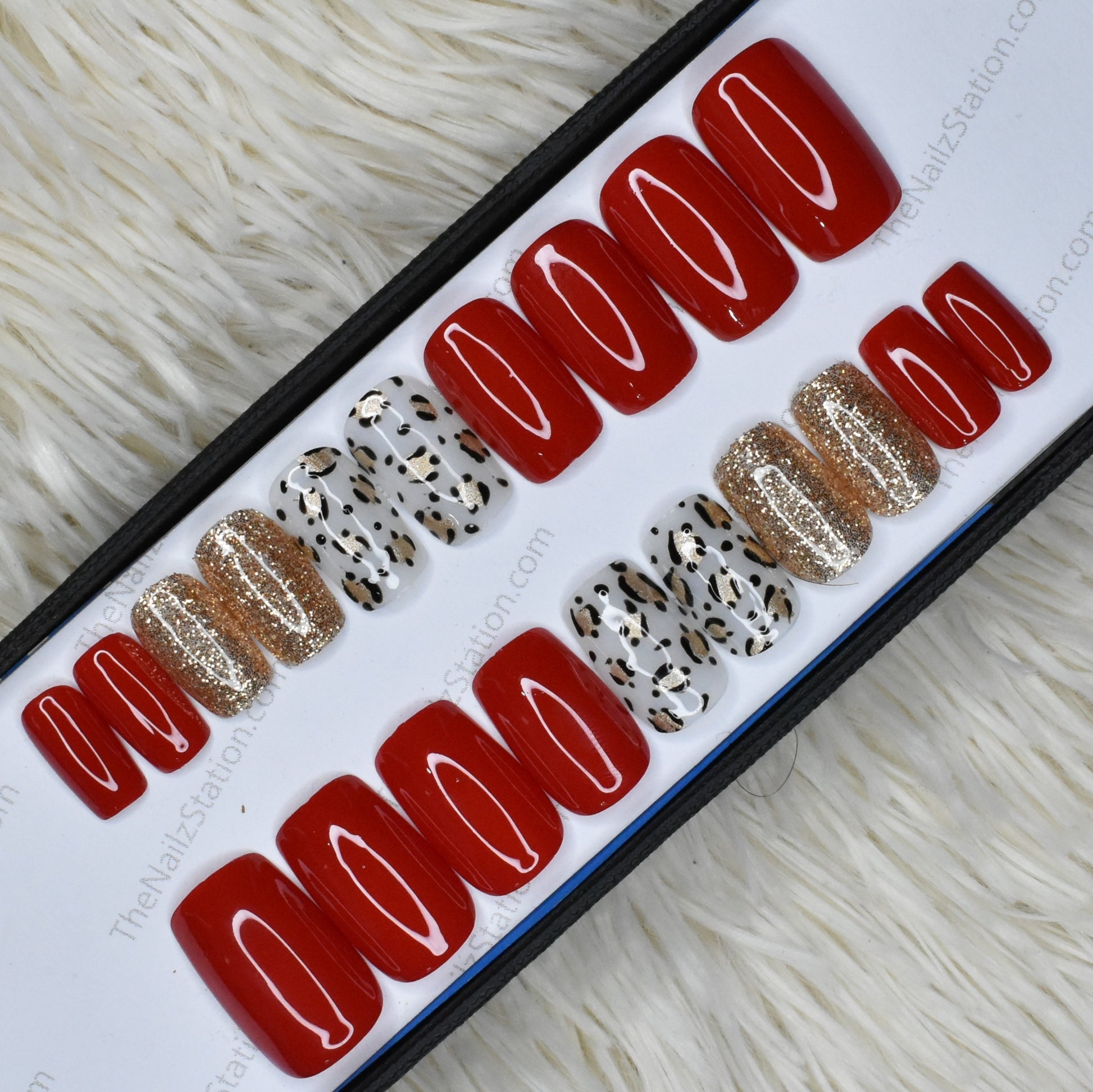 Glossy Red and White Animal Print Glitter Press on Nails // 407