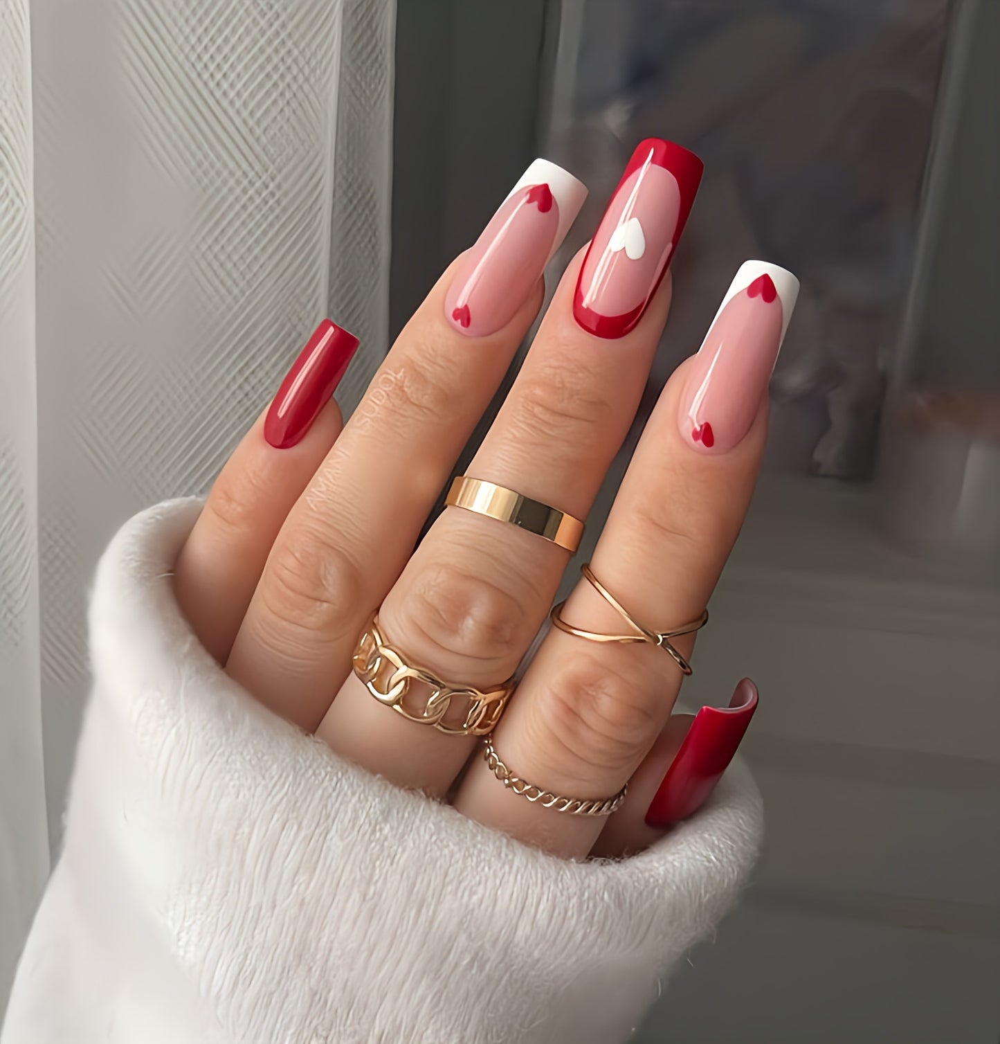 Glossy Red and White French Hearts Press on Fake Artificial Nails / tns1279