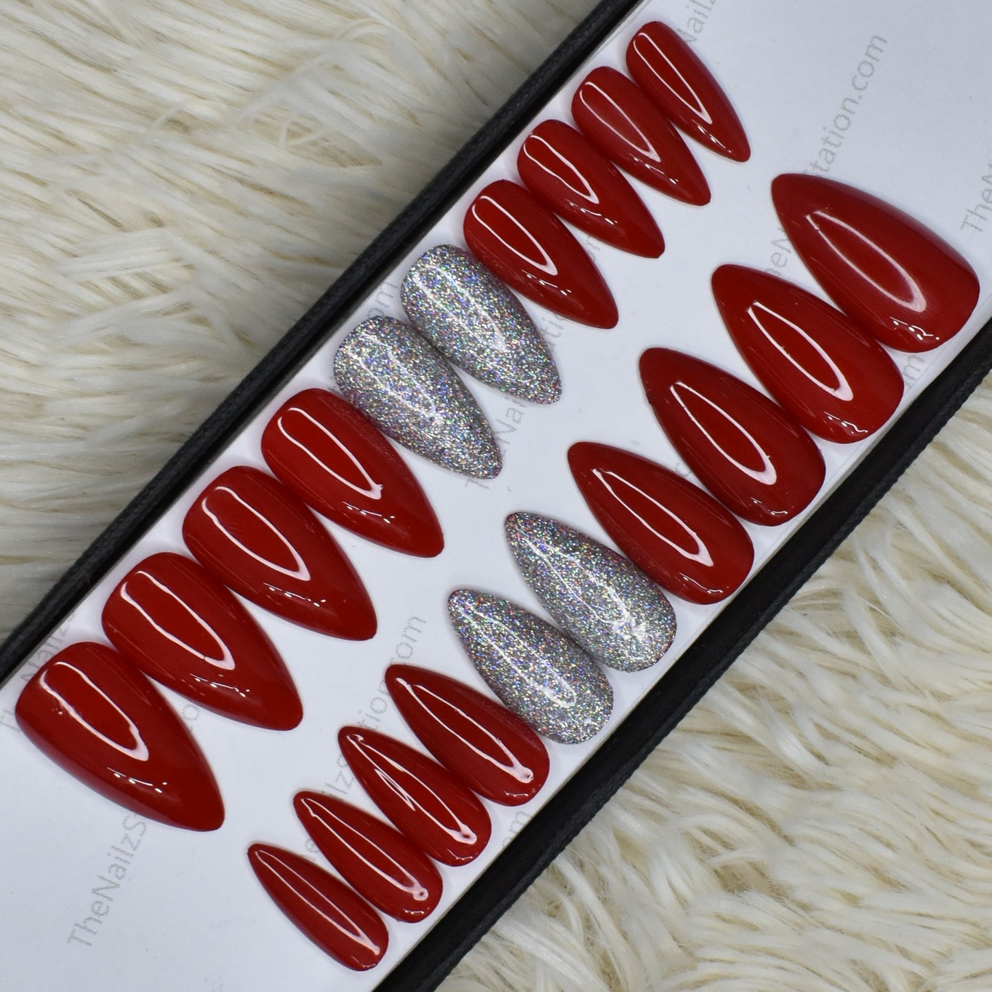 Glossy Red Holographic Glitter Press on Nails Set // 455