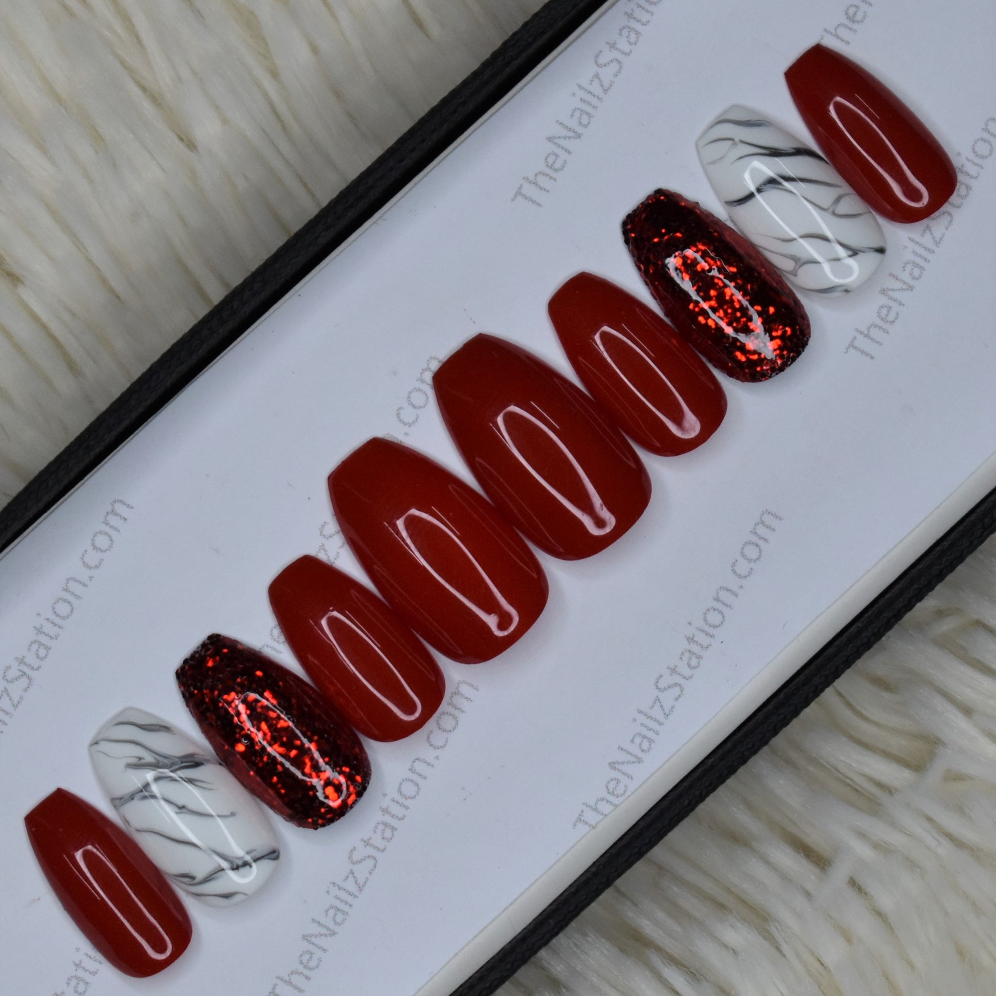 Glossy Red with marble and glitter Press on Nails Set // 406