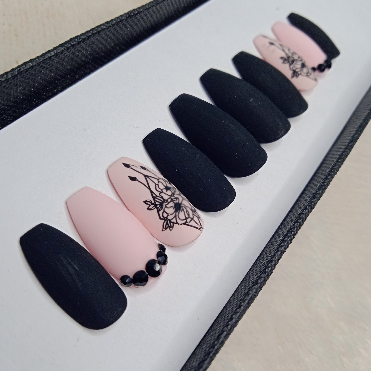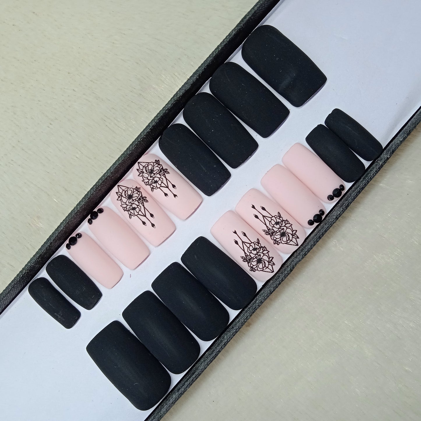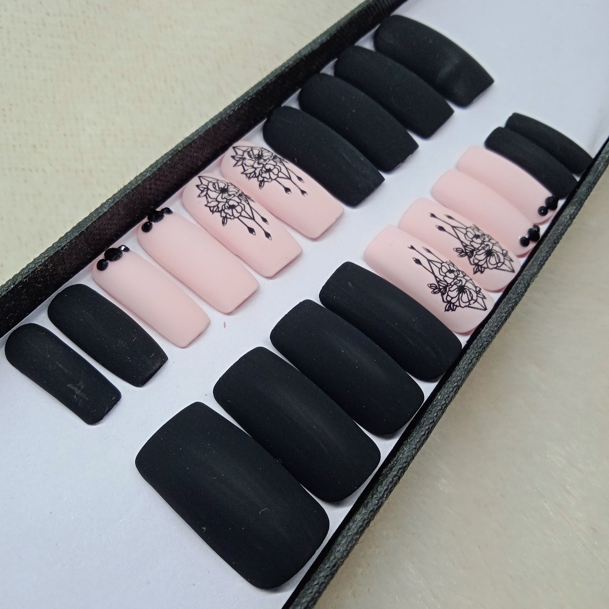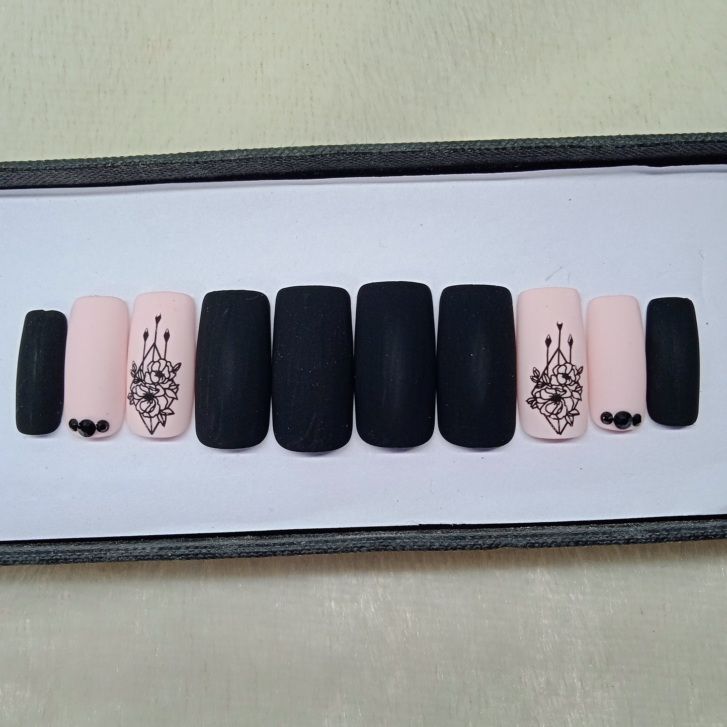 Matte Black And Light Pink Rhinestone Print Press on Nails Set //897
