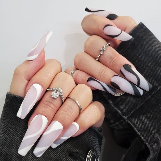Matte Black and White Swirls Press on Fake Nails // tns146