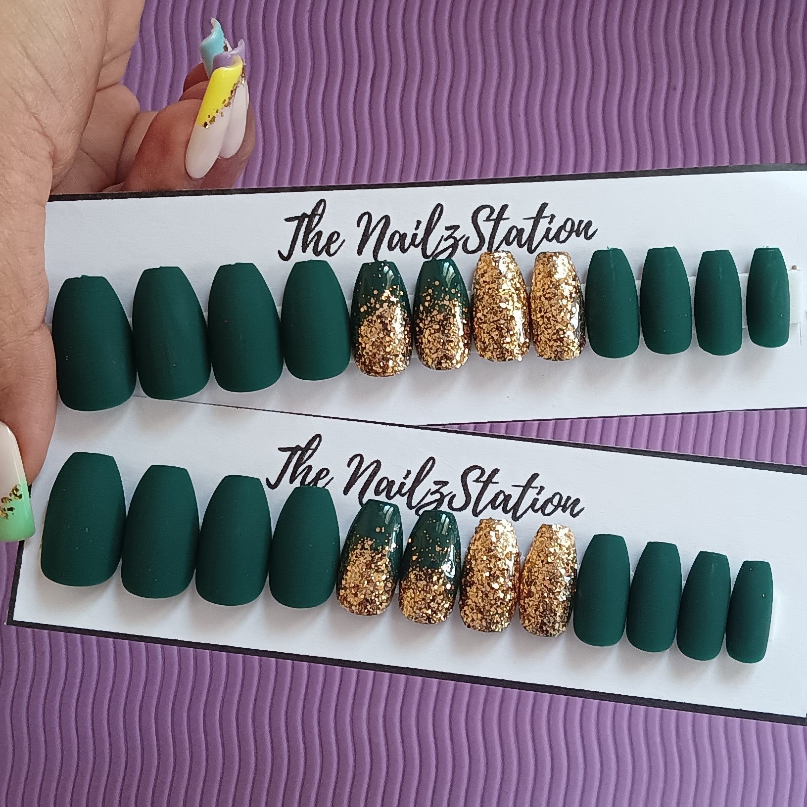 Matte Dark Green Golden Glitter Press on Nails Set (24 nails / Coffin)