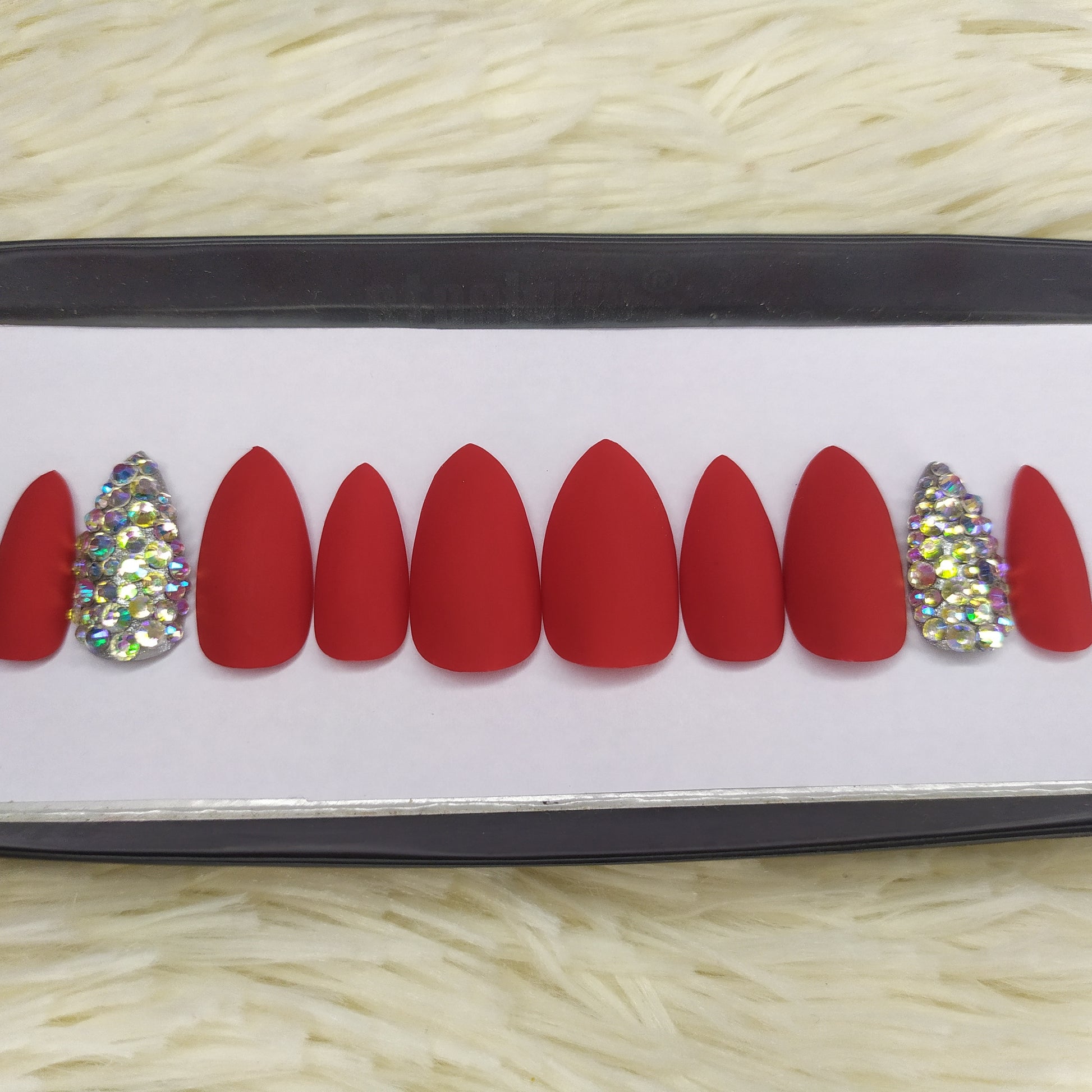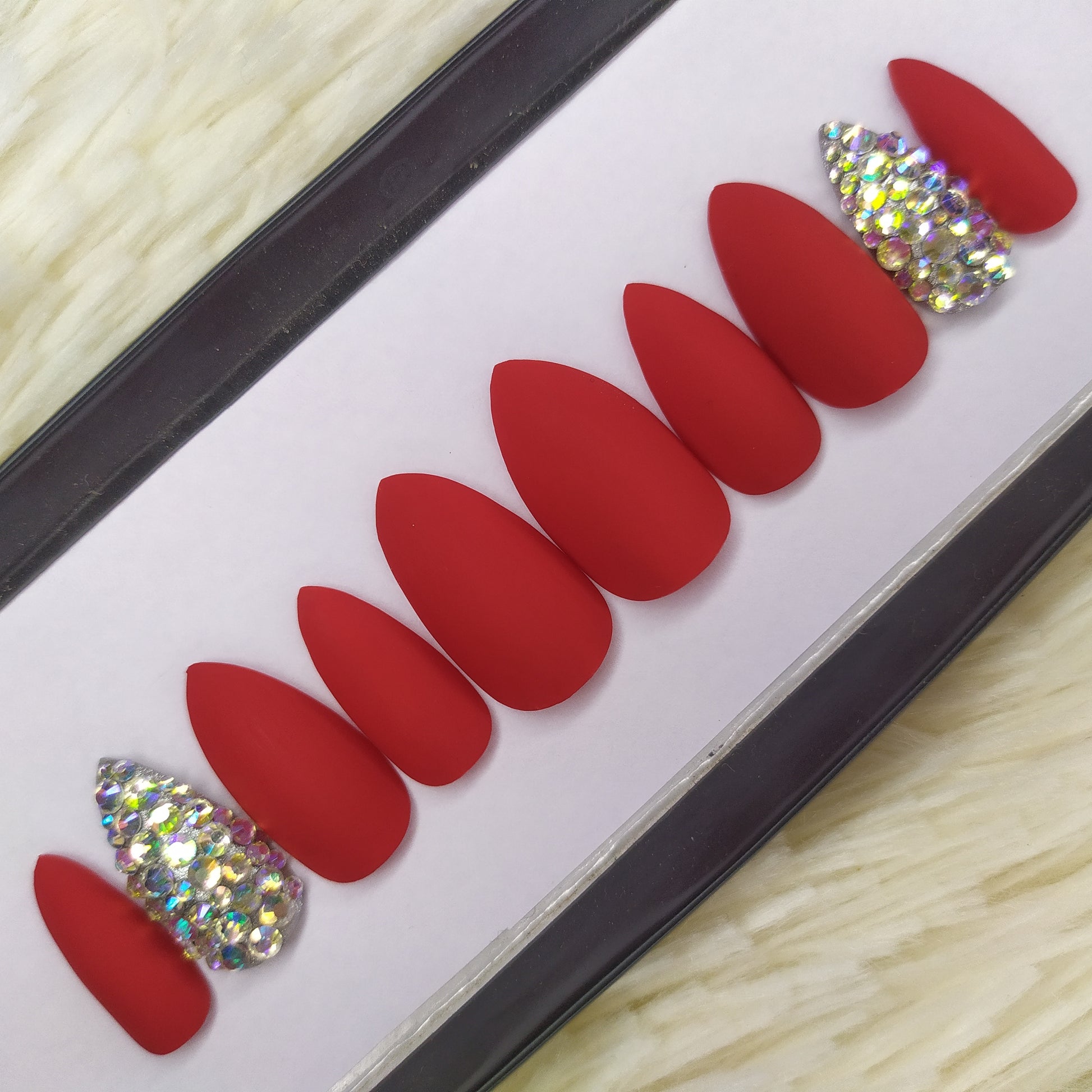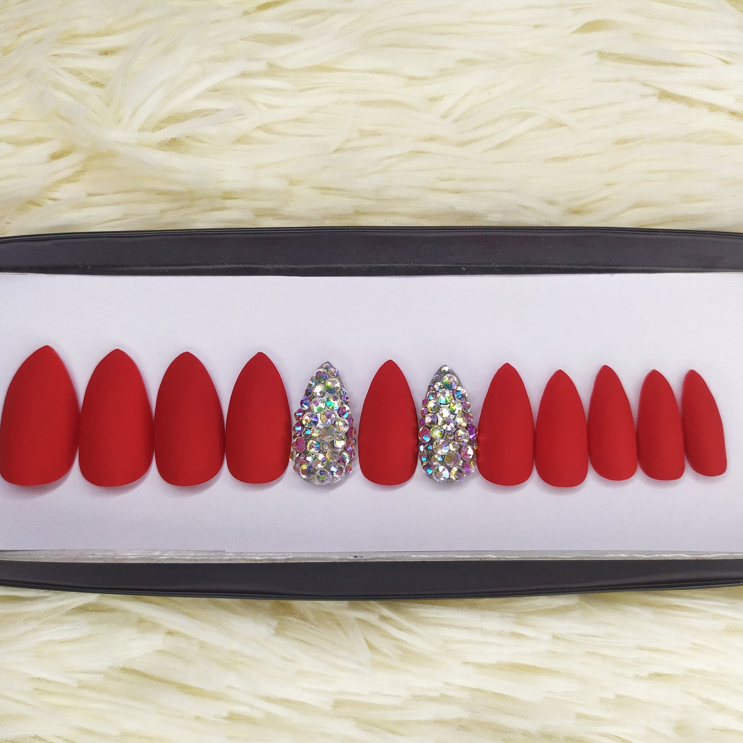 Matte Red with Full Rhinestones Accent Press on Nails Set // 209
