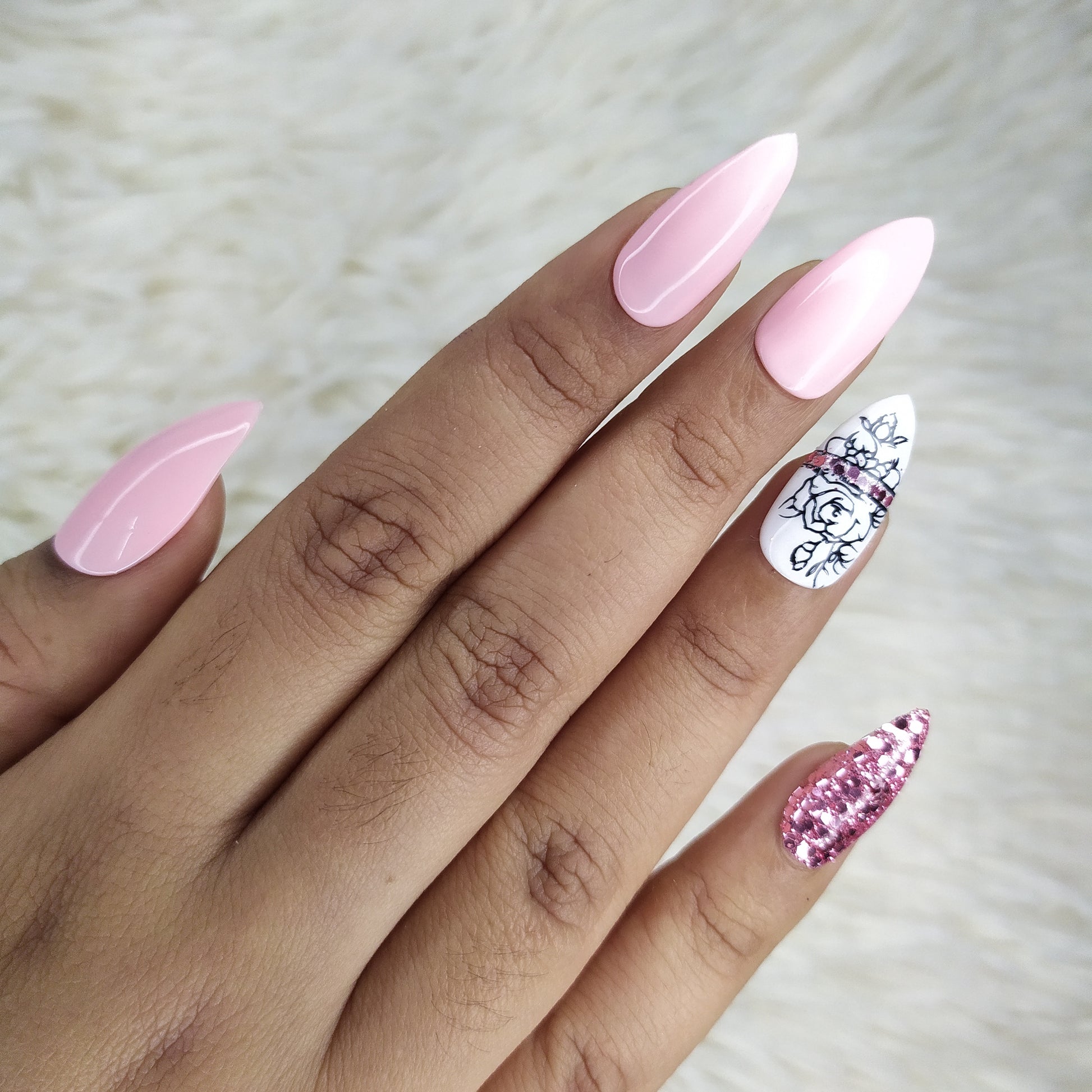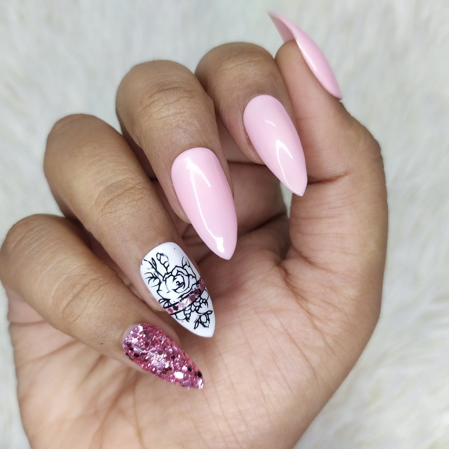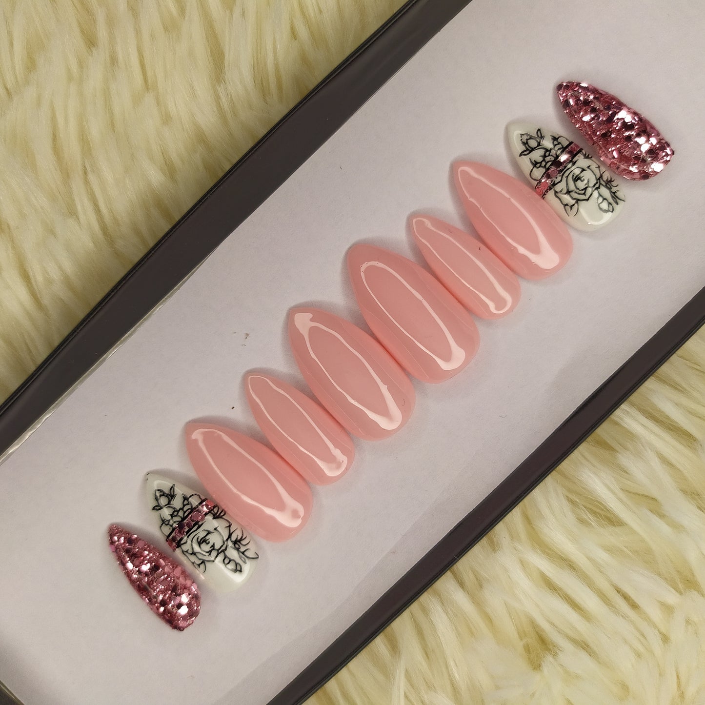 Glossy Light Pink Glitter Printed Press on Nails Set //169
