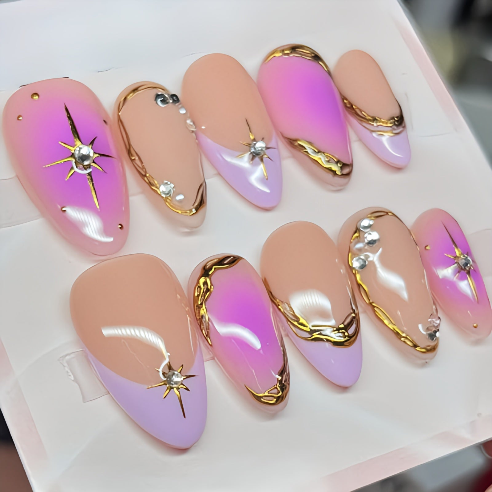 These pretty ombre press on nails blend soft pink and nude with lilac tips, gold chrome edges, and shiny rhinestones. Star charms add a dreamy, designer look. Comes in a set of 20 reusable nails with a complete glue kit. Easy to apply, perfect for weddings, parties, or everyday glam.
