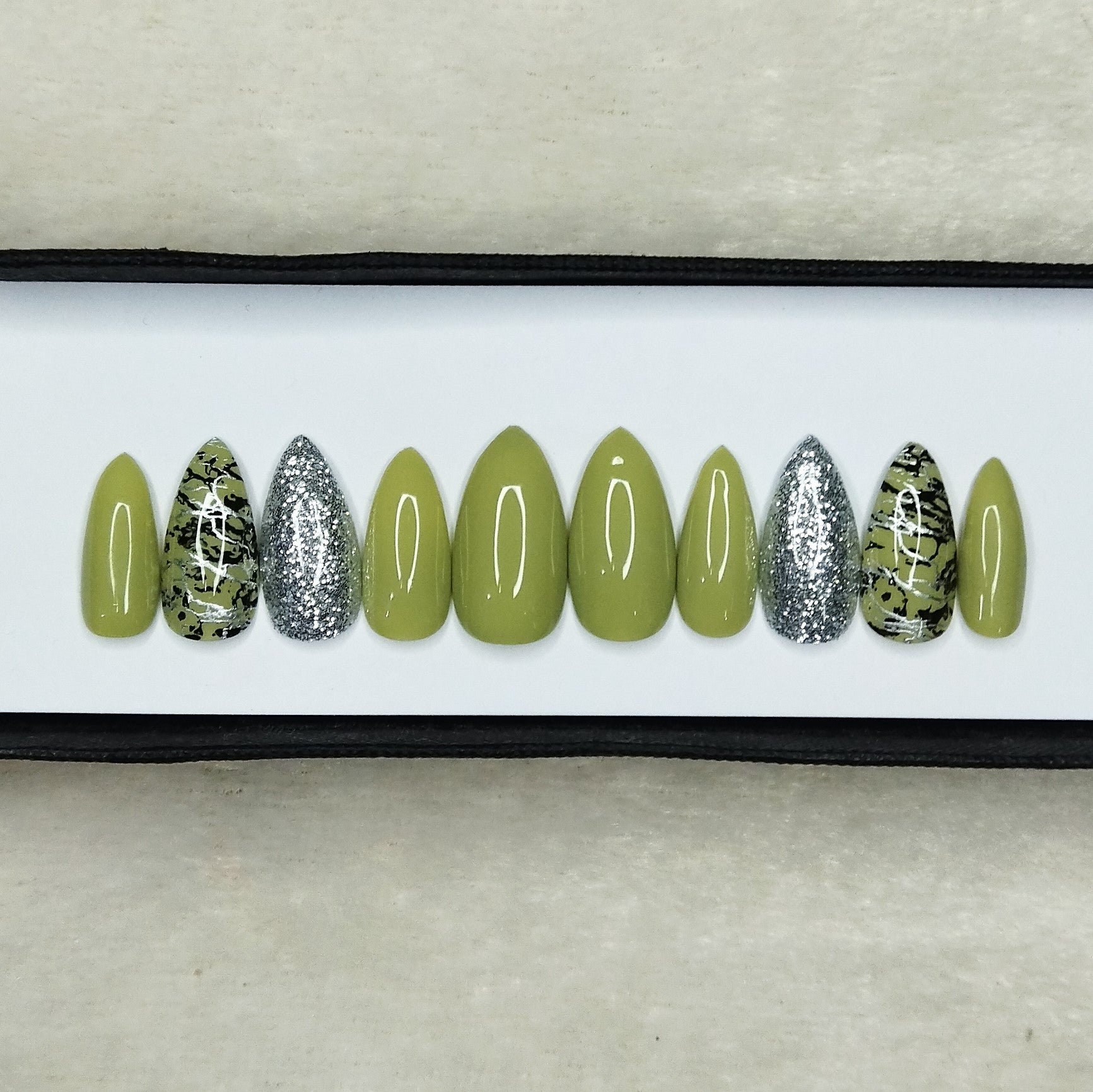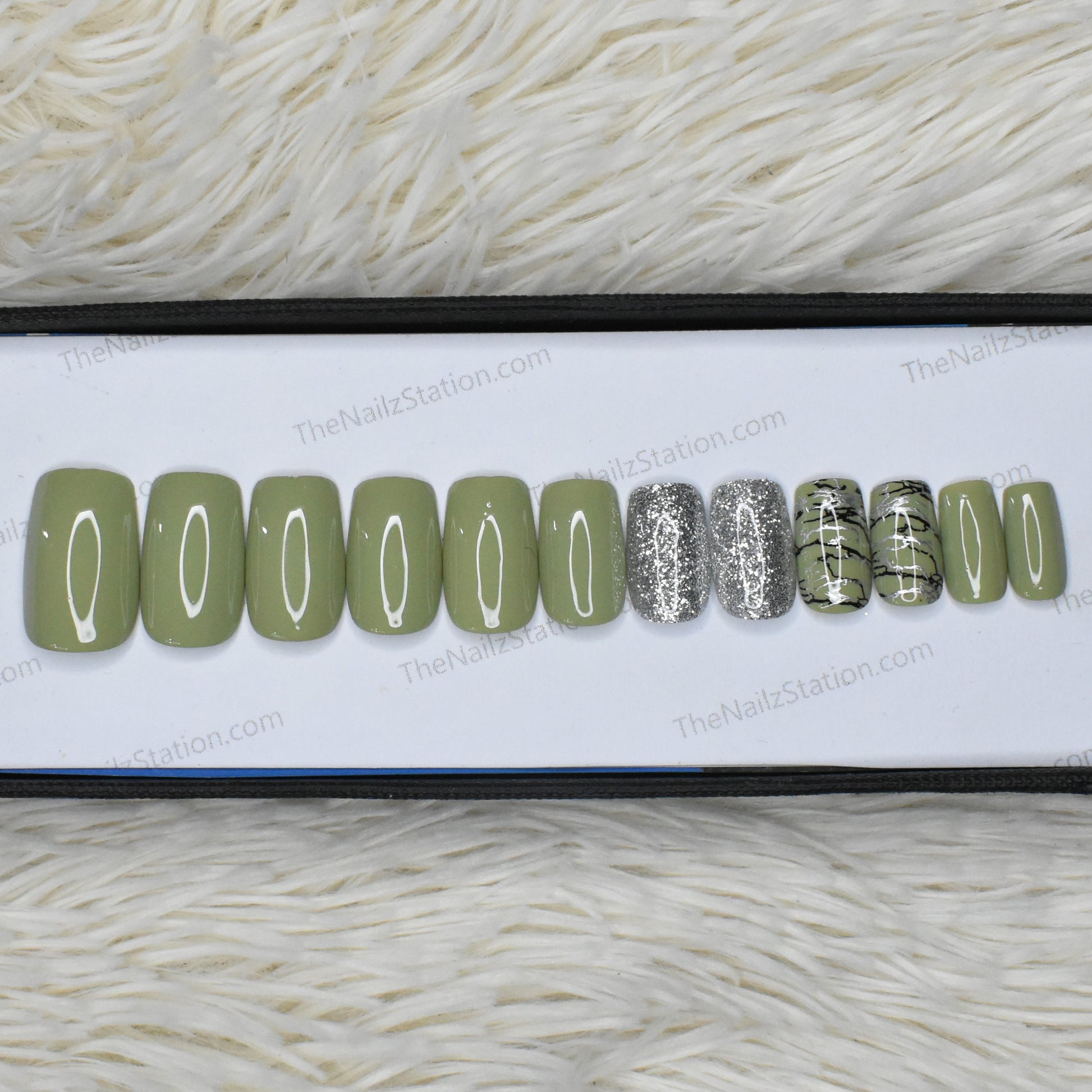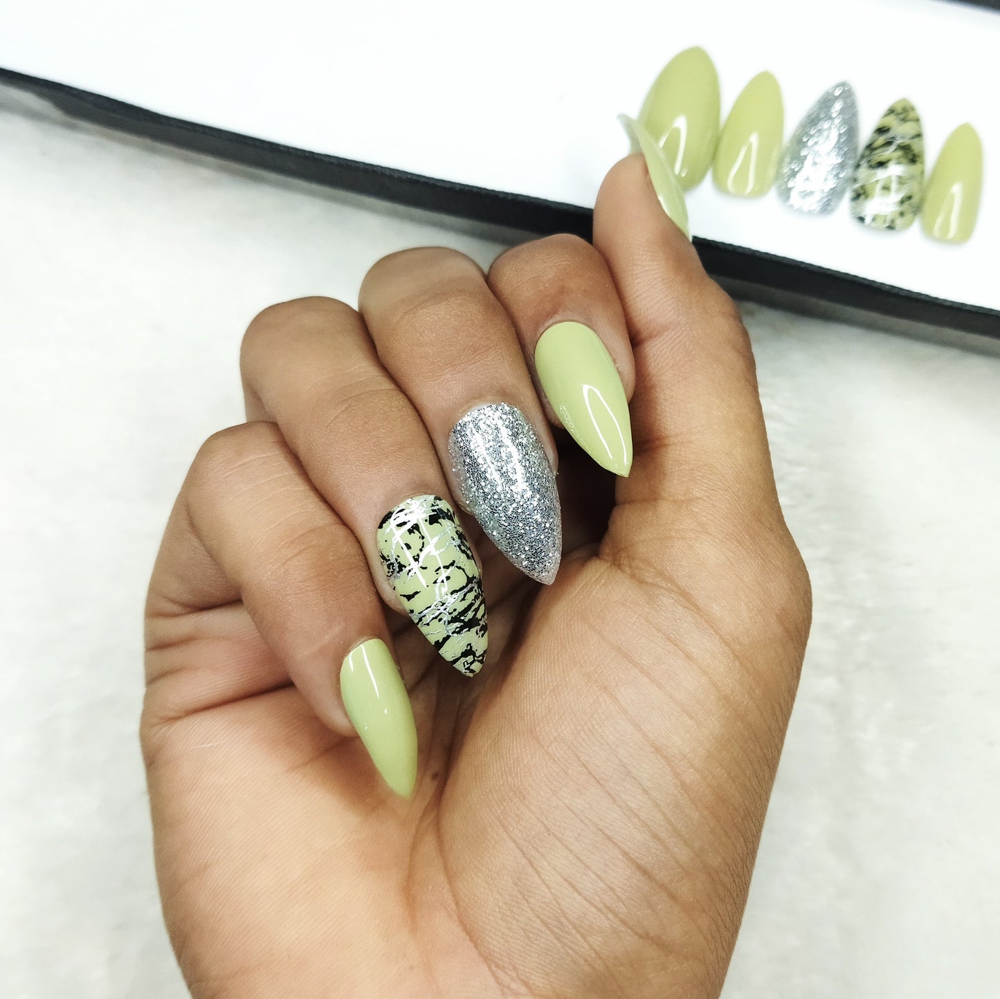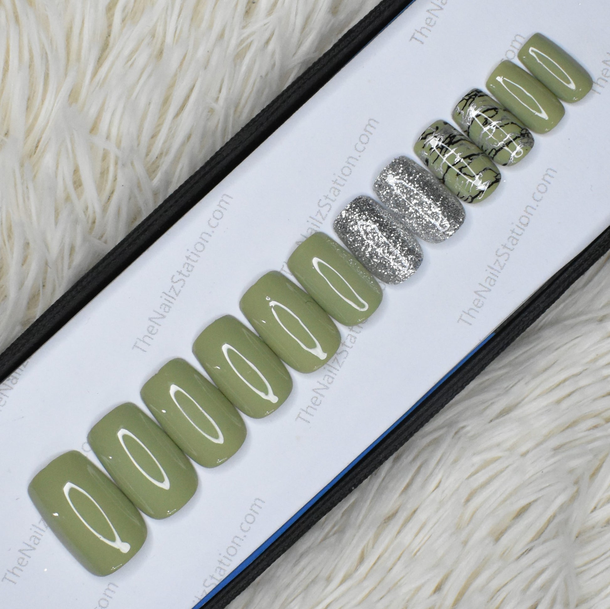 Light Green Marble with Silver Glitter Press on Nails // 116