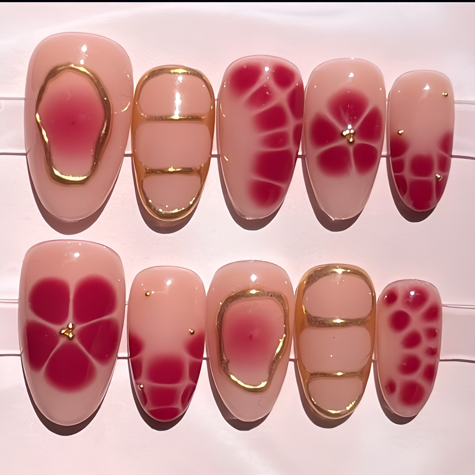 These beautiful pink press-on nails feature a soft rose base with deep red marble and floral designs, finished with elegant gold accents. Perfect for a glam yet artistic look, this set adds a unique charm to every fingertip. Reusable and easy to apply with our full glue kit included.