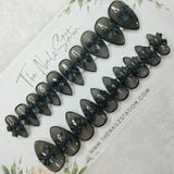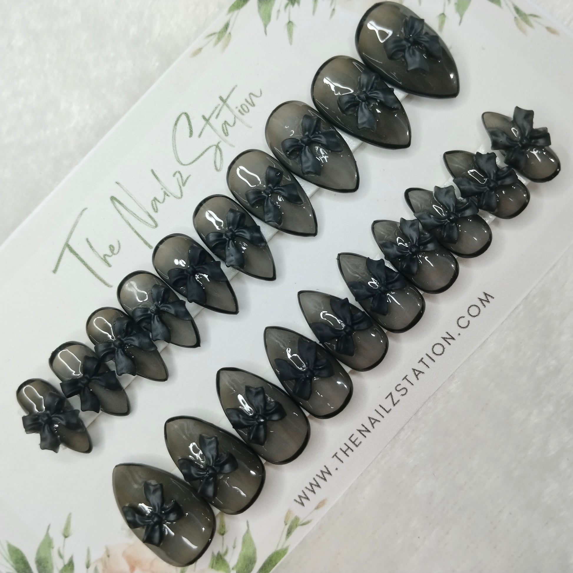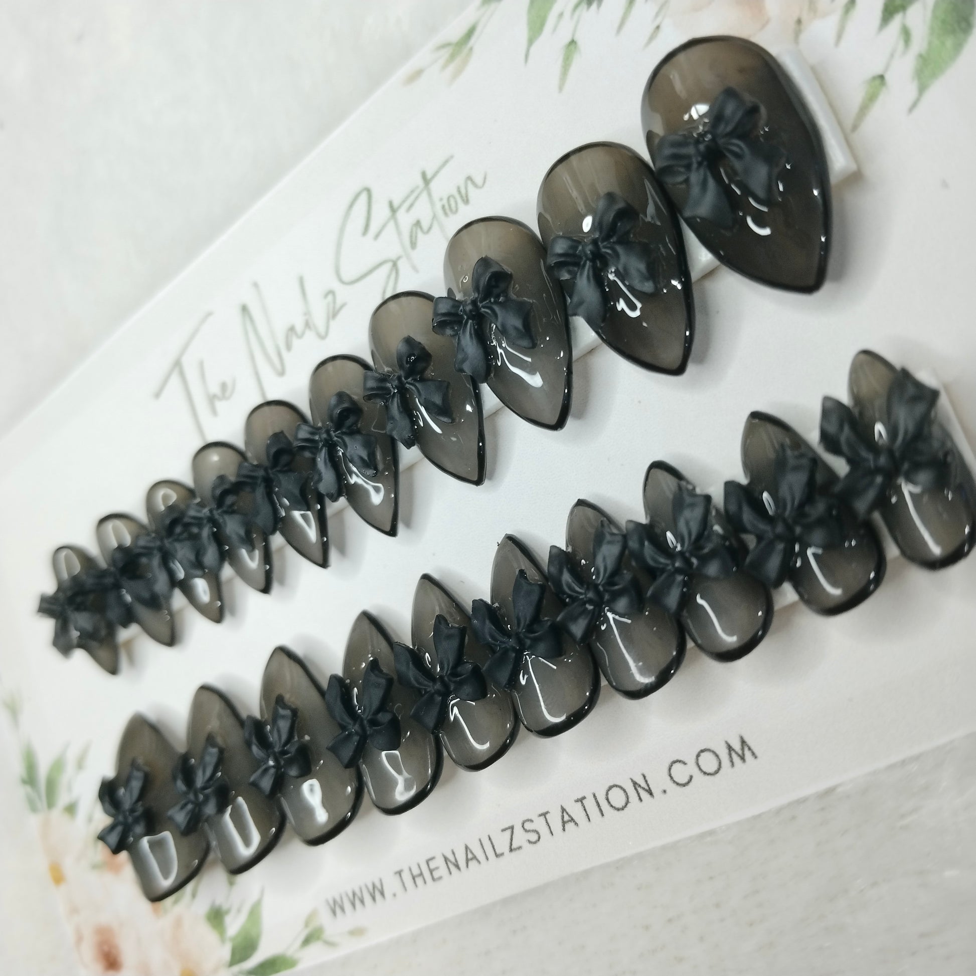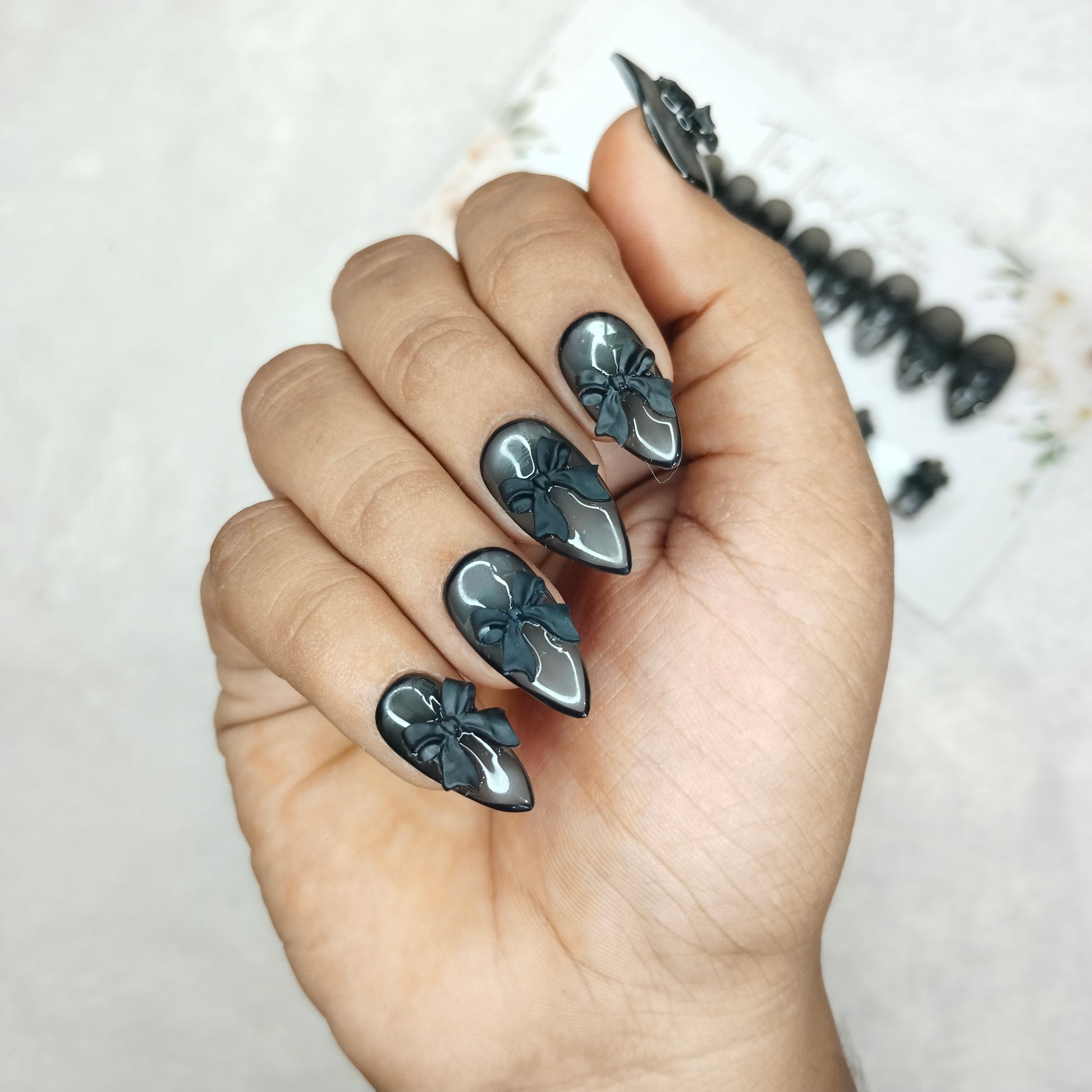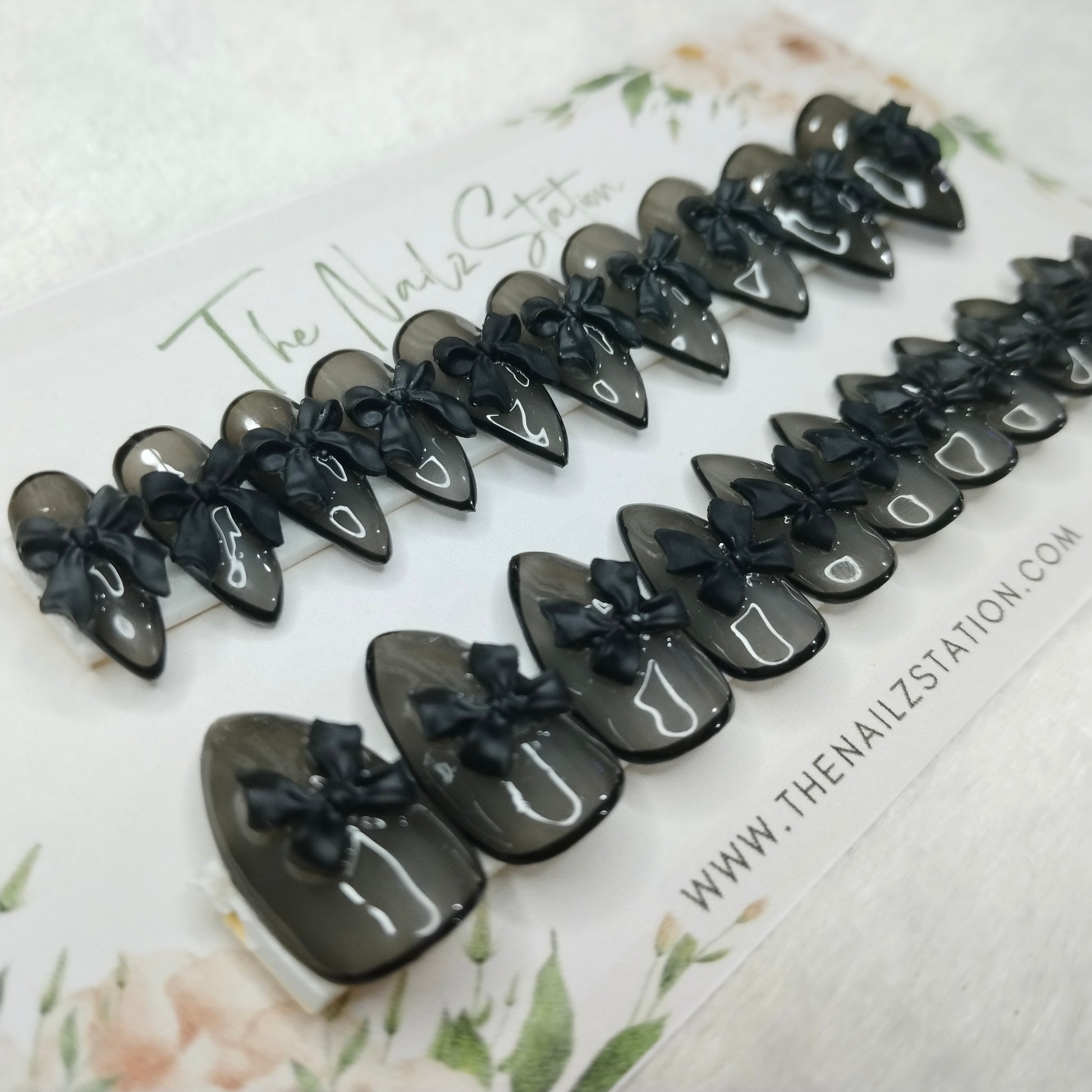 The NailzStation Glossy Black 3D Bow Press on Fake Artificial Nails Set with glue, filer, sticker application kit // 1398