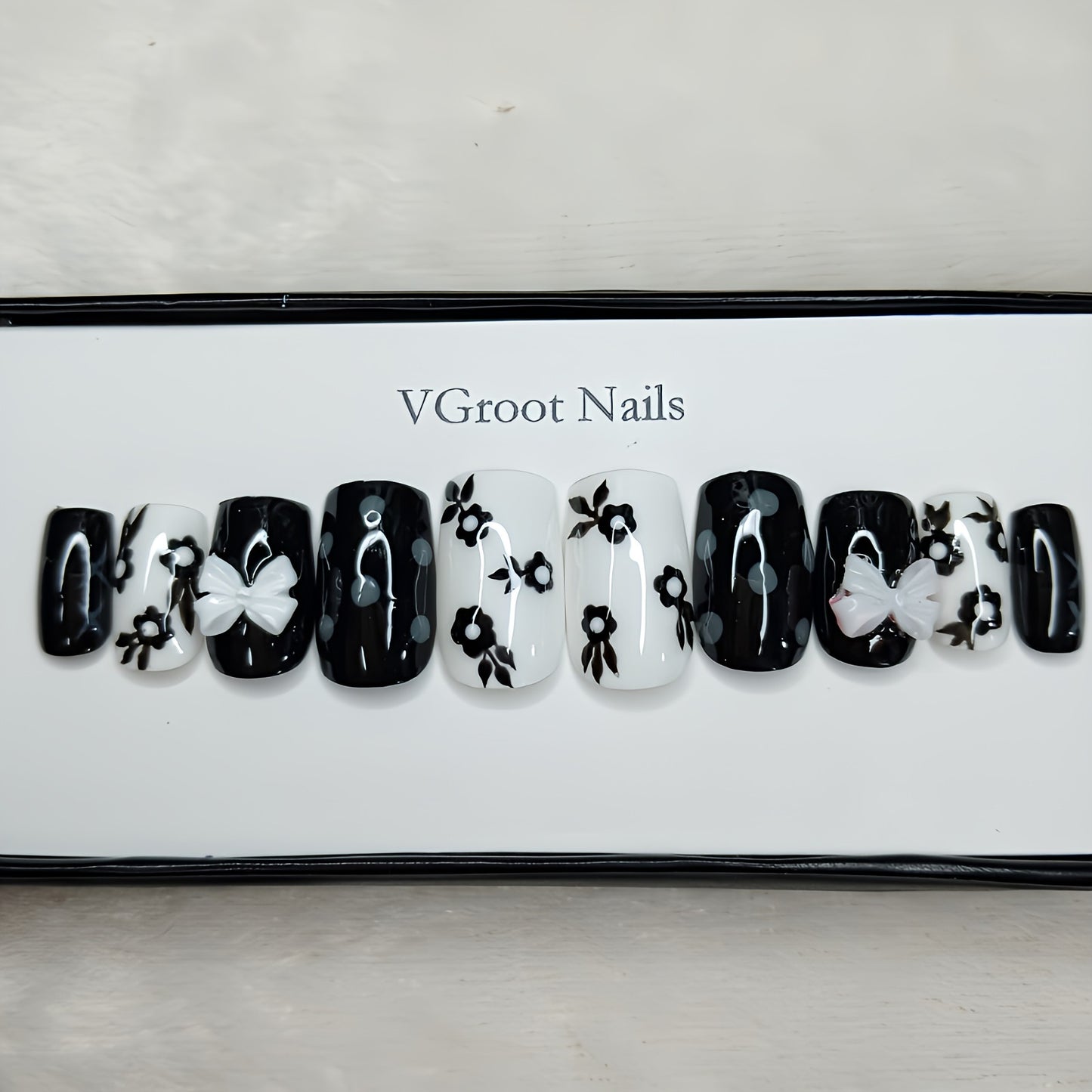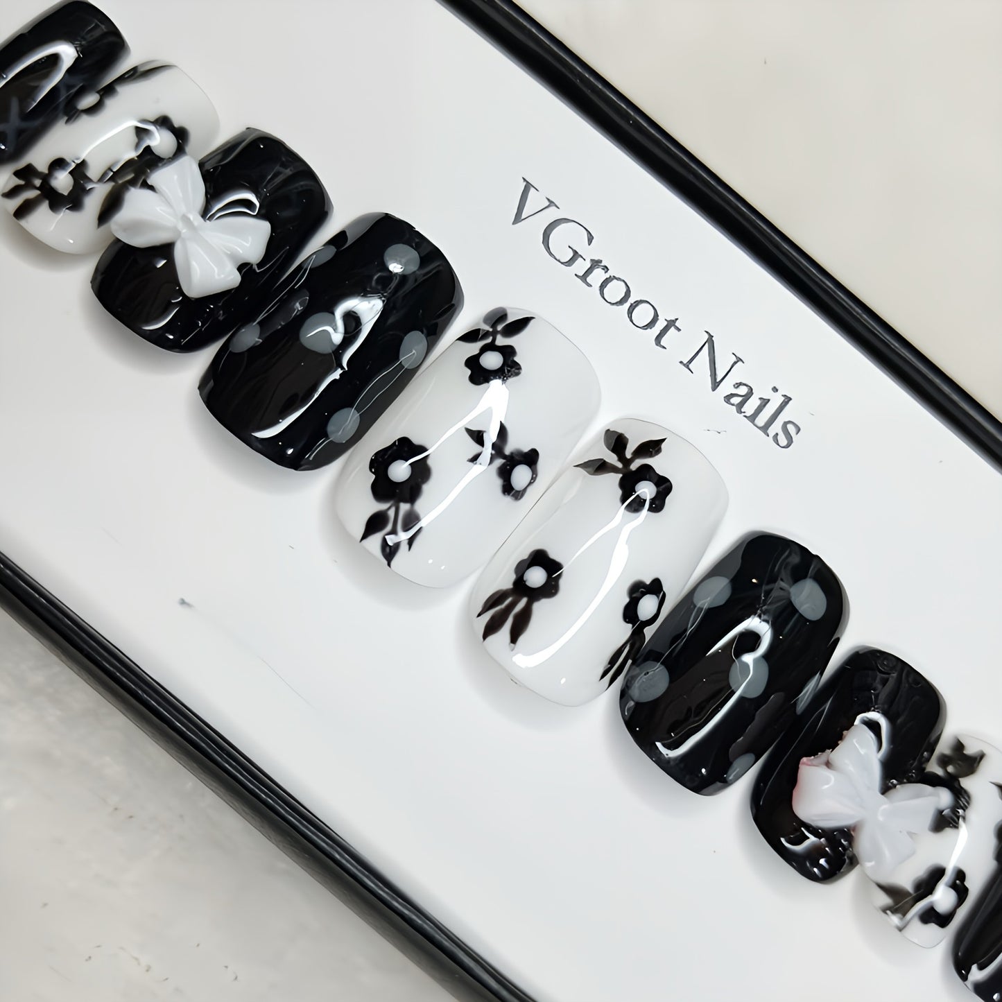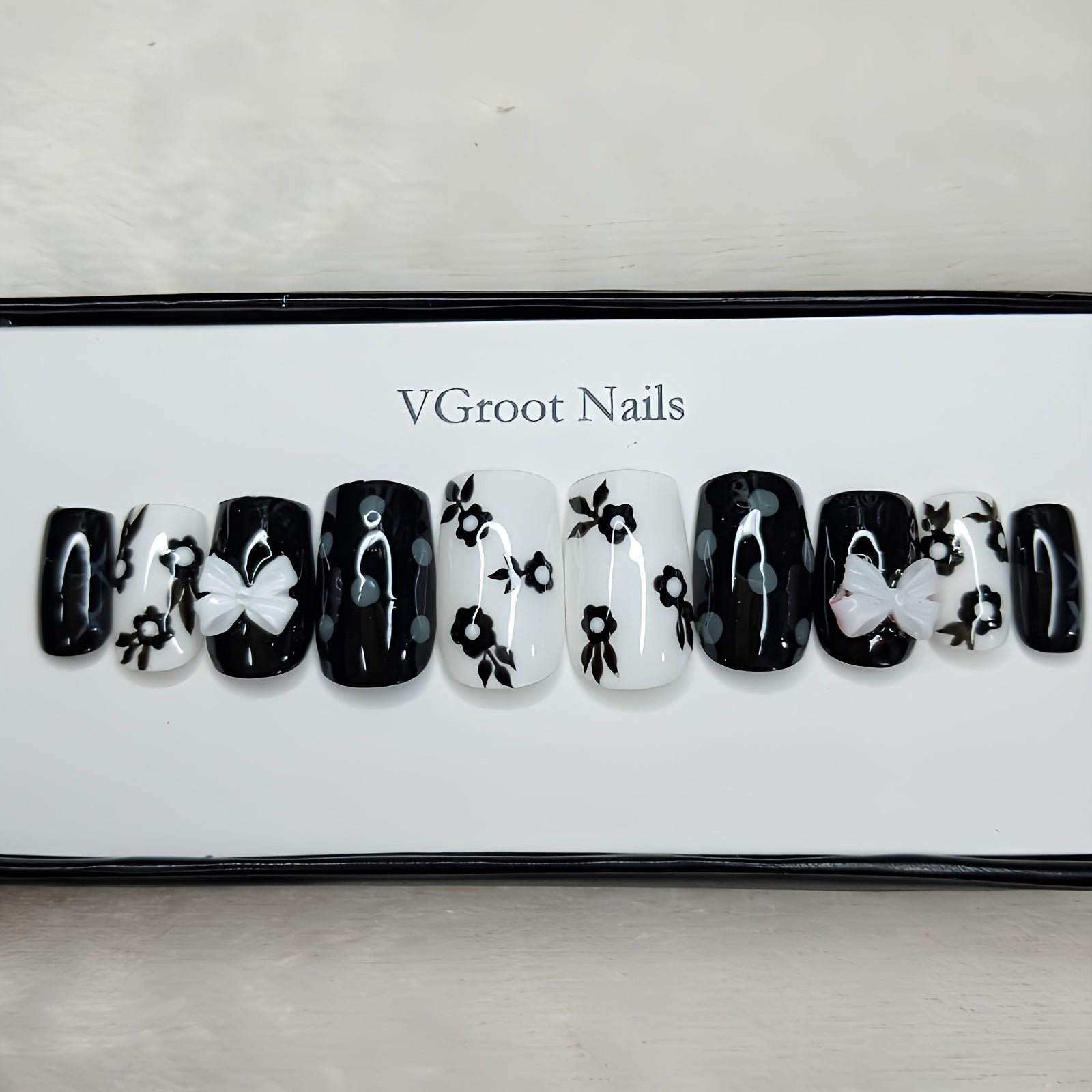 The NailzStation Glossy Black and White 3D Floral Press on Fake Artificial Nails Set with glue, filer, sticker application kit // 1045