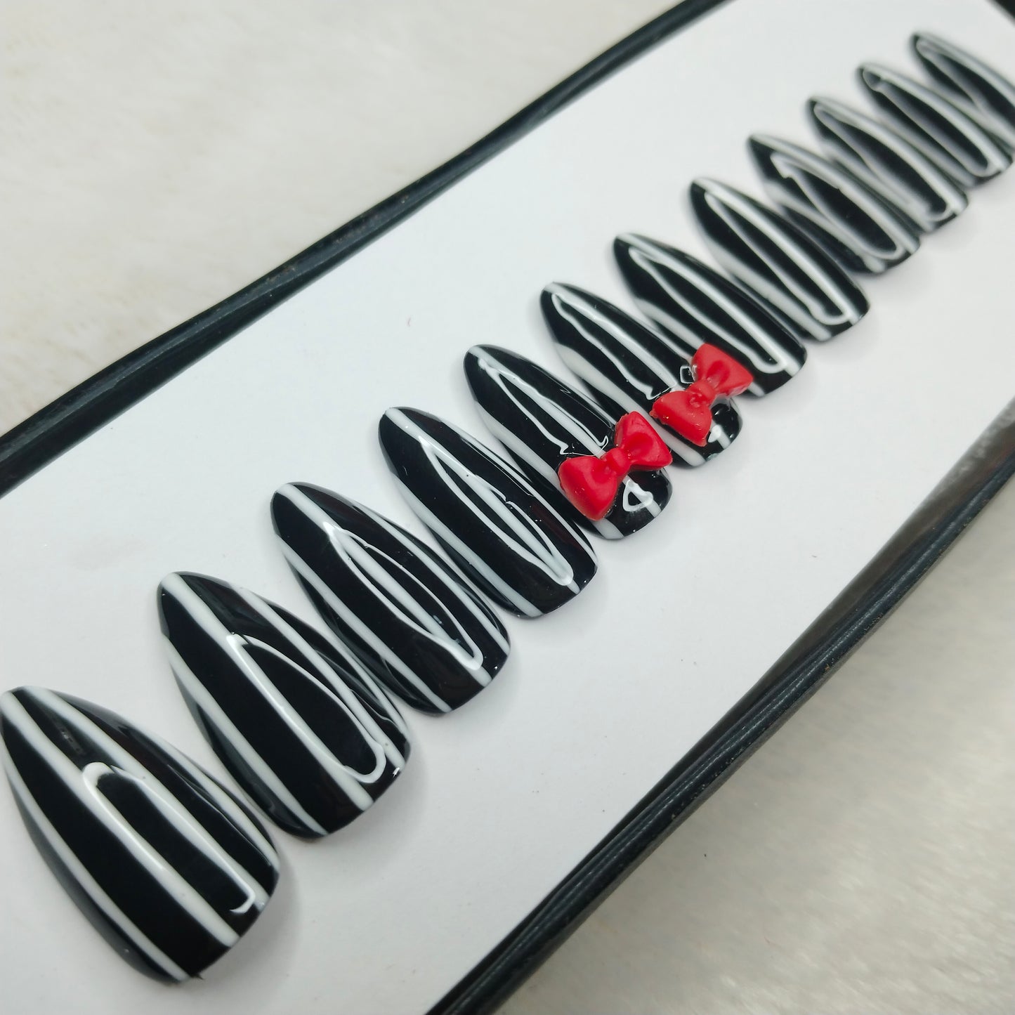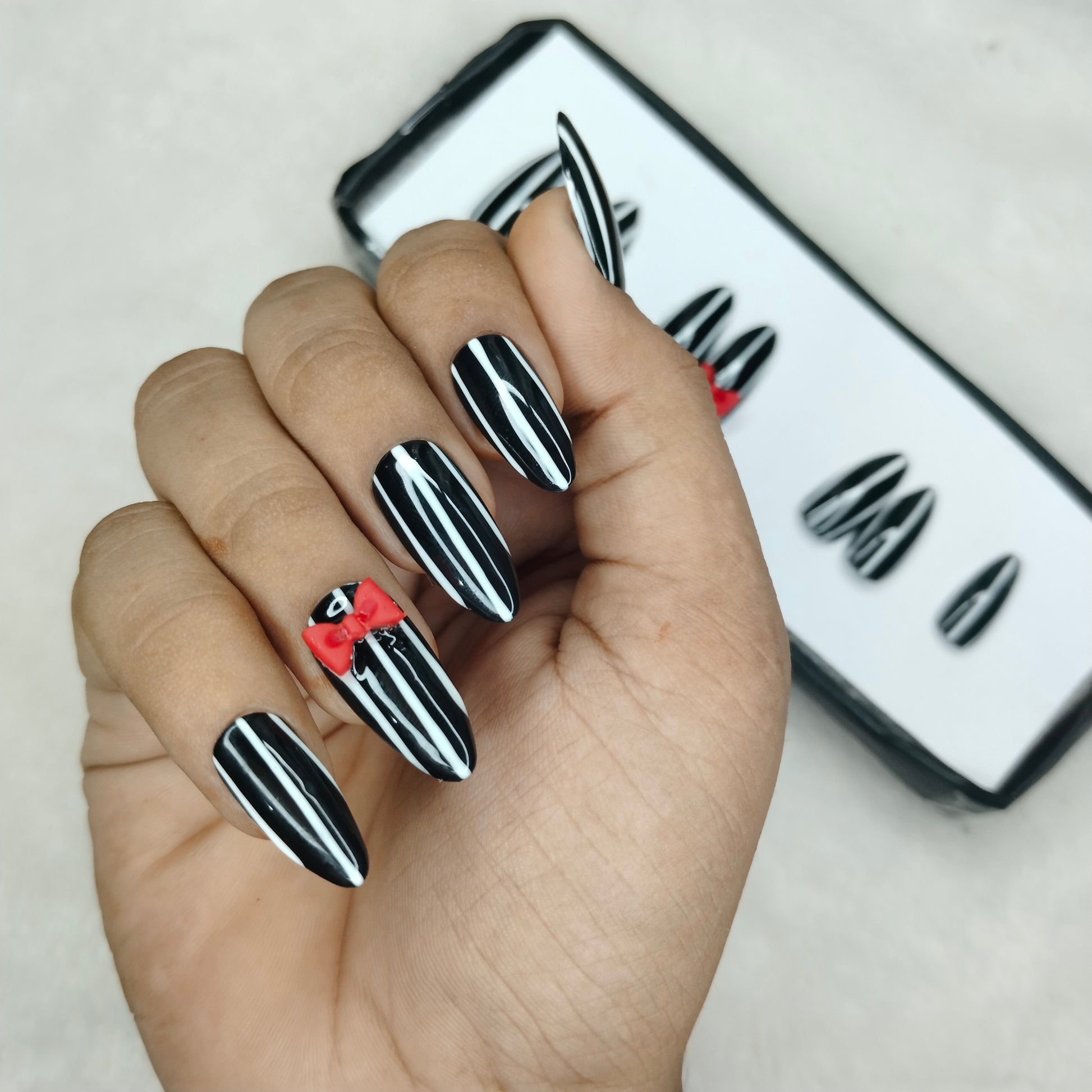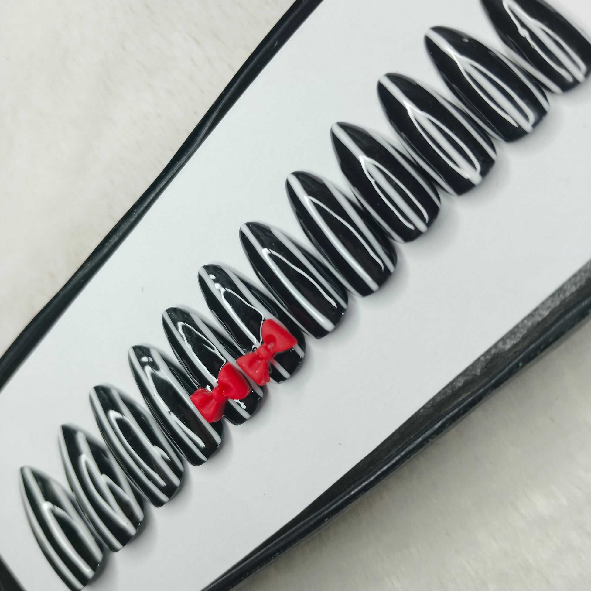 The NailzStation Glossy Black And White 3D Red Bow Press on Fake Artificial Nails Set with glue, filer, sticker application kit // 1426