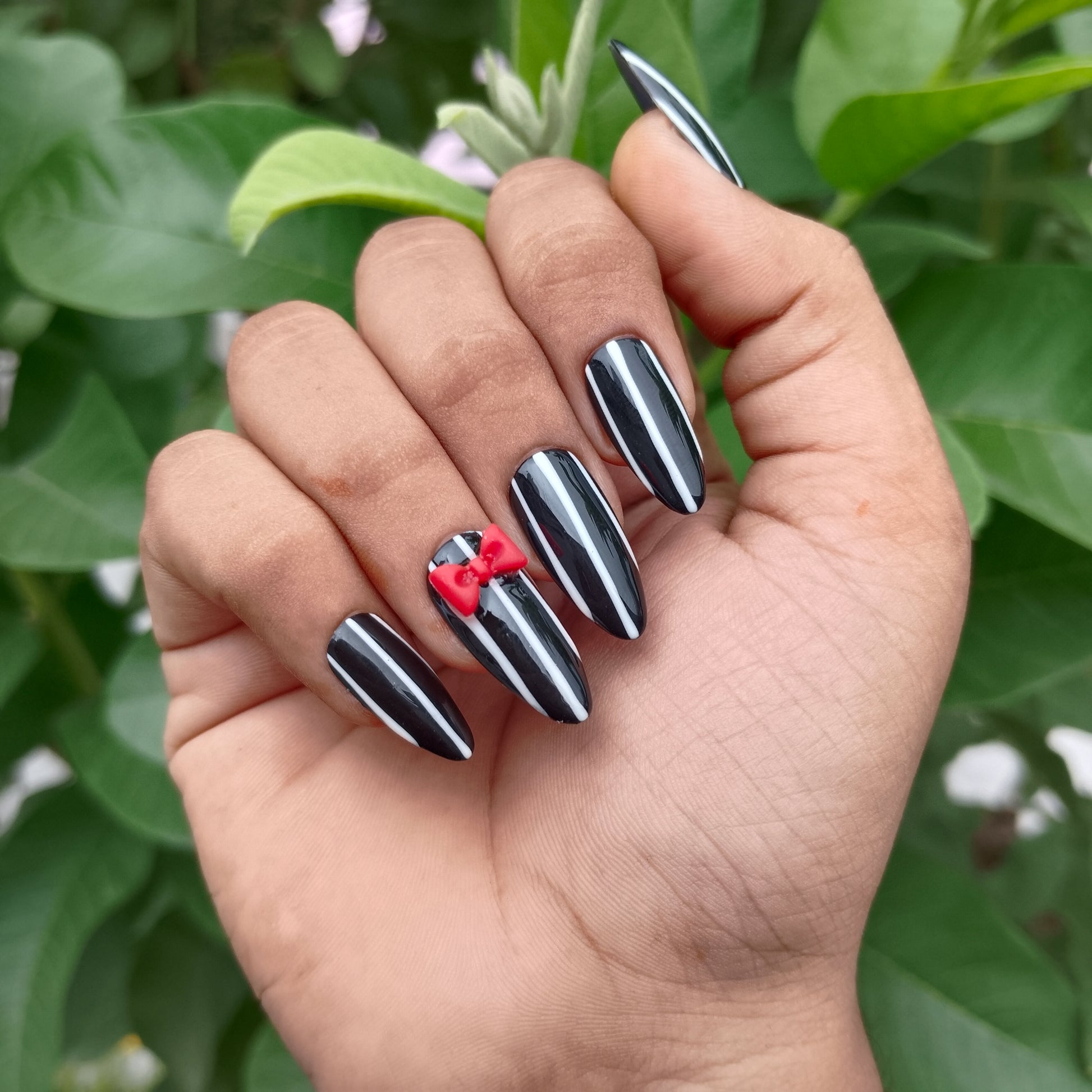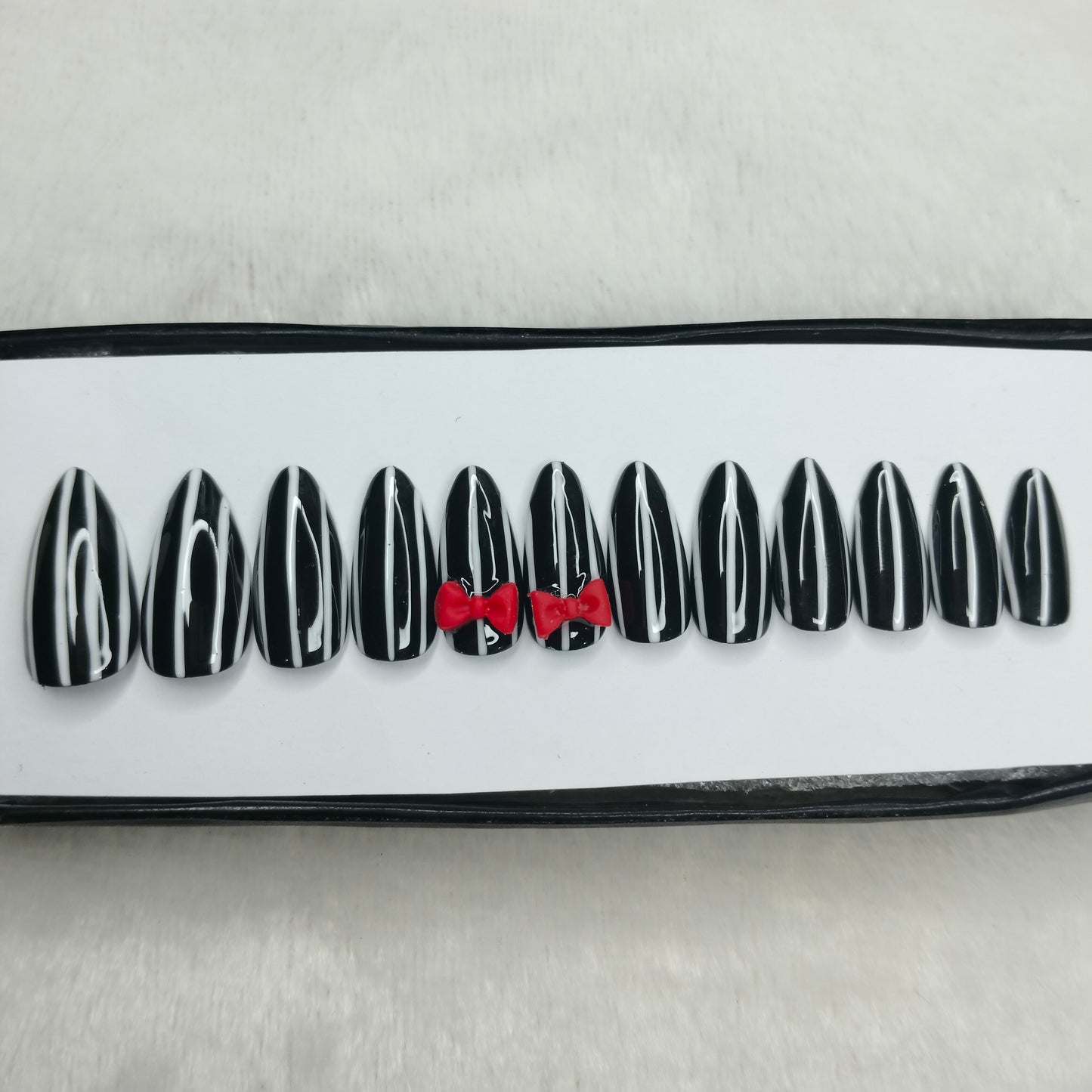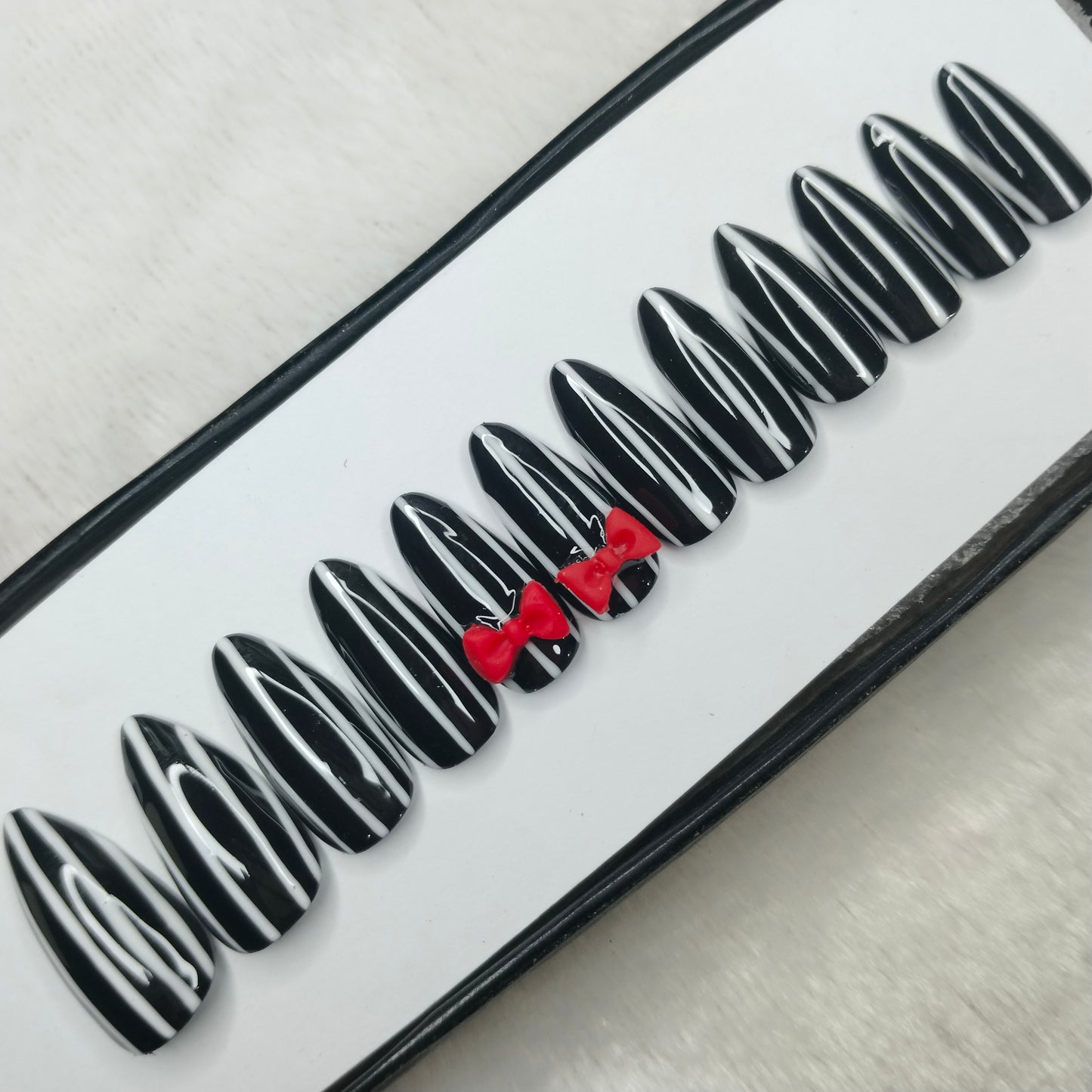 The NailzStation Glossy Black And White 3D Red Bow Press on Fake Artificial Nails Set with glue, filer, sticker application kit // 1426