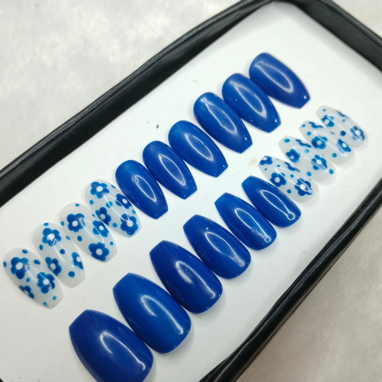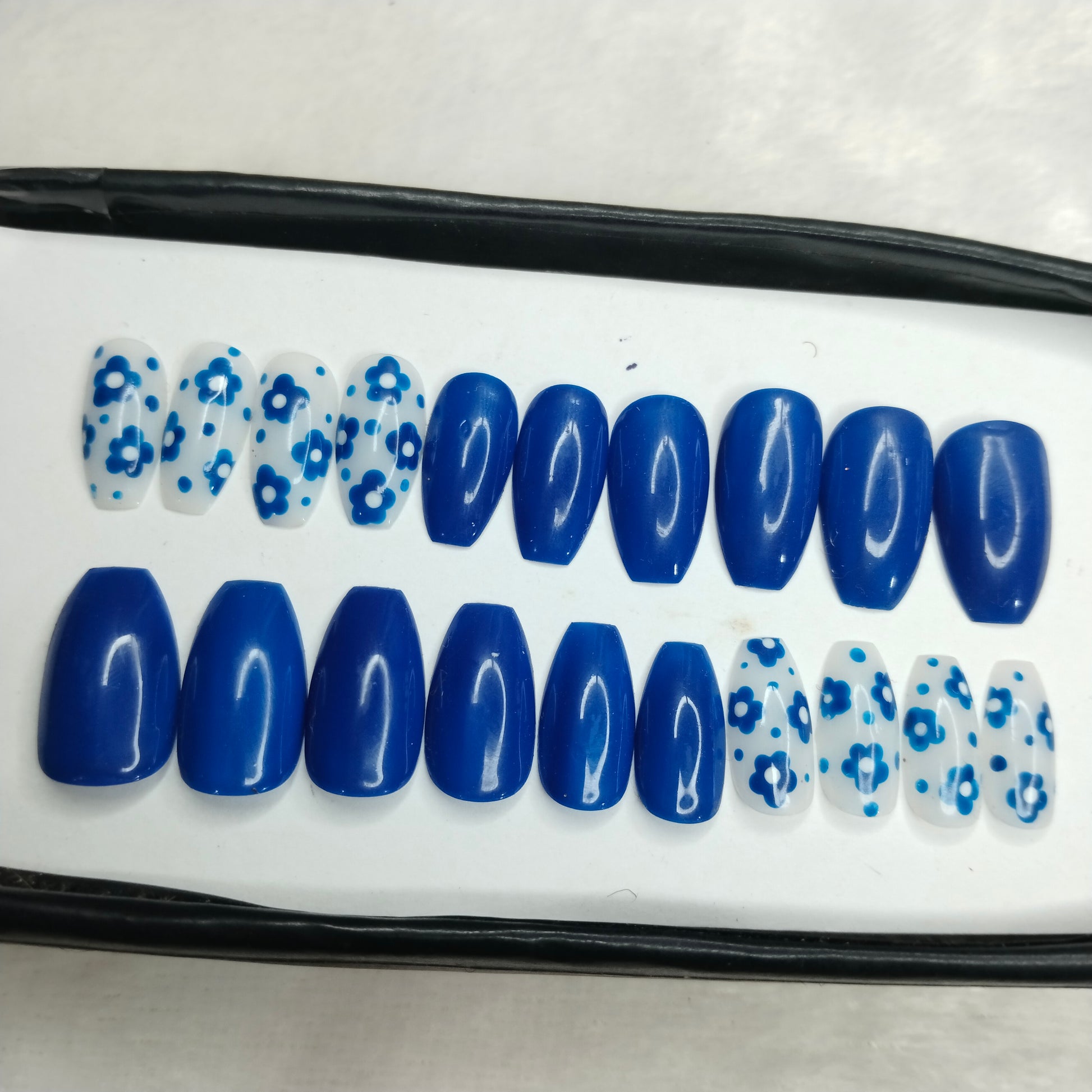 The NailzStation Glossy Blue Floral Press on Fake Artificial Nails Set with glue, filer, sticker application kit // 1258