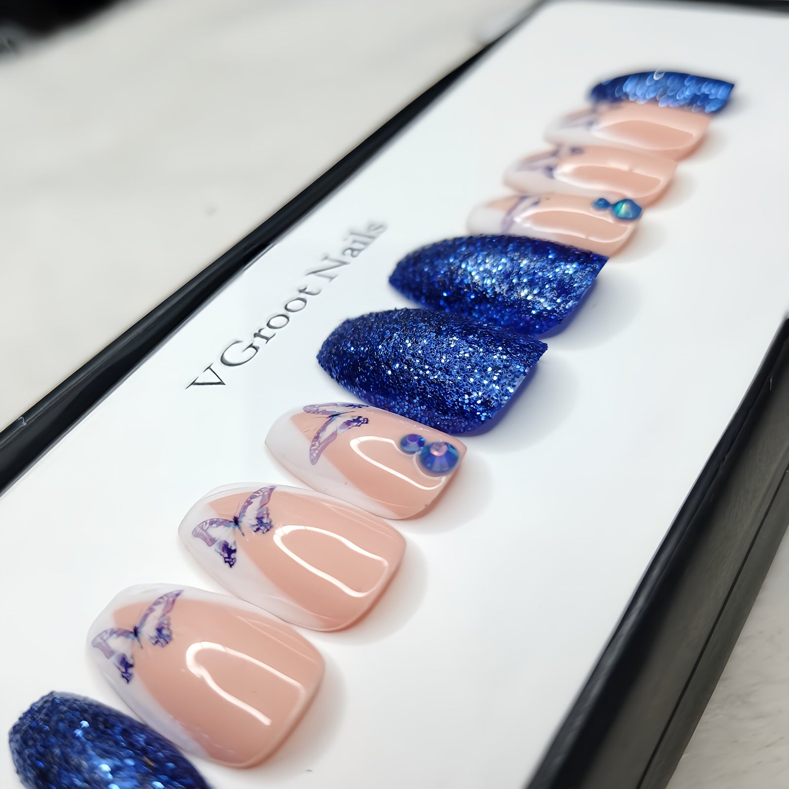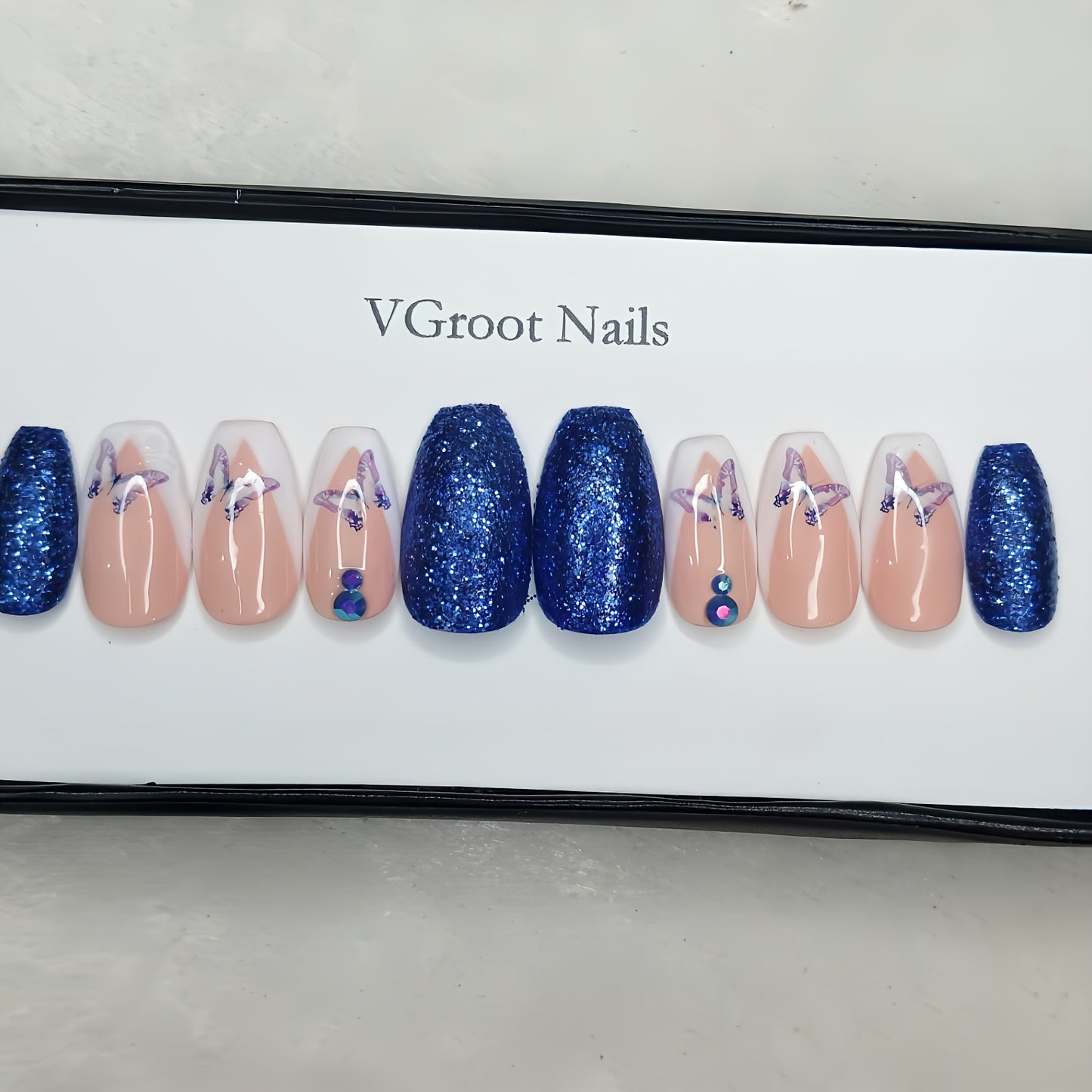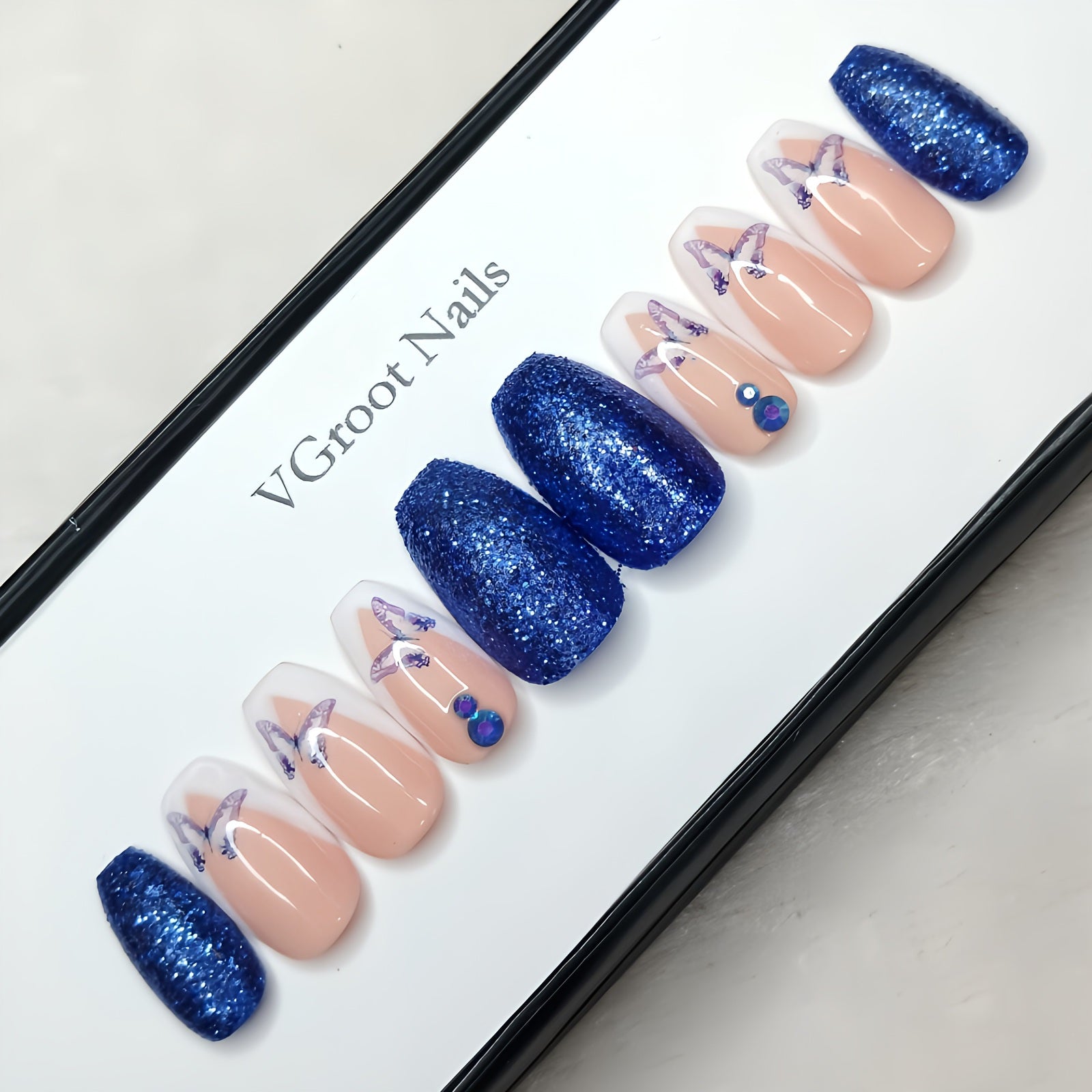 The NailzStation Glossy Blue Glitter Butterflies Press on Fake Artificial Nails Set with glue, filer, sticker application kit // 1030