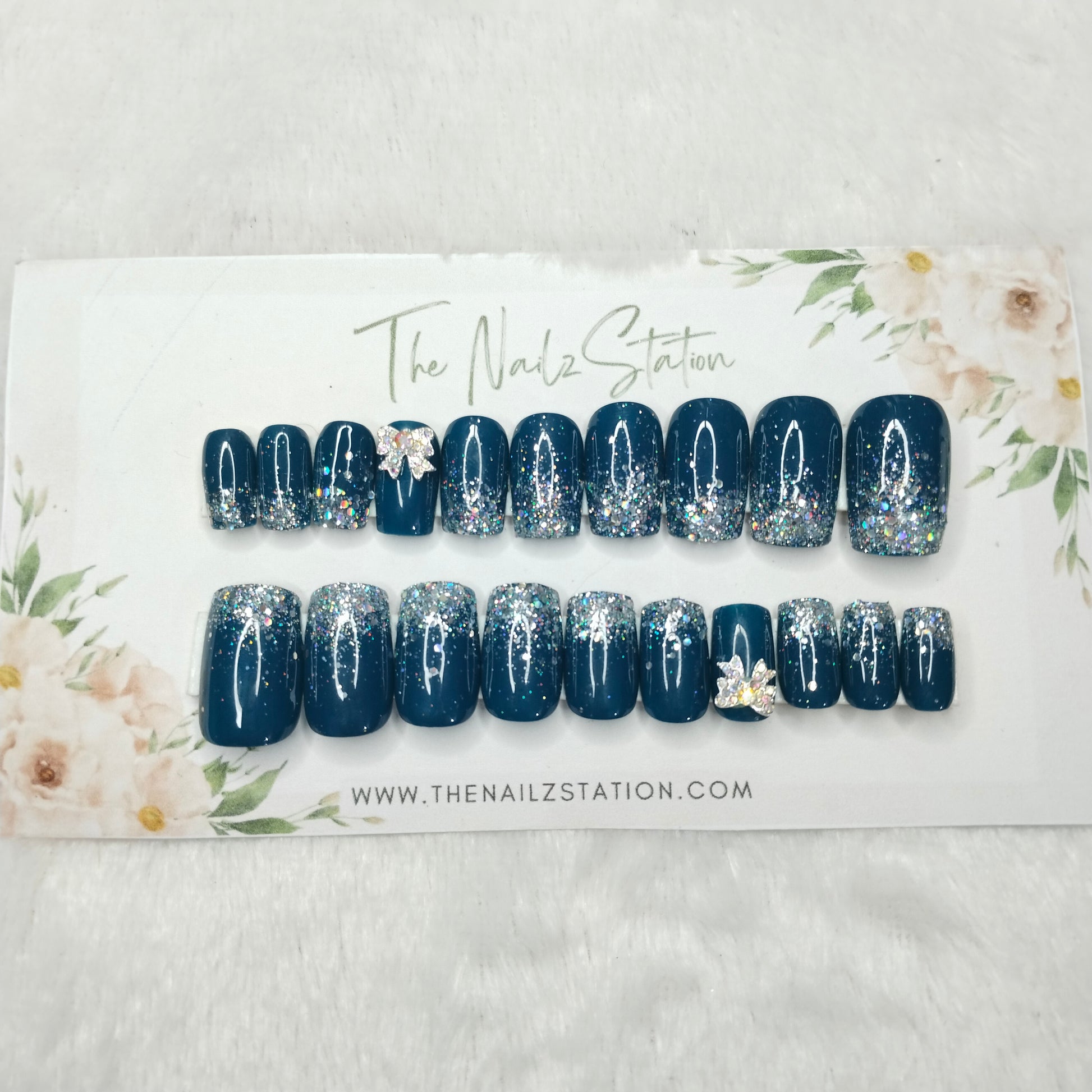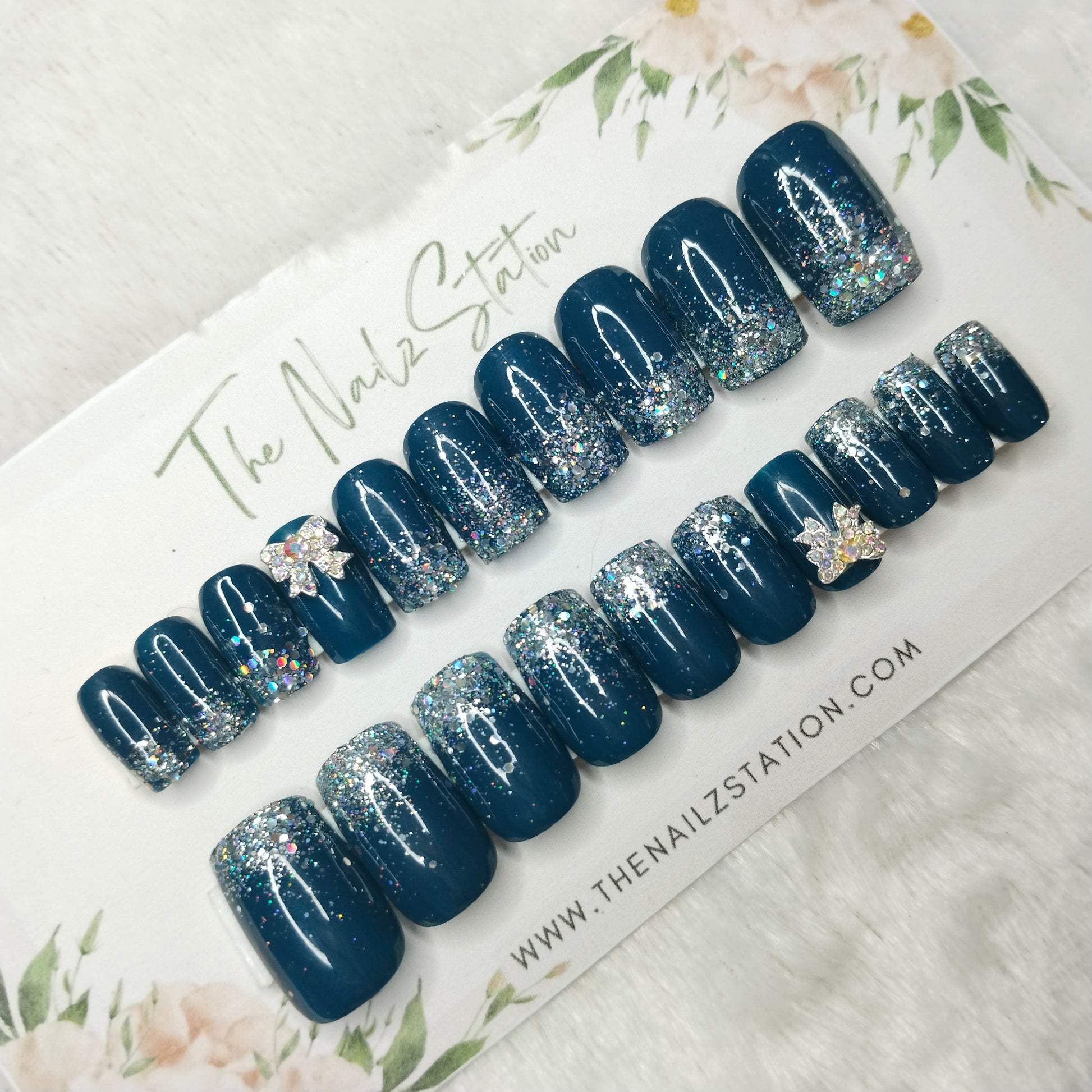 The NailzStation Glossy Blue Glitter Ombre 3D Bow Press on Fake Artificial Nails Set with glue, filer, sticker application kit // 1443