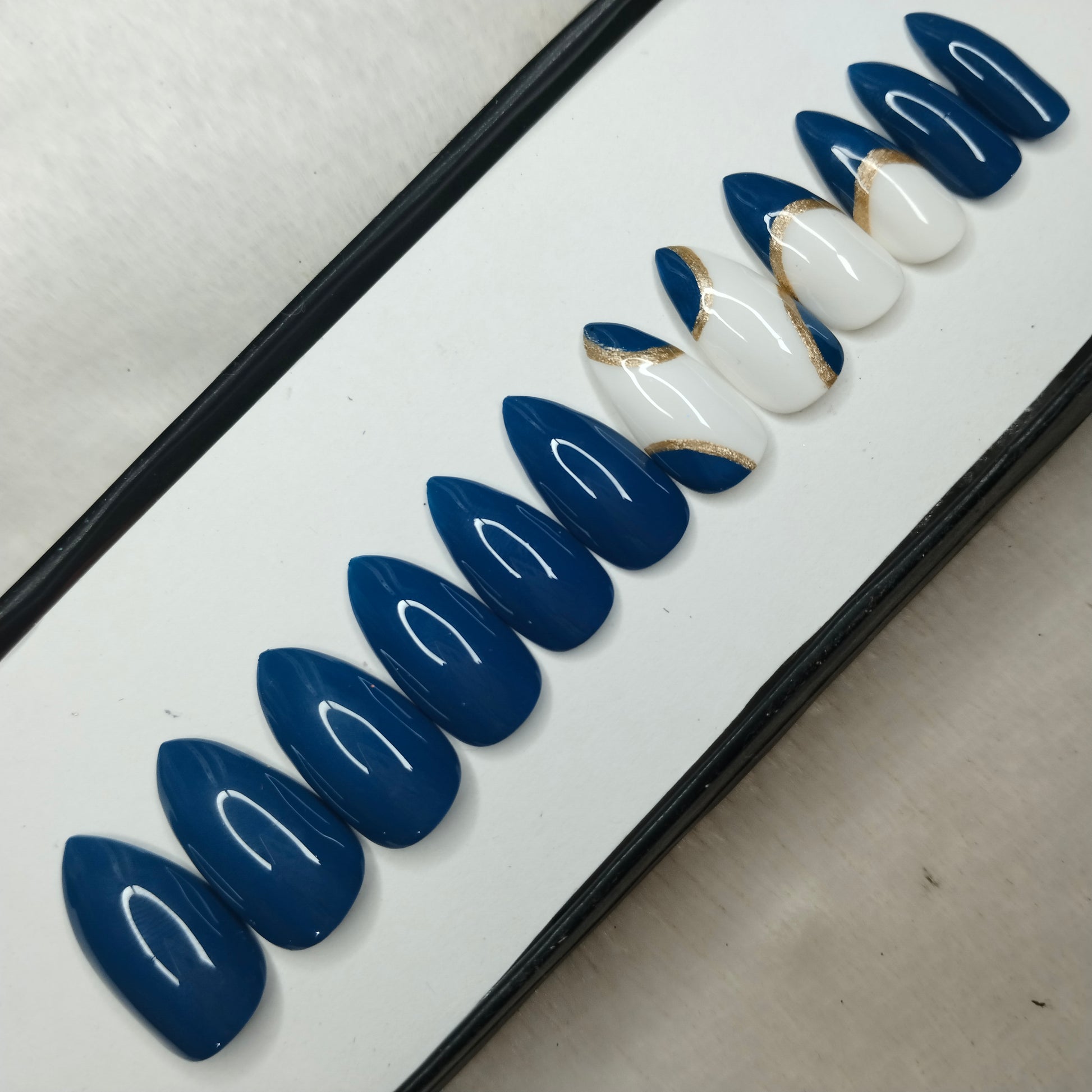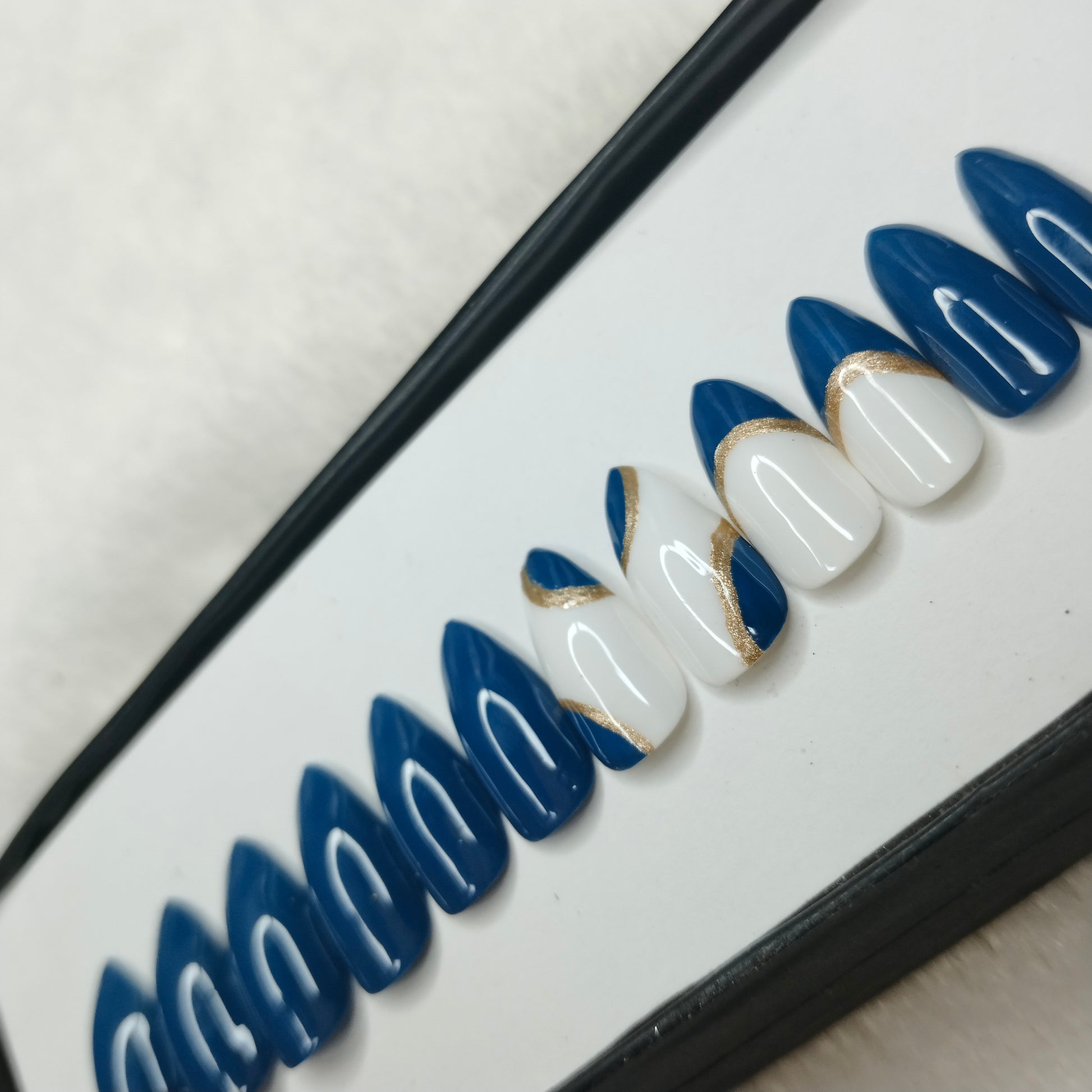 The NailzStation Glossy Blue Swirls Press on Fake Artificial Nails Set with glue, filer, sticker application kit // 1223