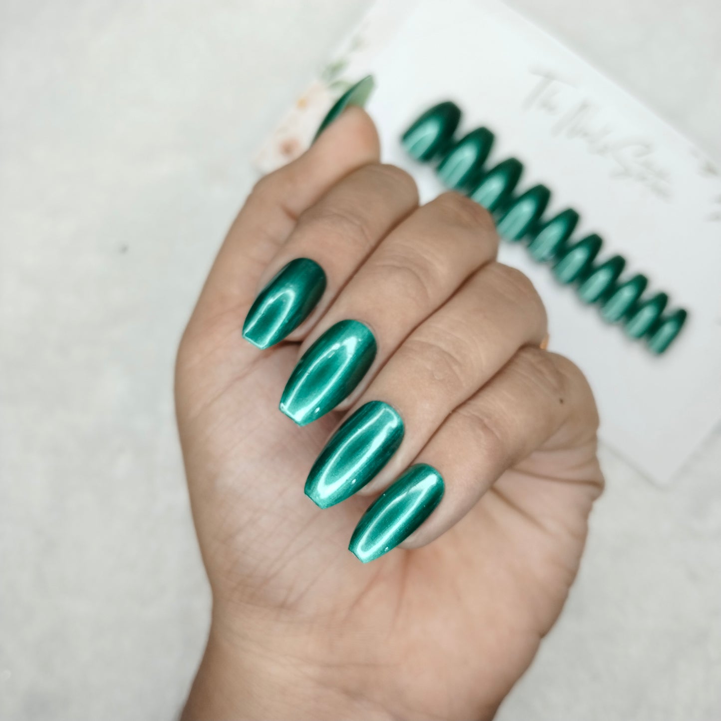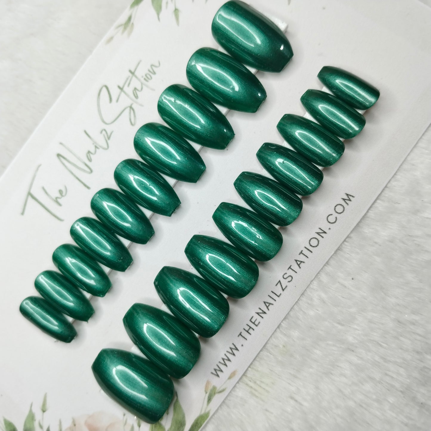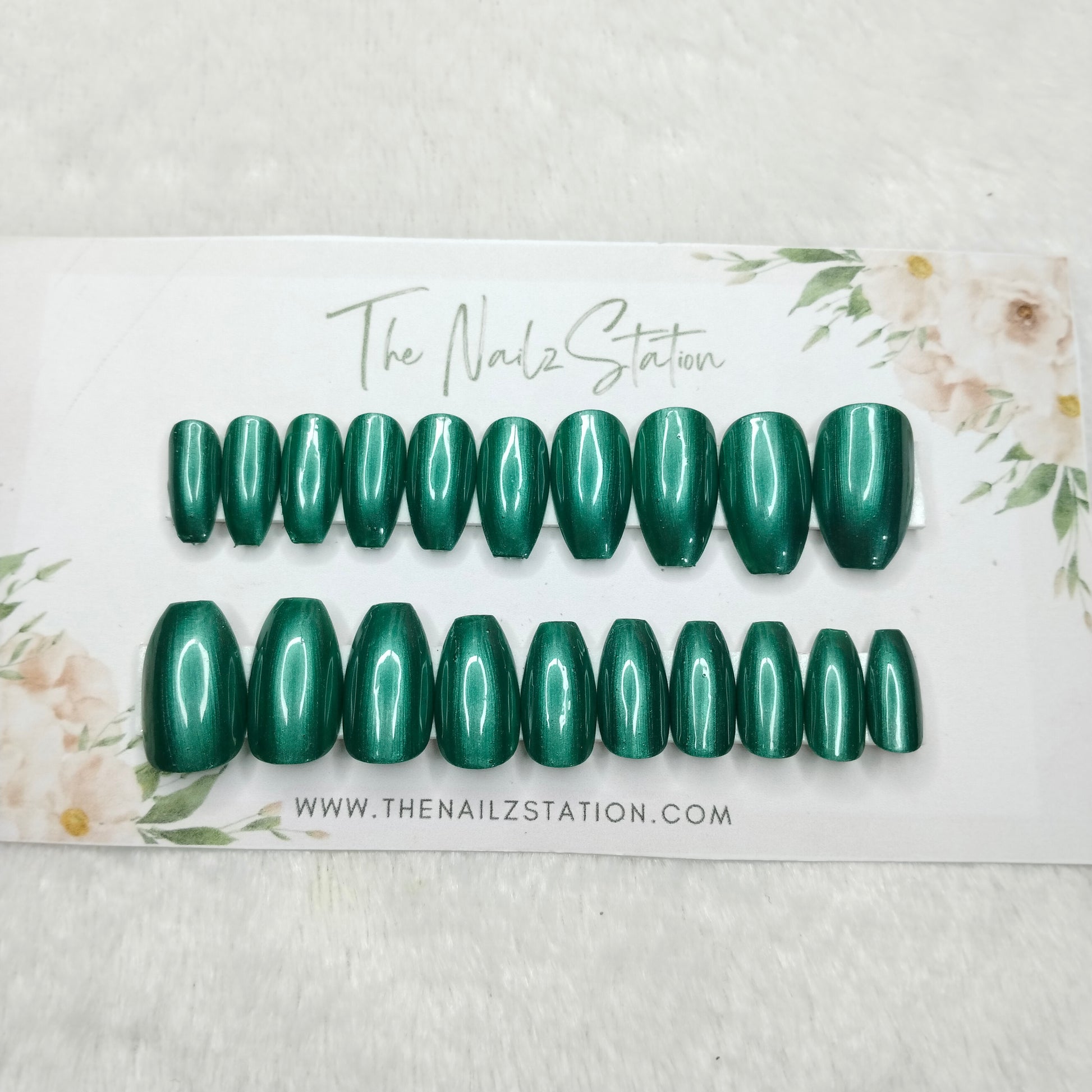 The NailzStation Glossy Green Chrome Press on Fake Artificial Nails Set with glue, filer, sticker application kit // 1481