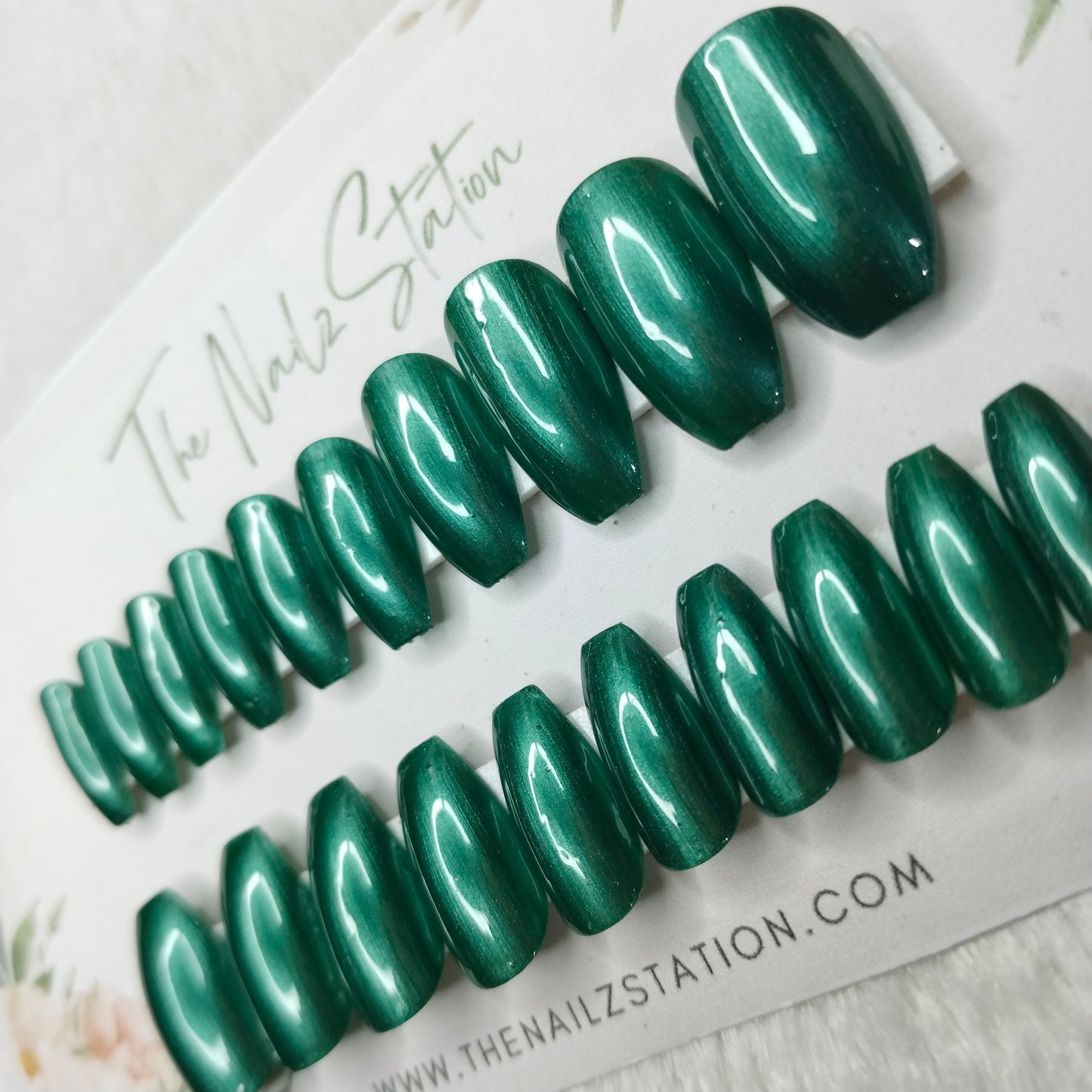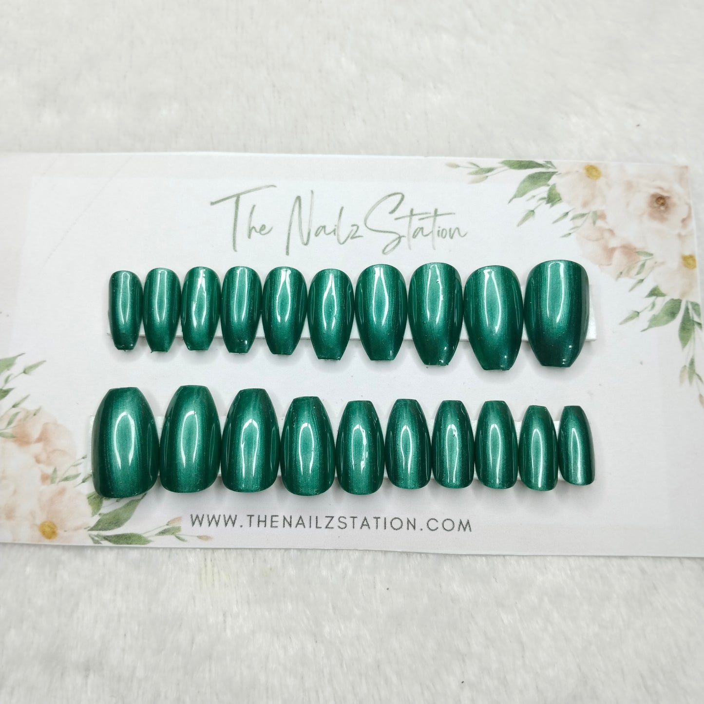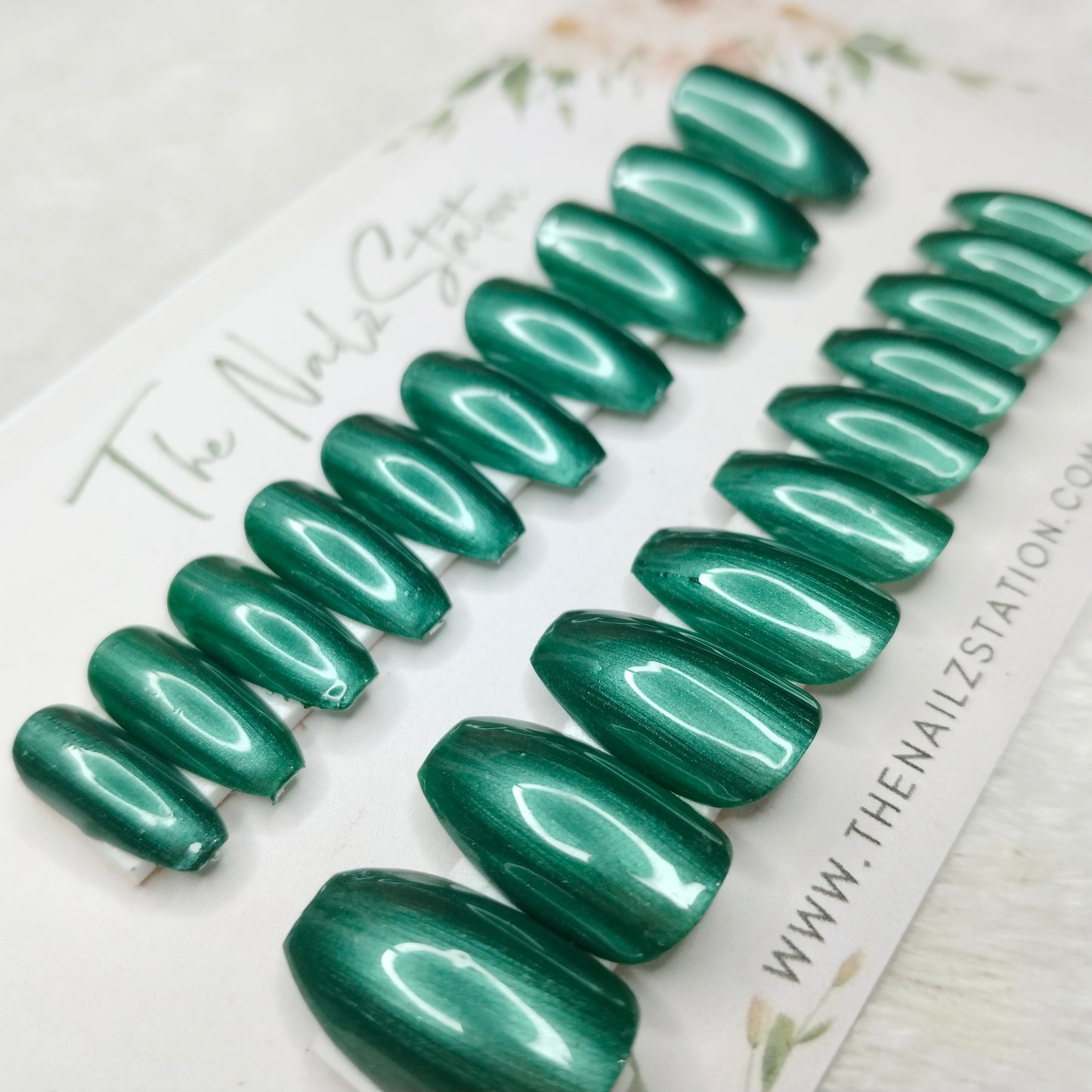 The NailzStation Glossy Green Chrome Press on Fake Artificial Nails Set with glue, filer, sticker application kit // 1481