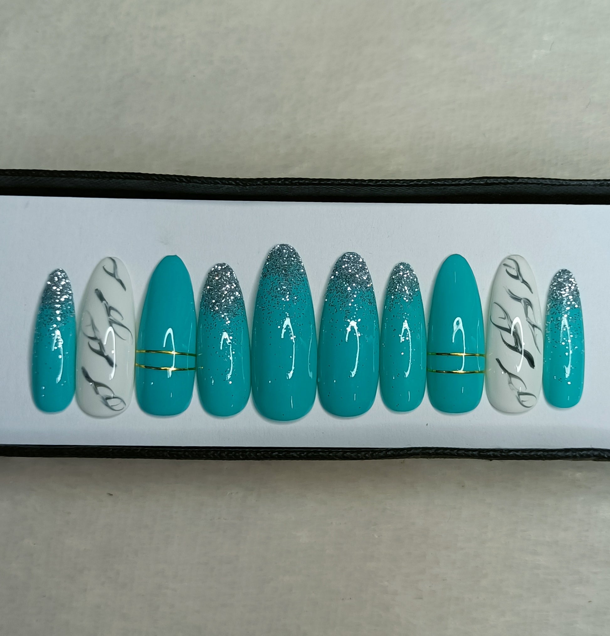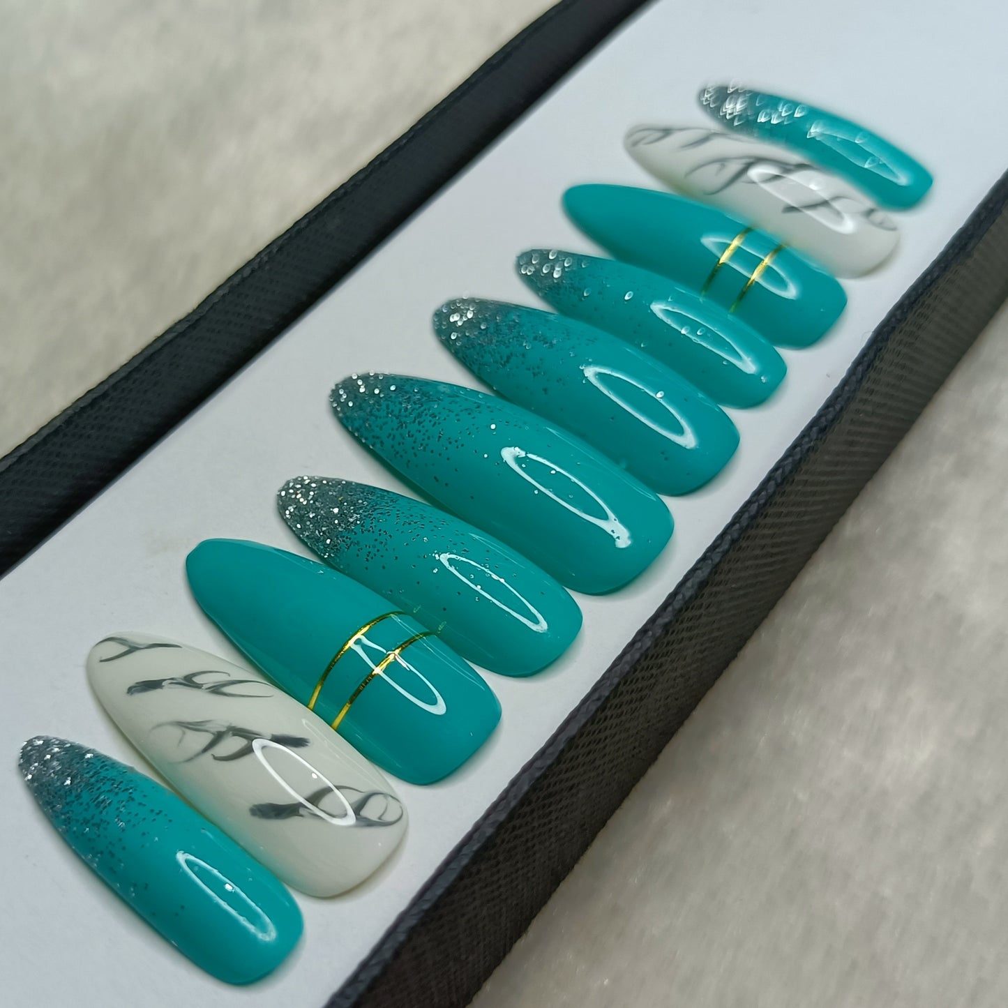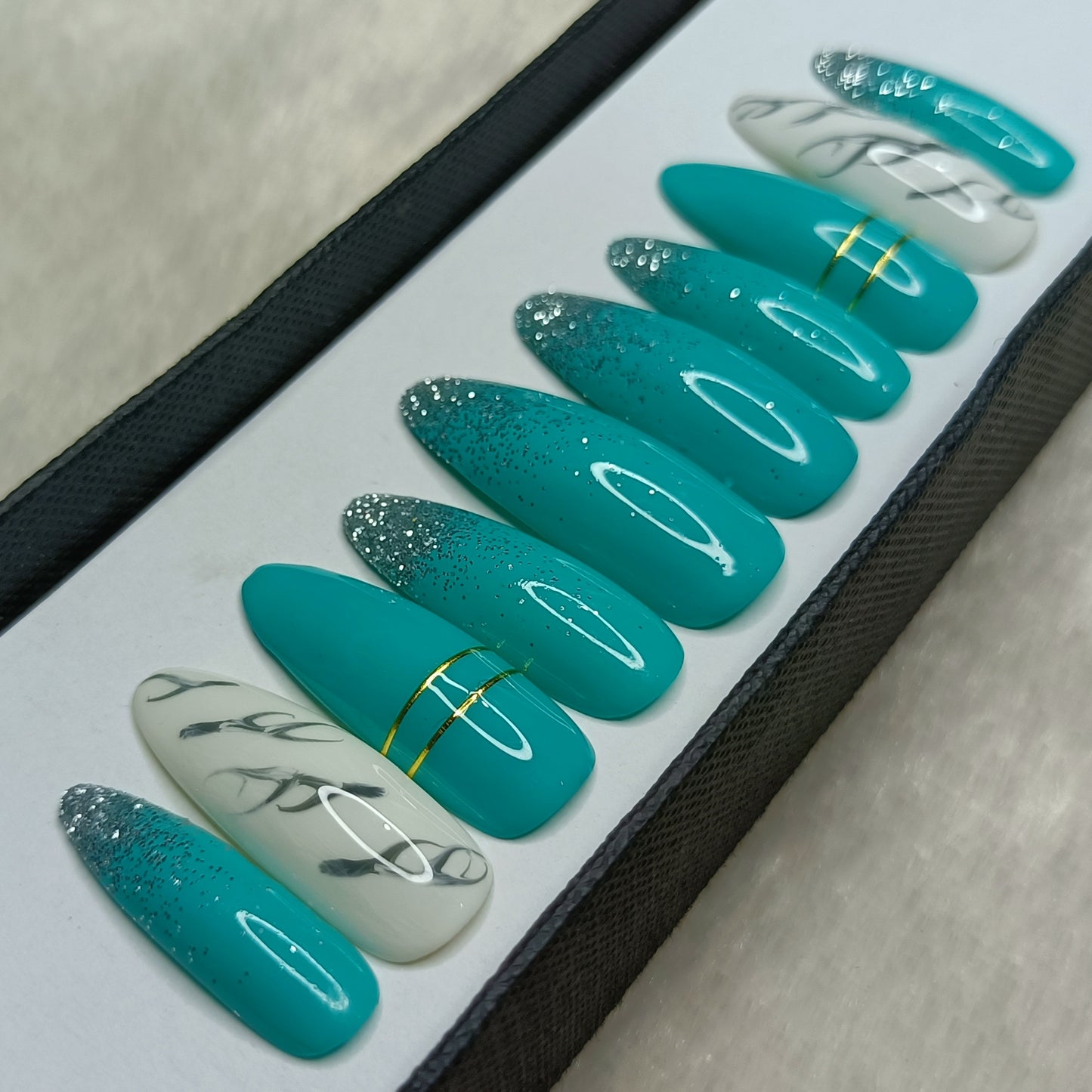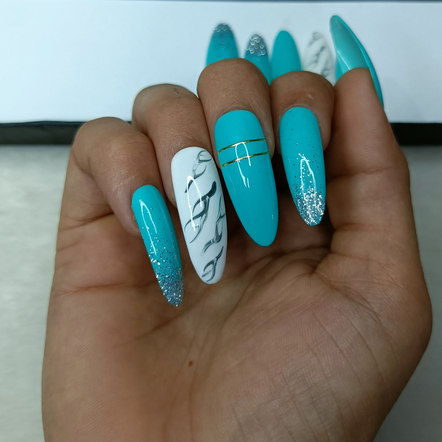 The NailzStation Glossy Light Blue Marble Press on Fake Artificial Nails Set with glue, filer, sticker application kit // 1293