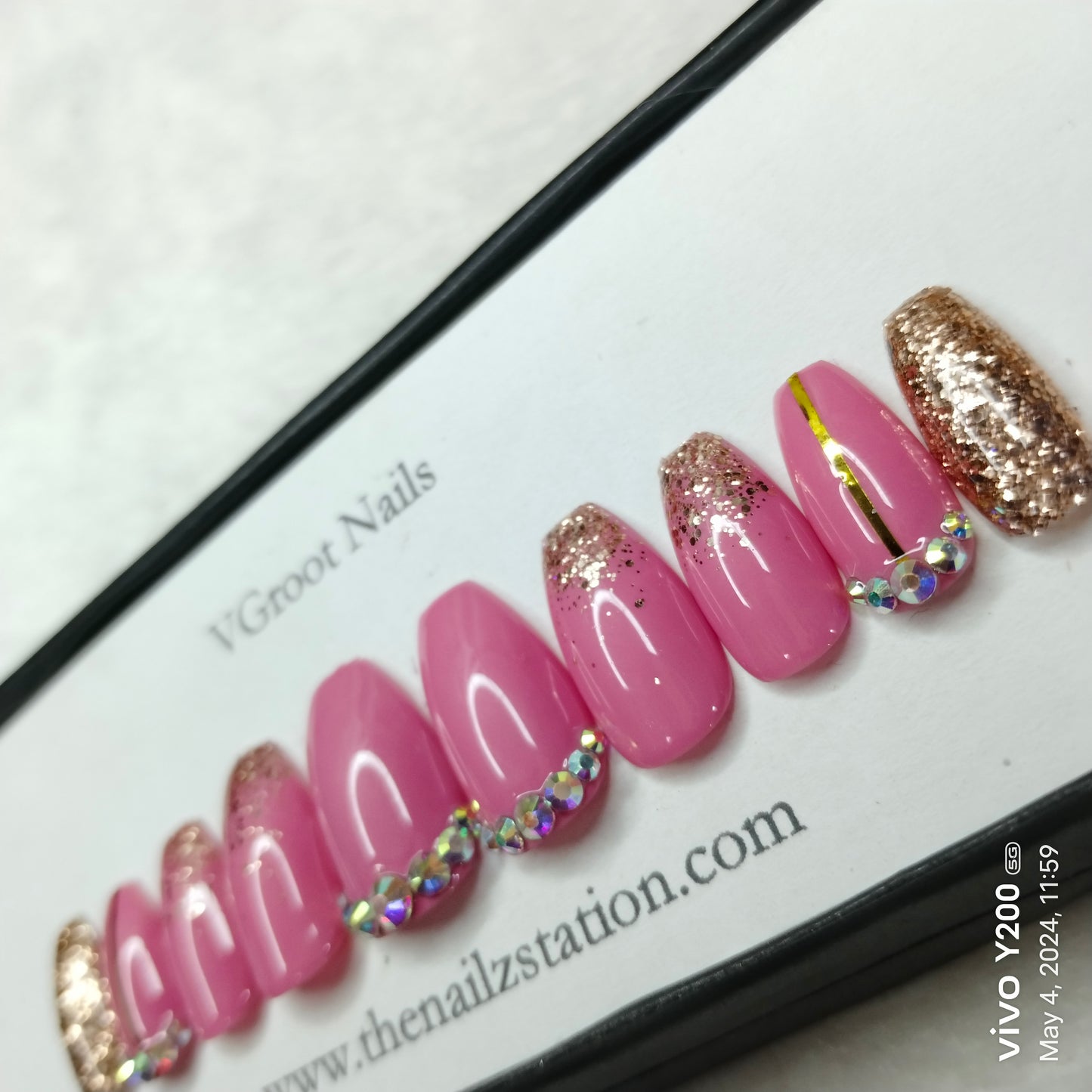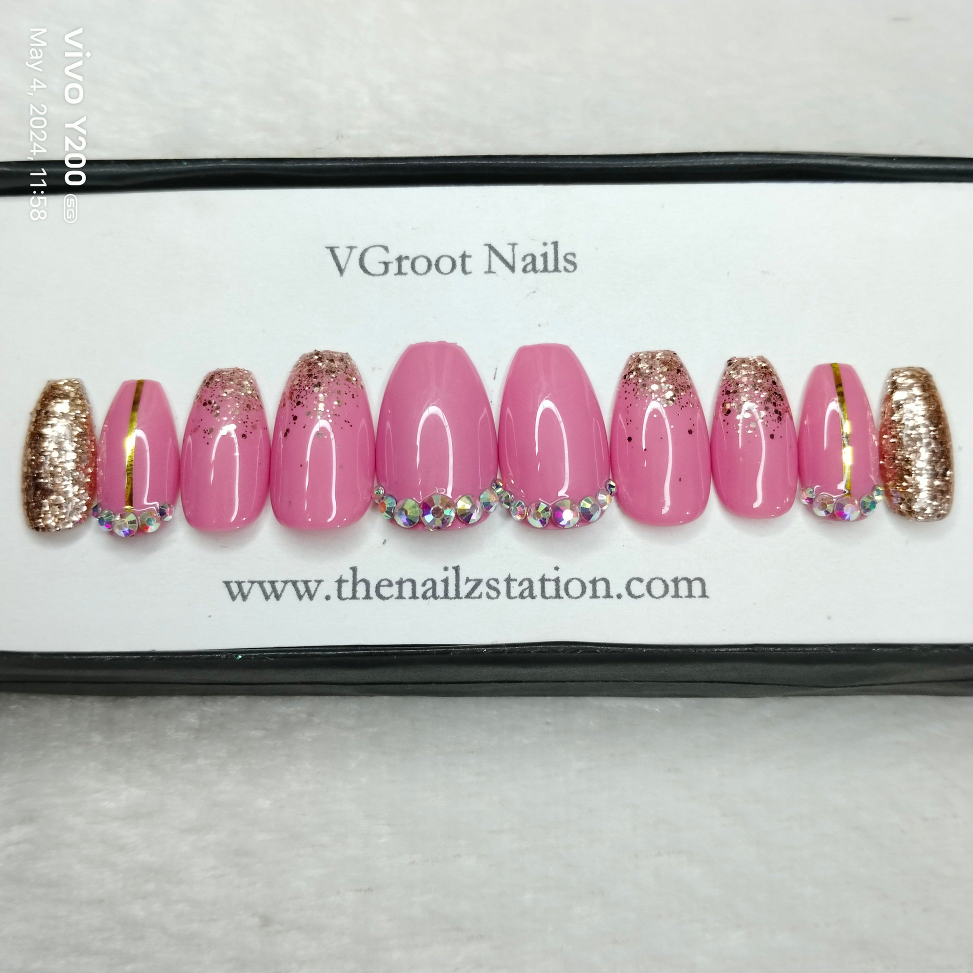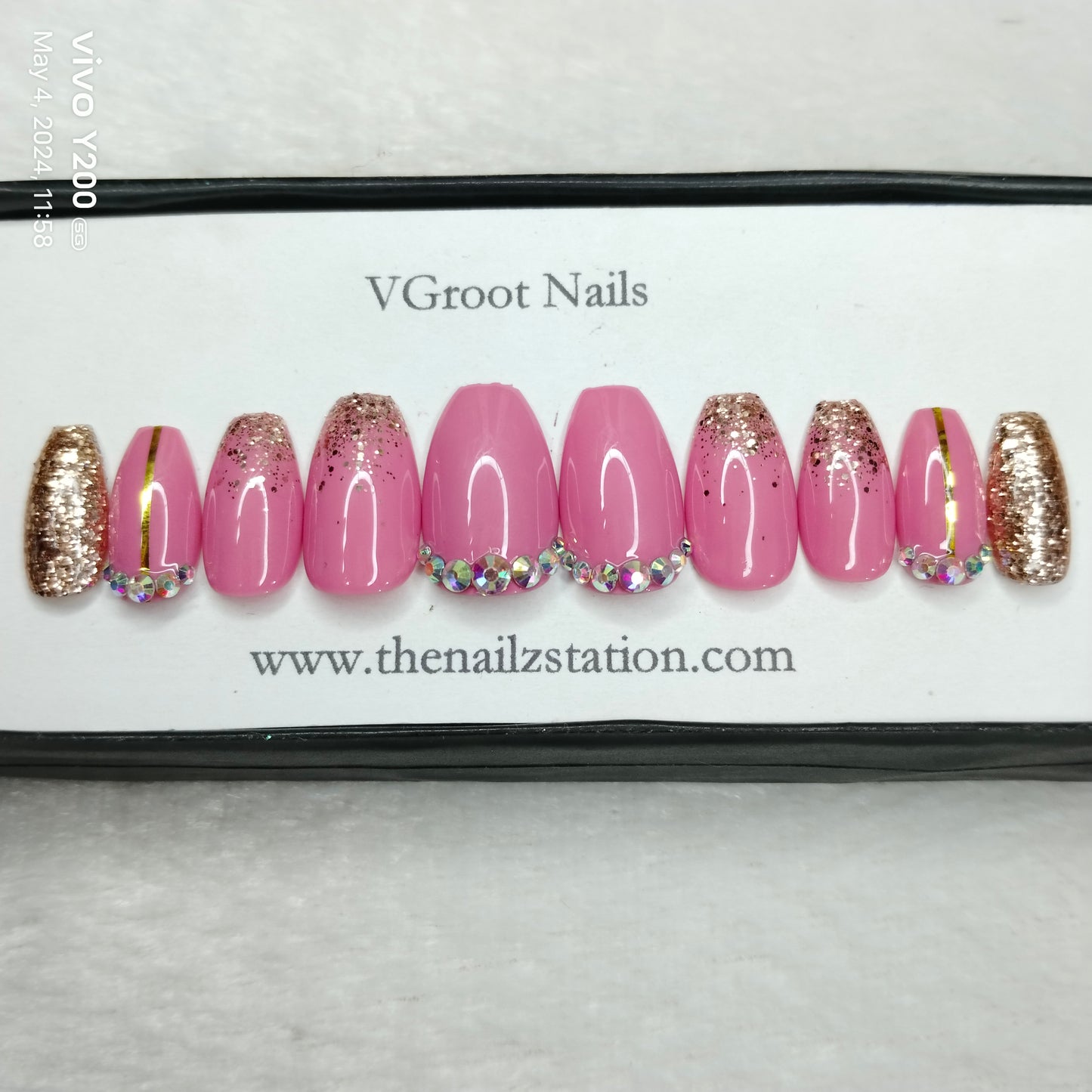 The NailzStation Glossy Light Pink Glitter Studded Press on Fake Artificial Nails Set with glue, filer, sticker application kit // 1156
