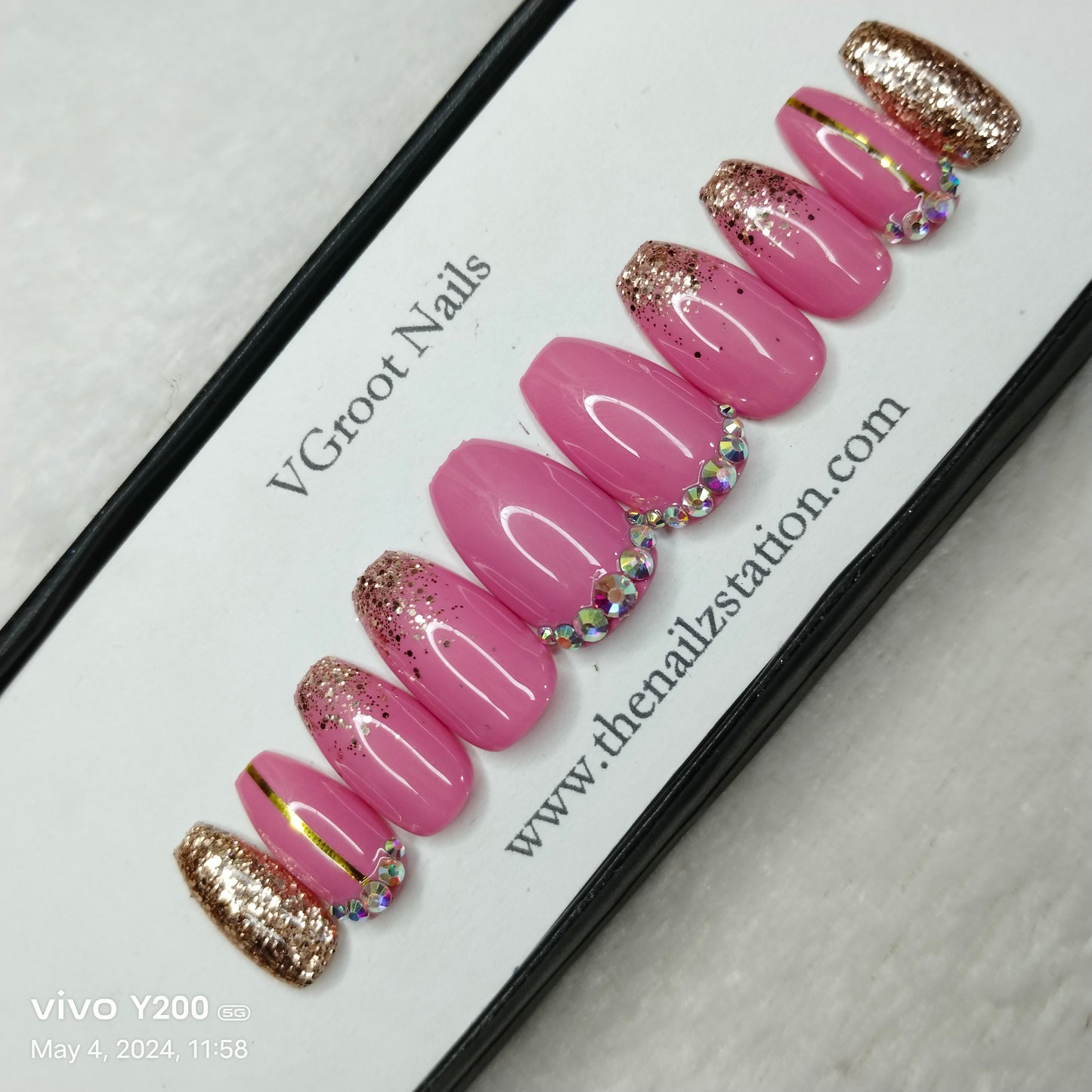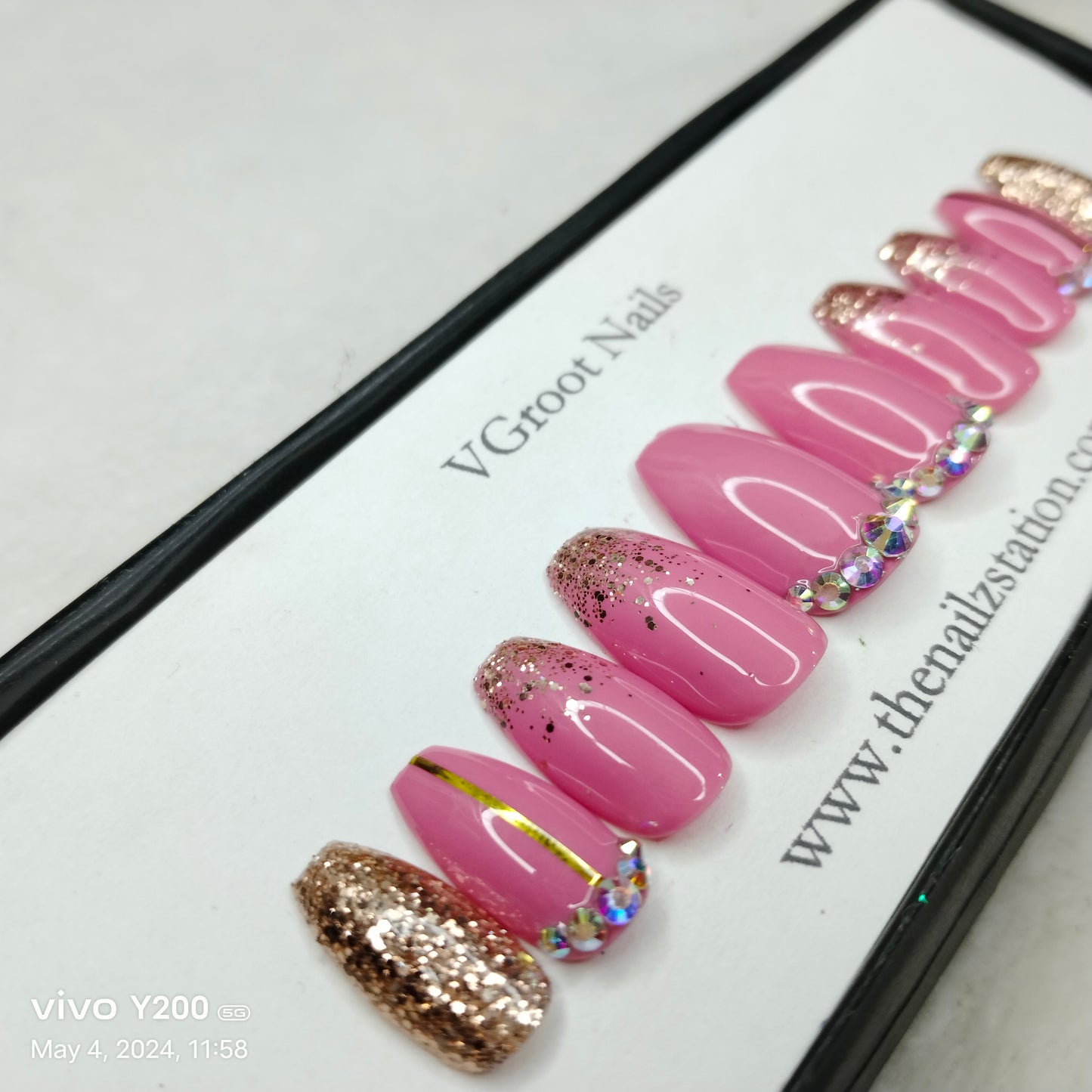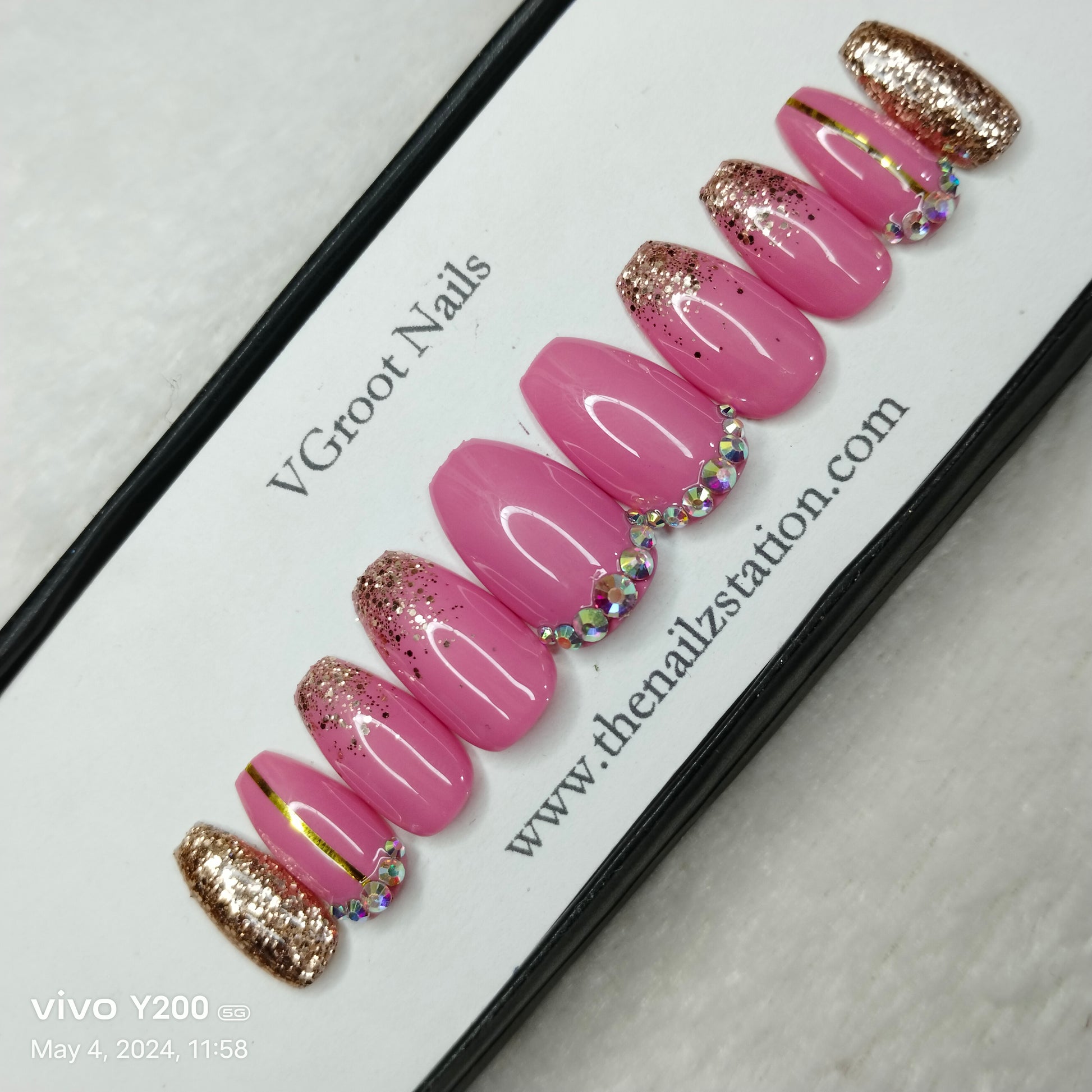 The NailzStation Glossy Light Pink Glitter Studded Press on Fake Artificial Nails Set with glue, filer, sticker application kit // 1156