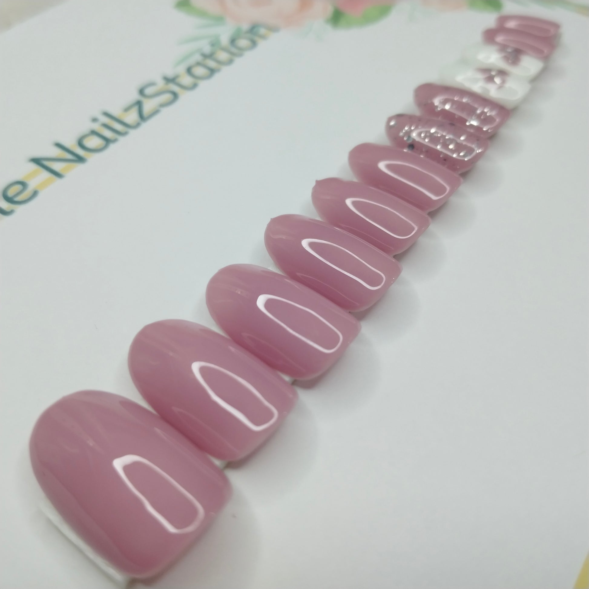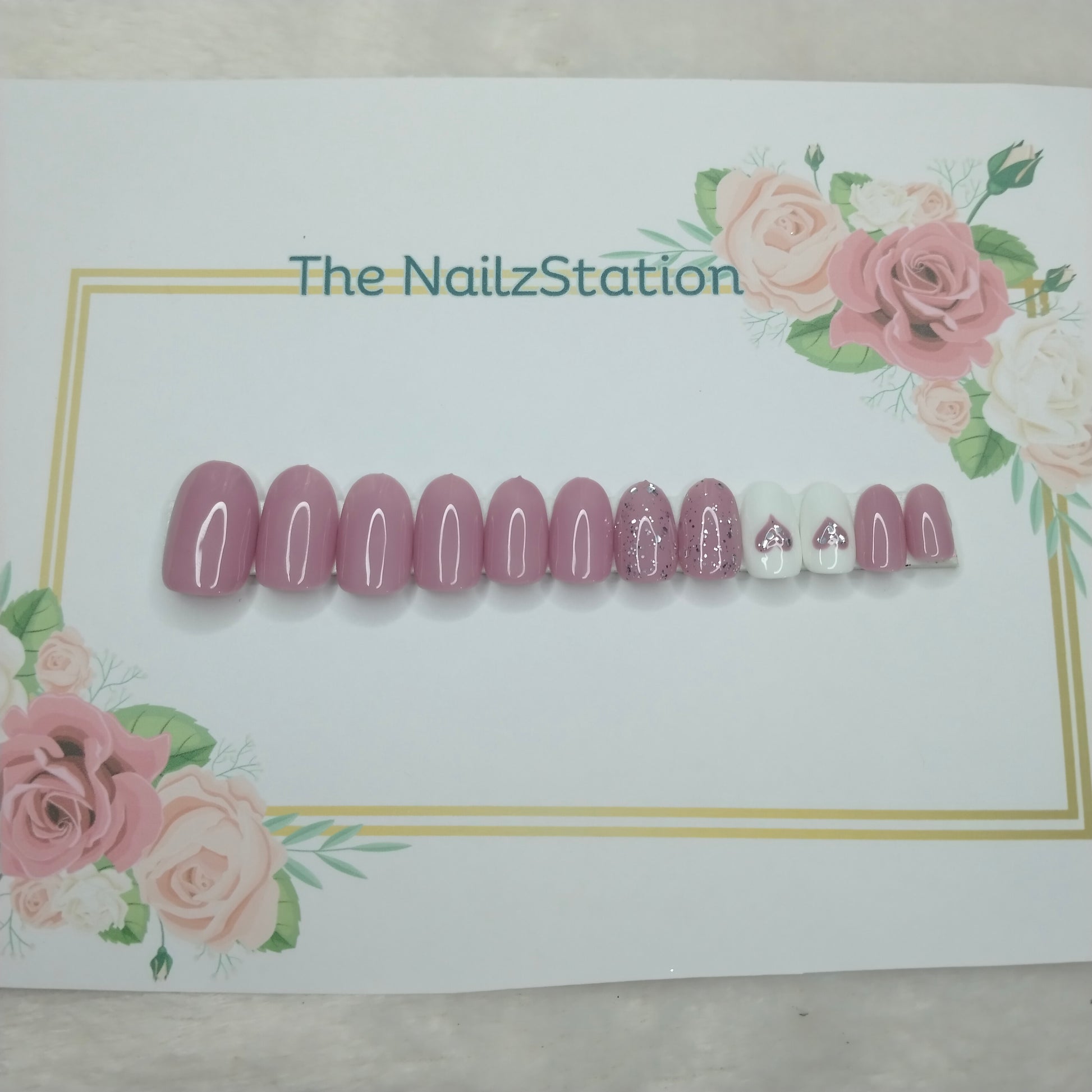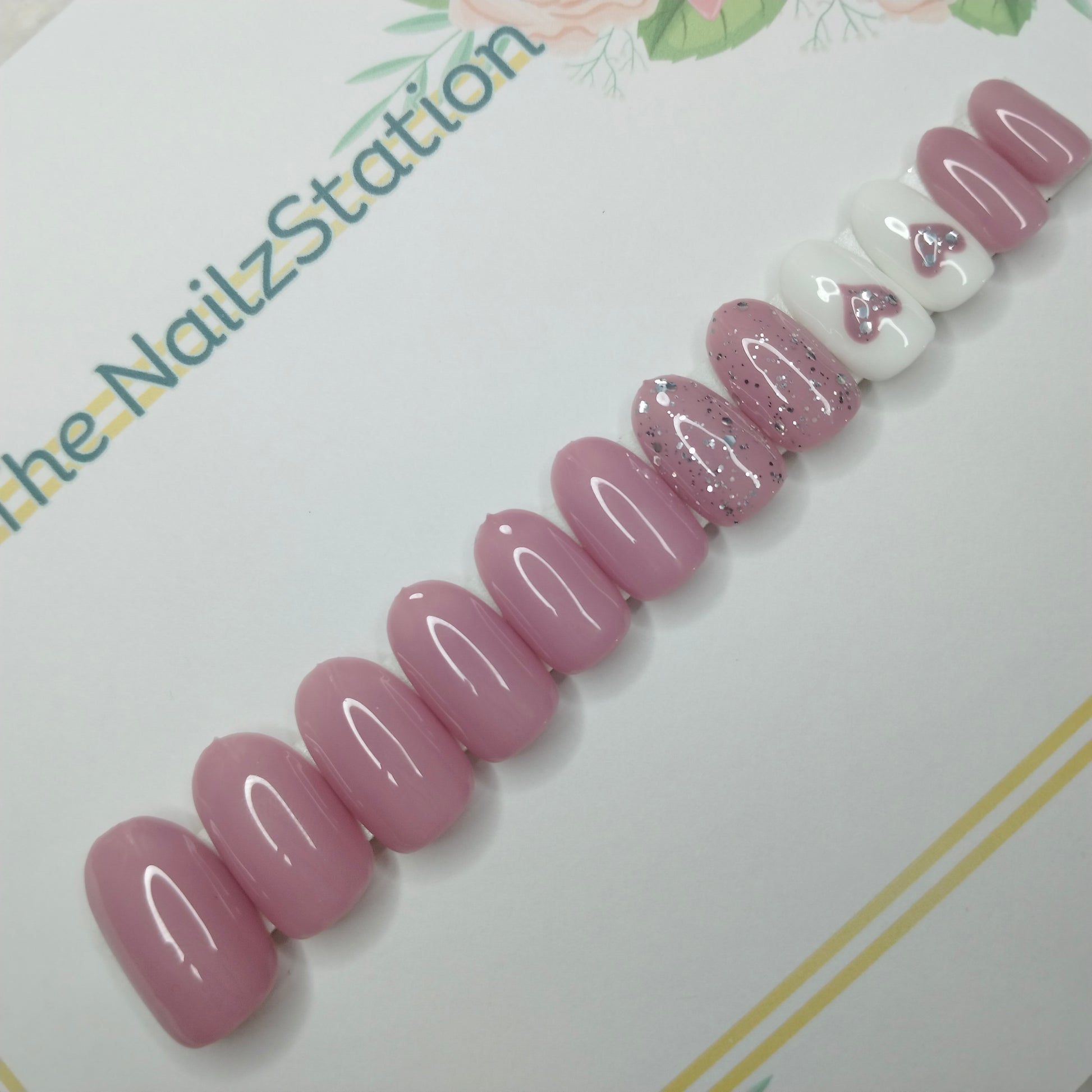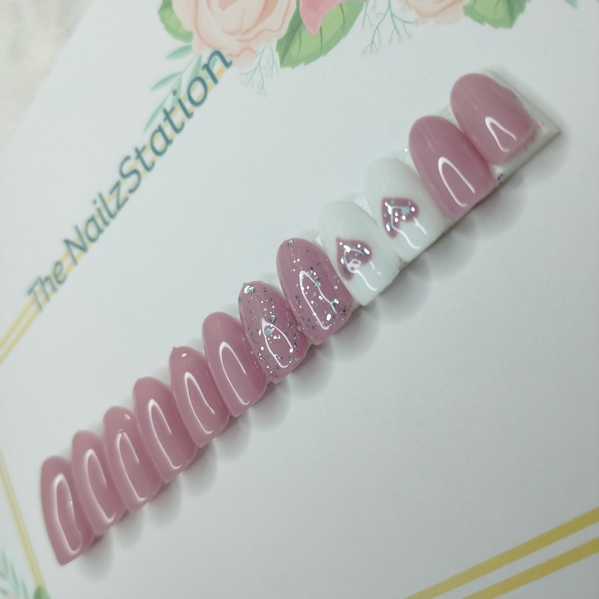 The NailzStation Glossy Light Pink Hearts Press on Fake Artificial Nails Set with glue, filer, sticker application kit // 1524