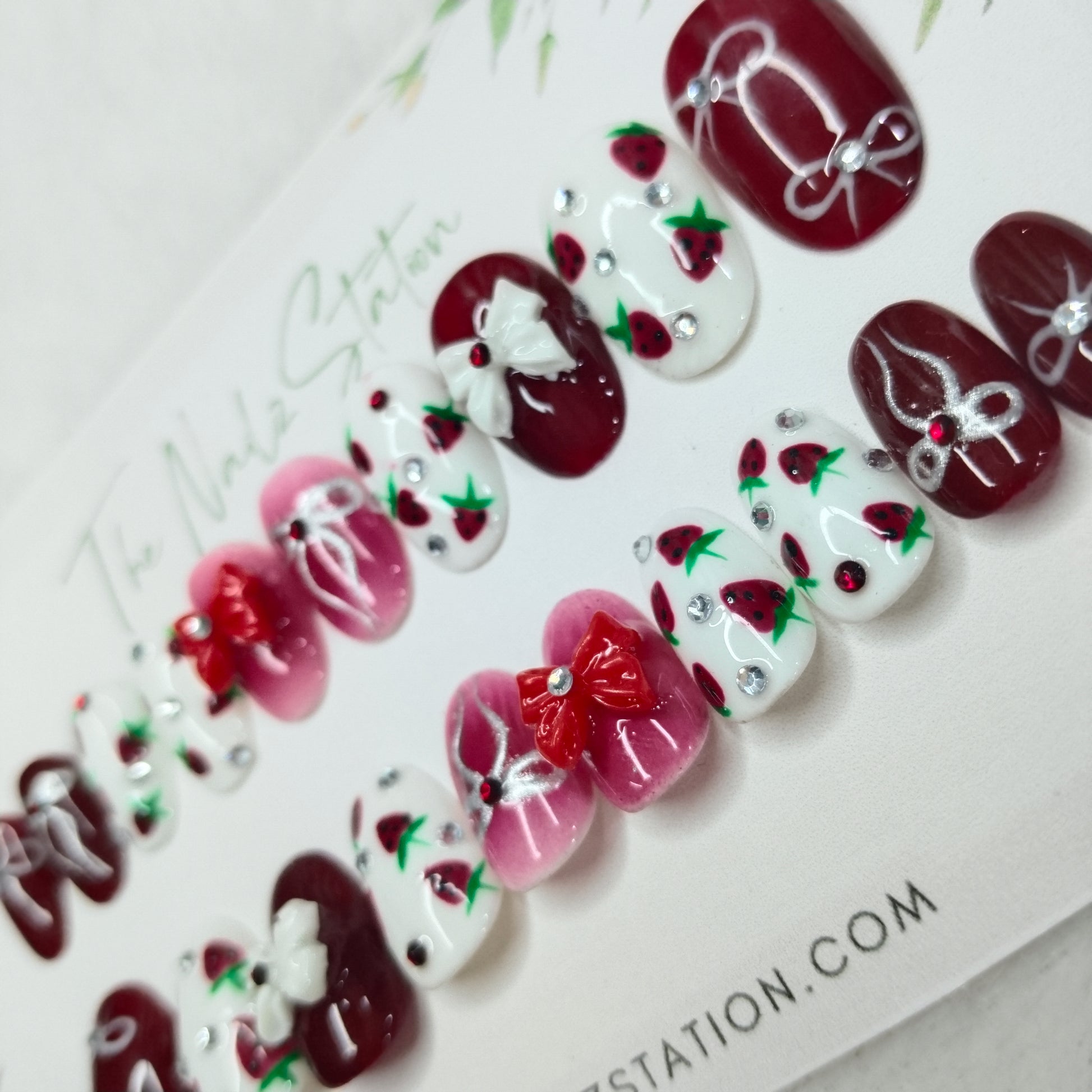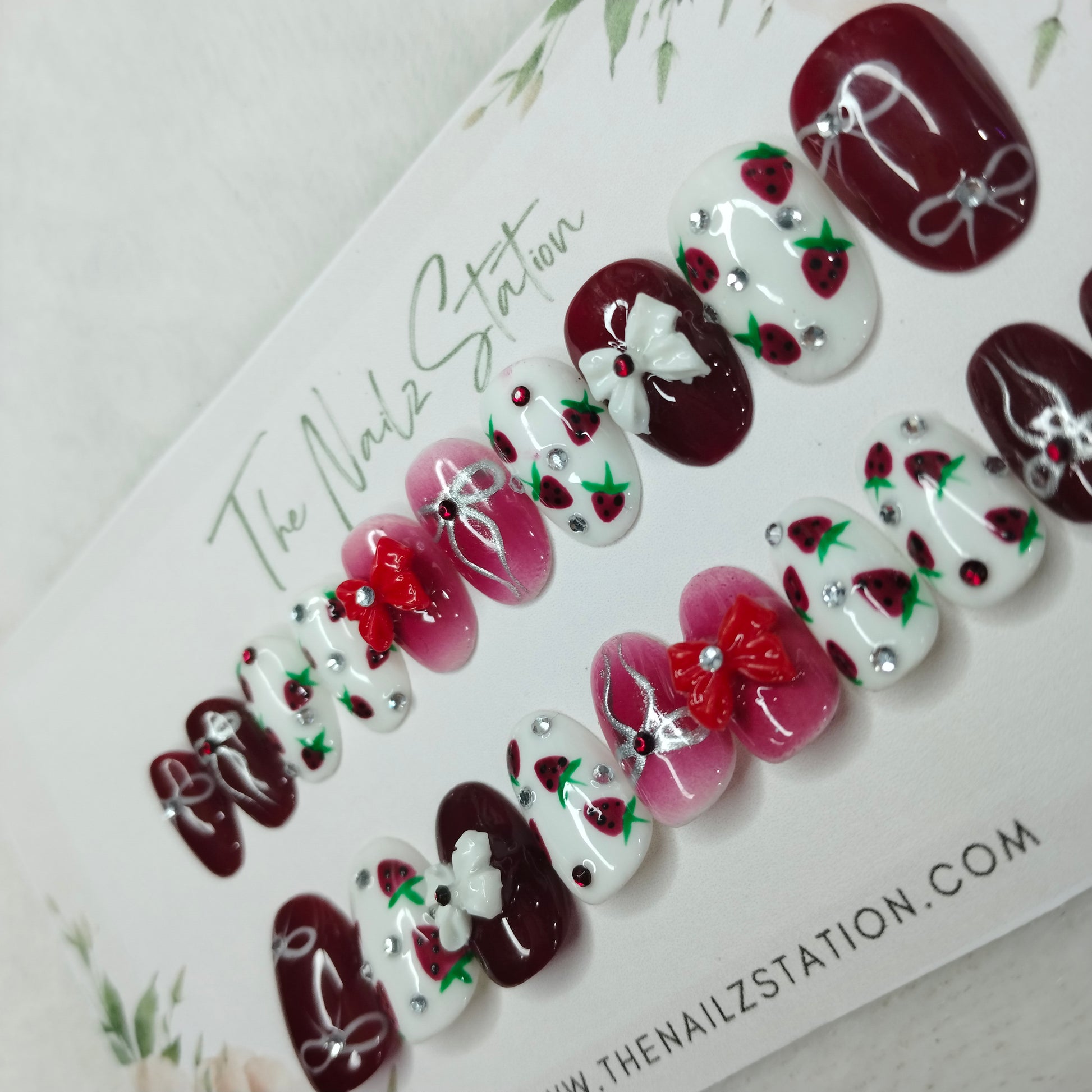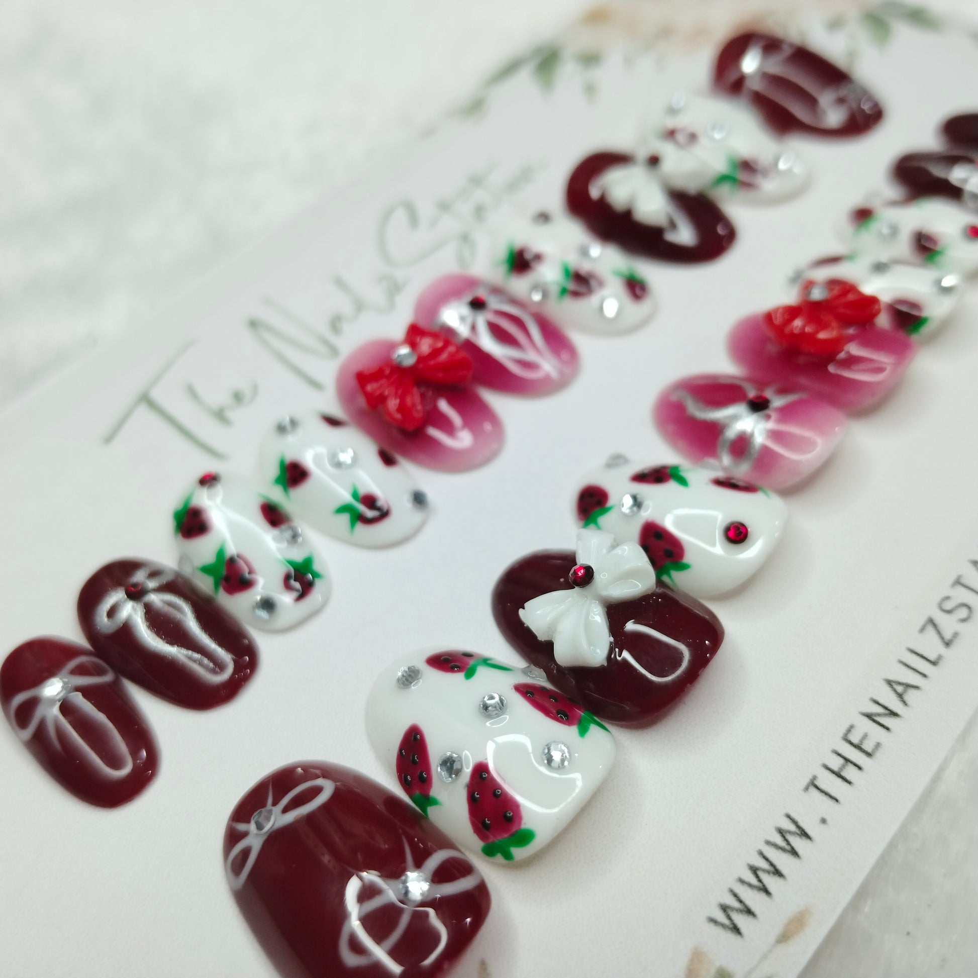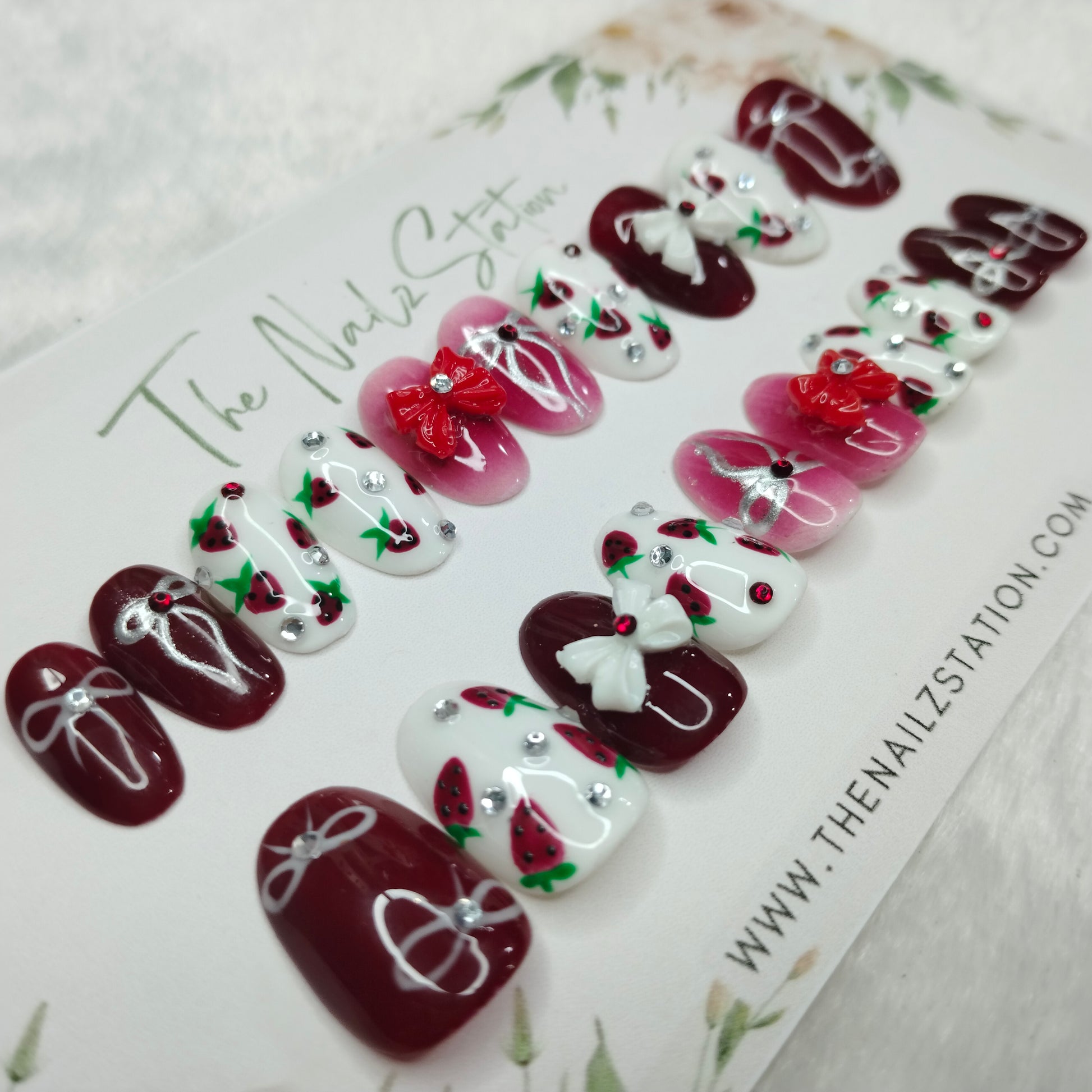 The NailzStation Glossy Maroon 3D Bow Press on Fake Artificial Nails Set with glue, filer, sticker application kit // 1400