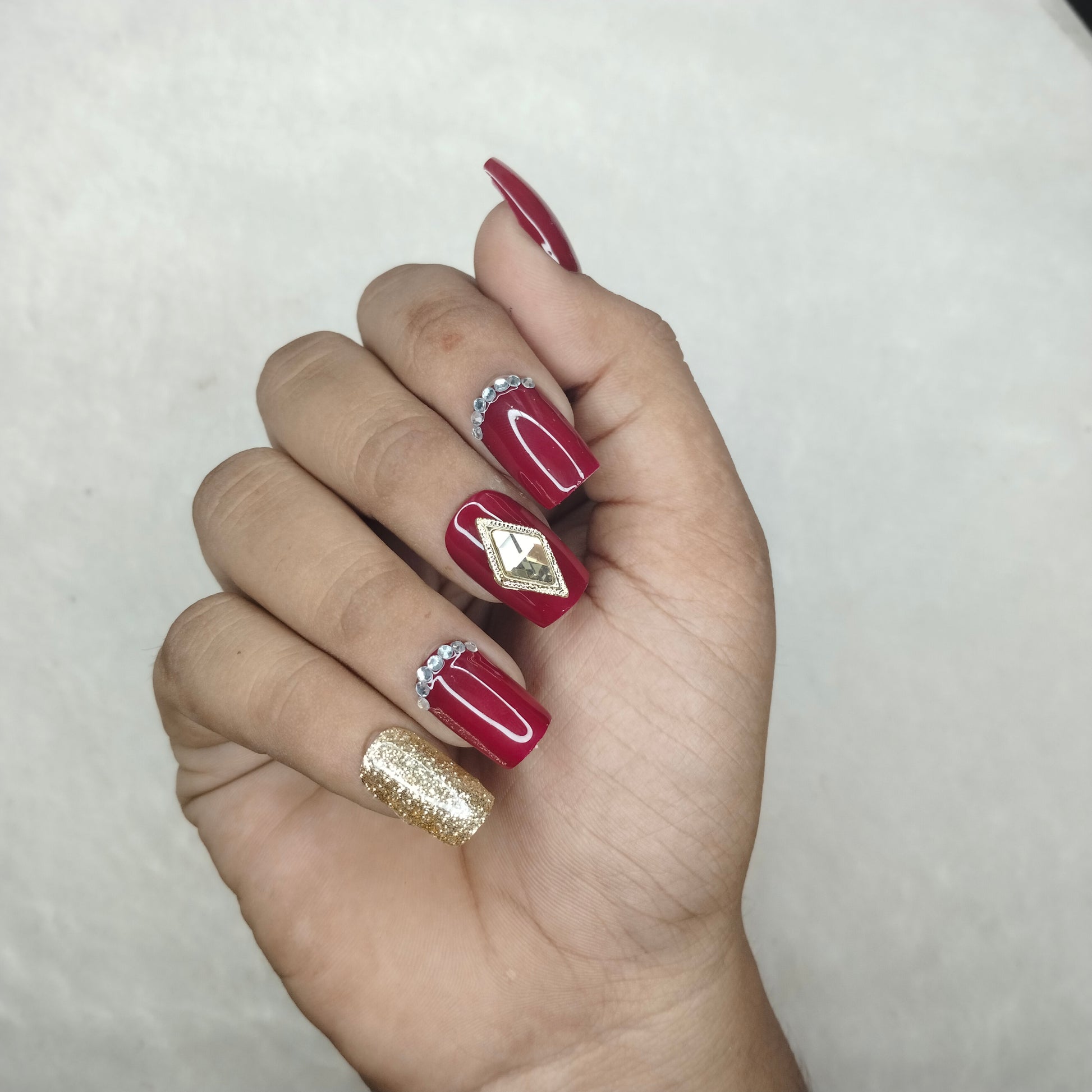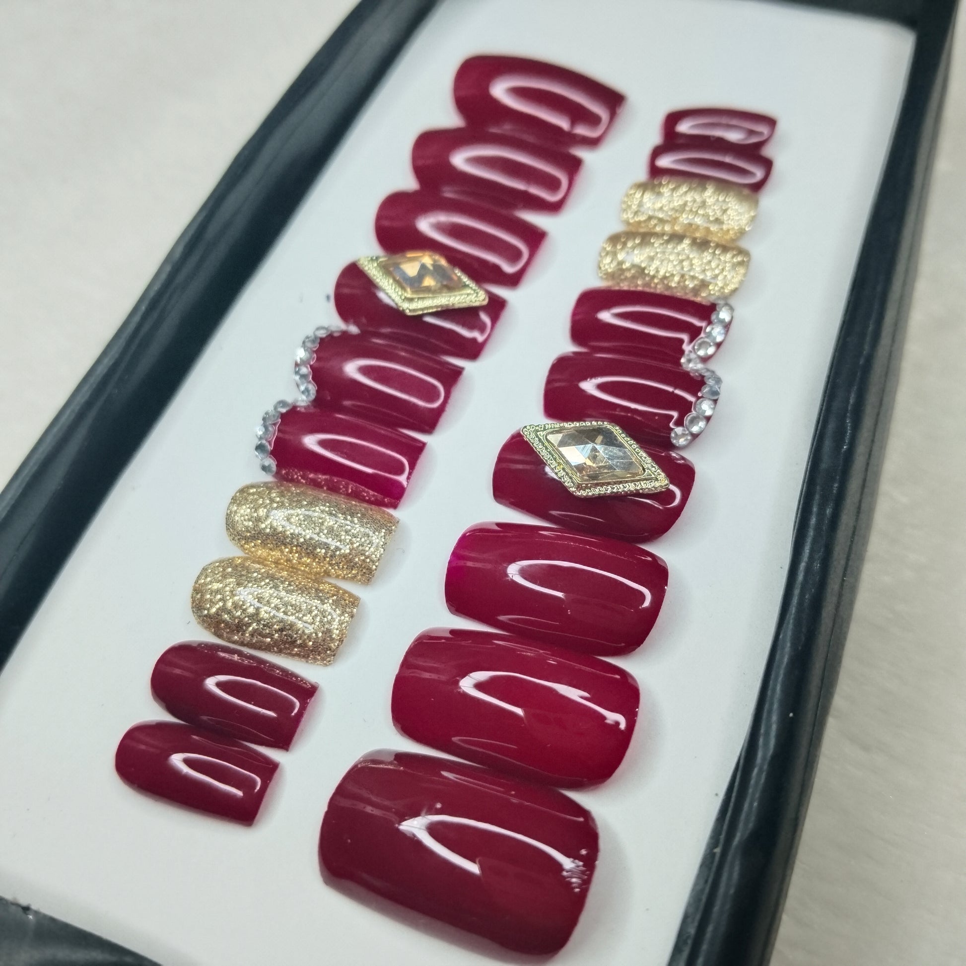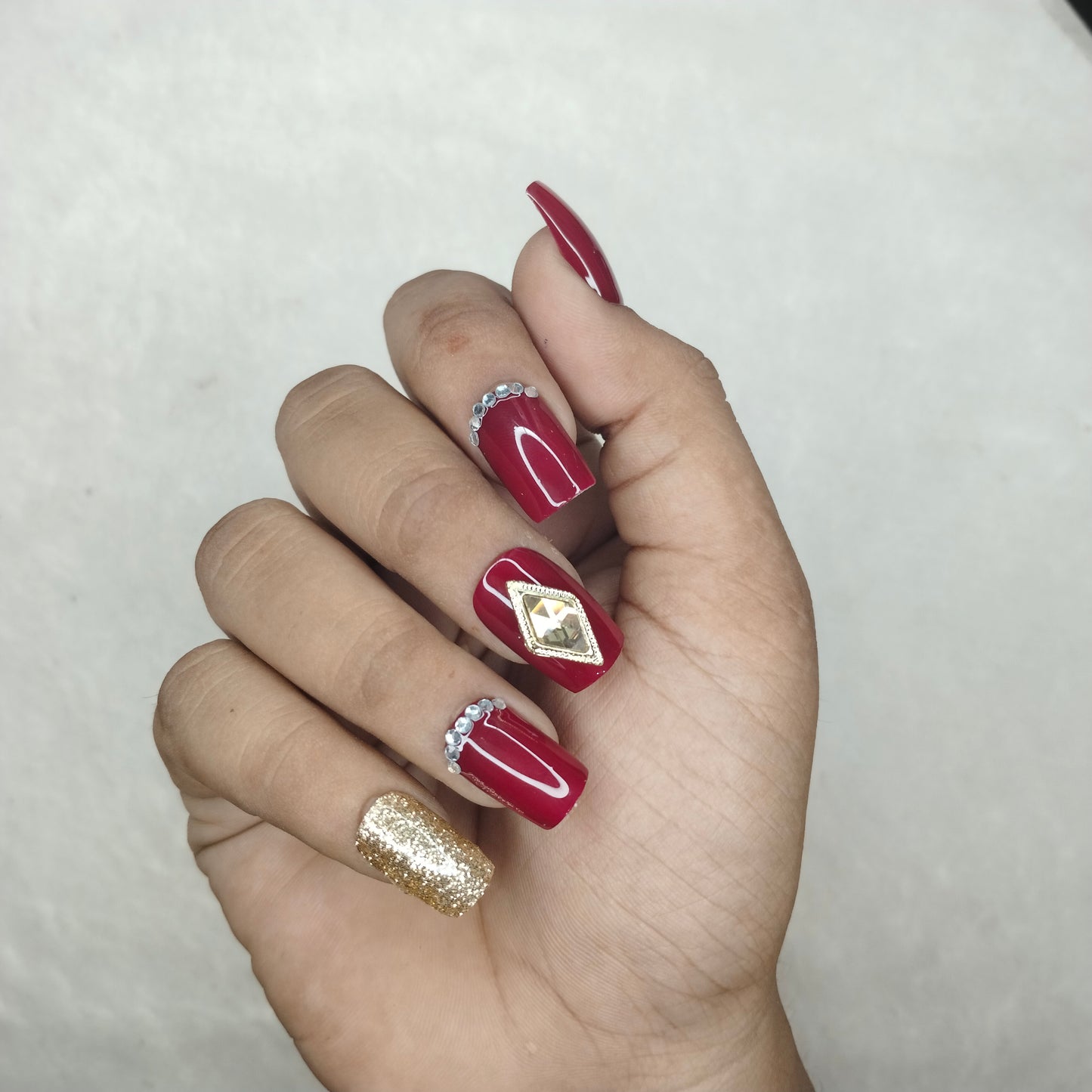 The NailzStation Glossy Maroon 3D Studded Press on Fake Artificial Nails Set with glue, filer, sticker application kit // 1194