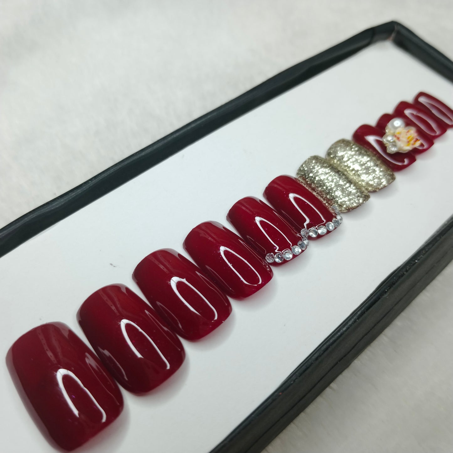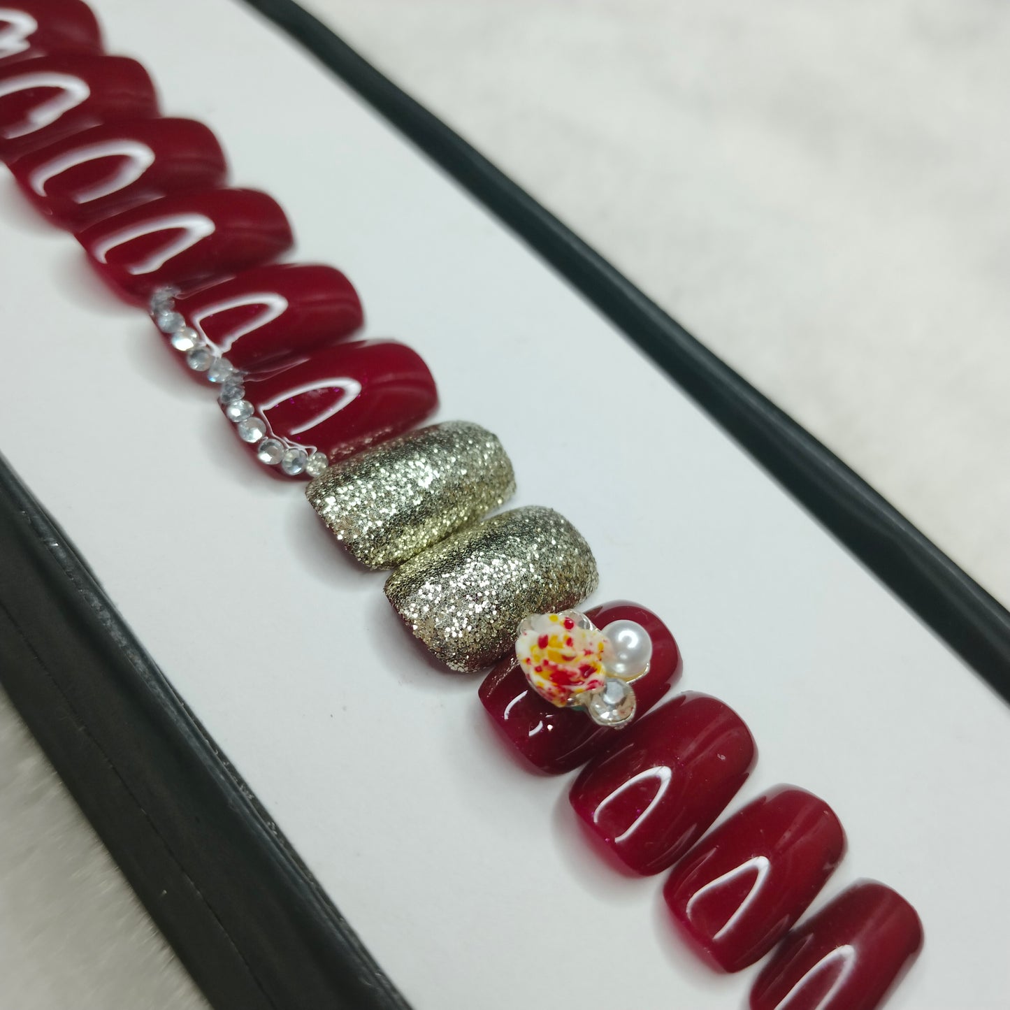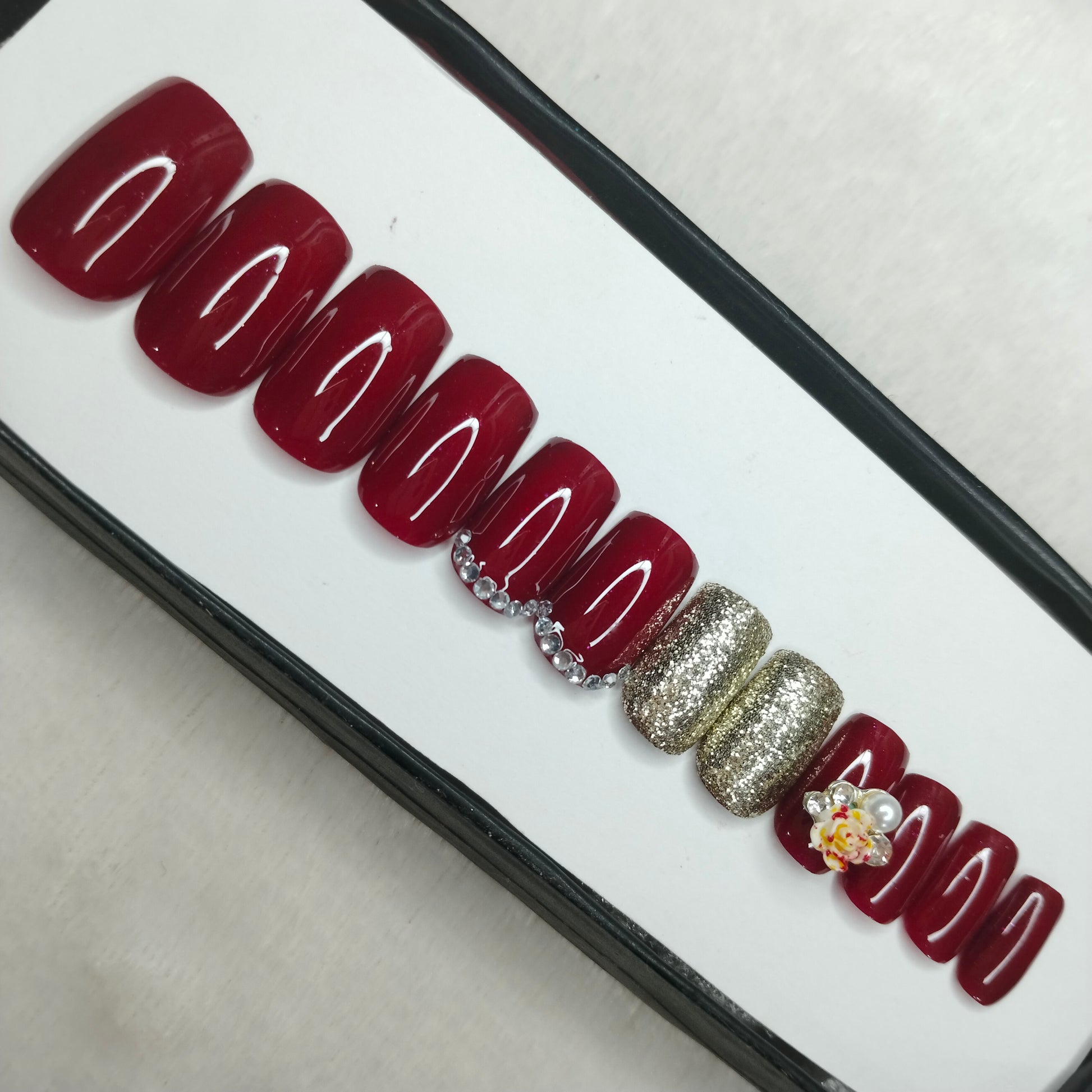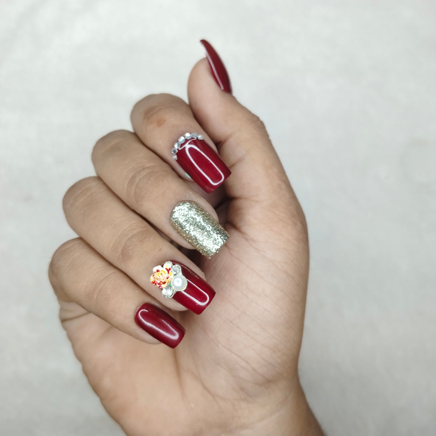 The NailzStation Glossy Maroon Glitter 3D Floral Press on Fake Artificial Nails Set with glue, filer, sticker application kit // 1199