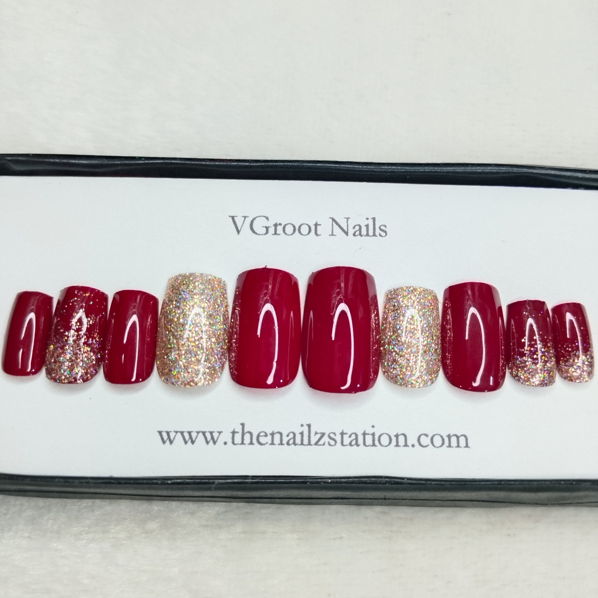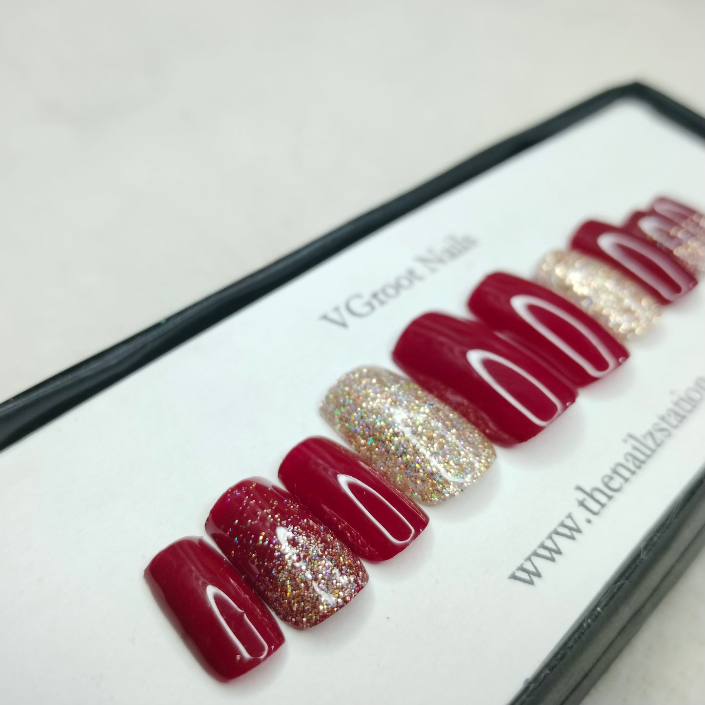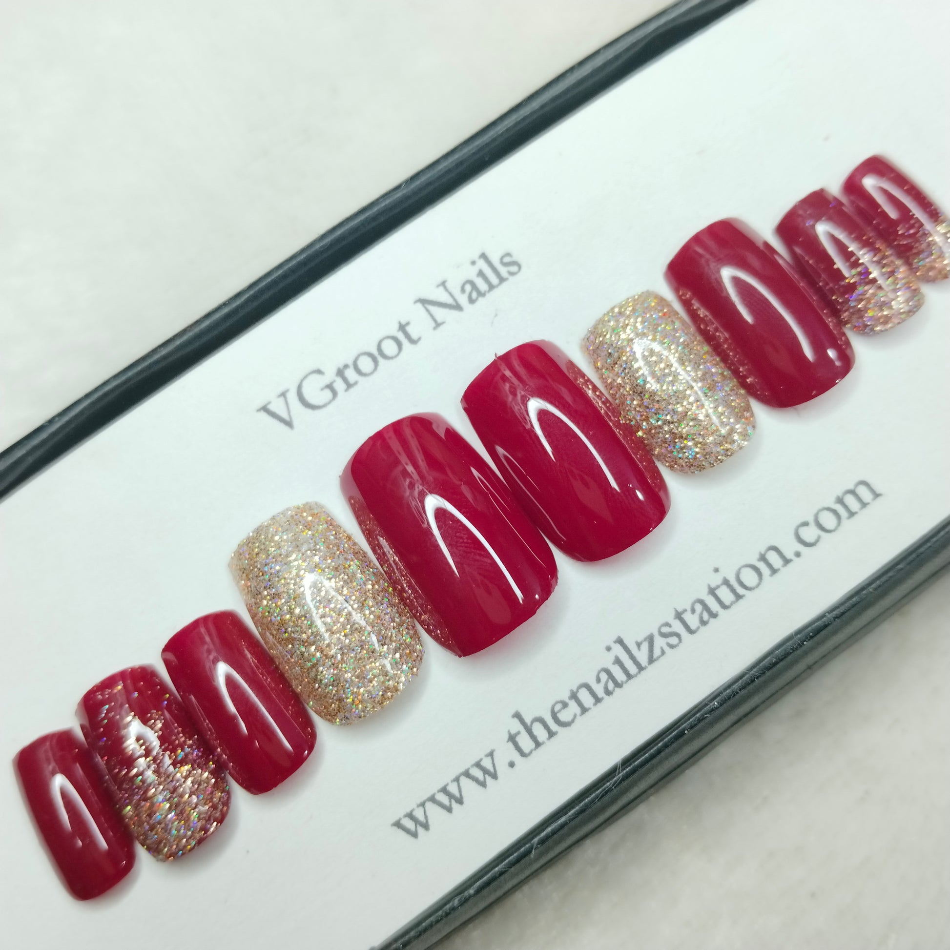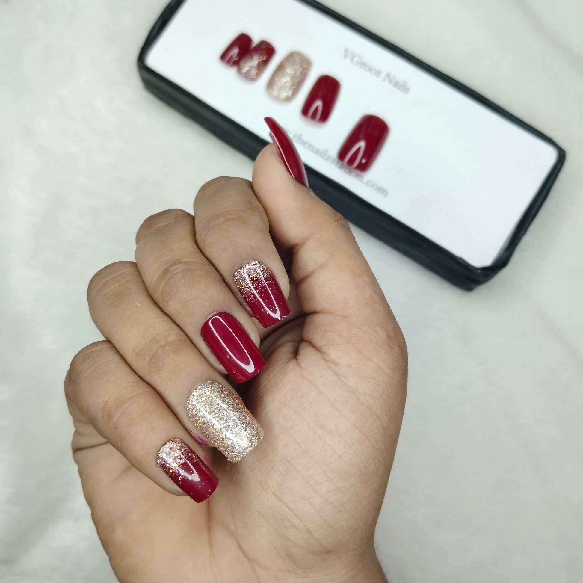 The NailzStation Glossy Maroon Glitter Ombre Press on Fake Artificial Nails Set with glue, filer, sticker application kit // 1143
