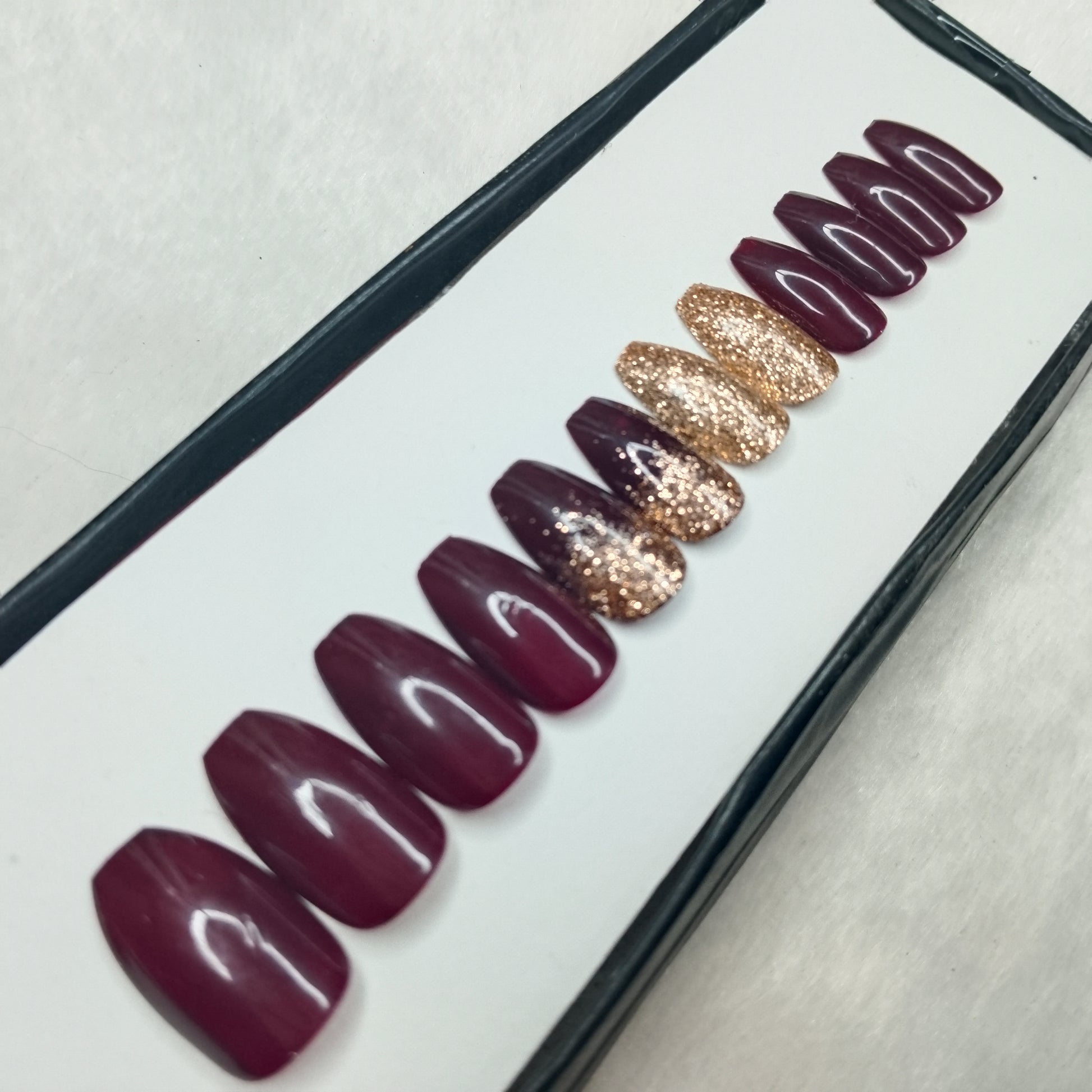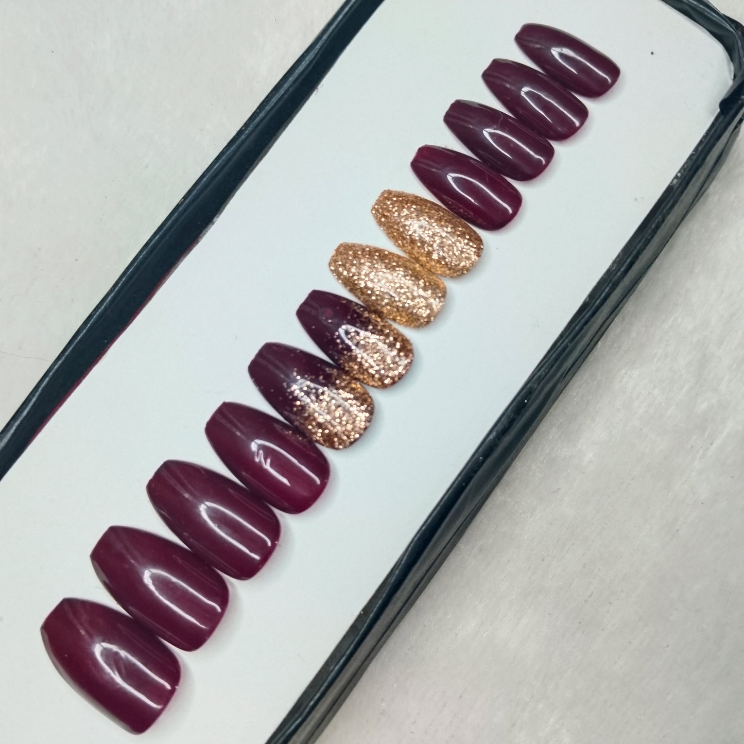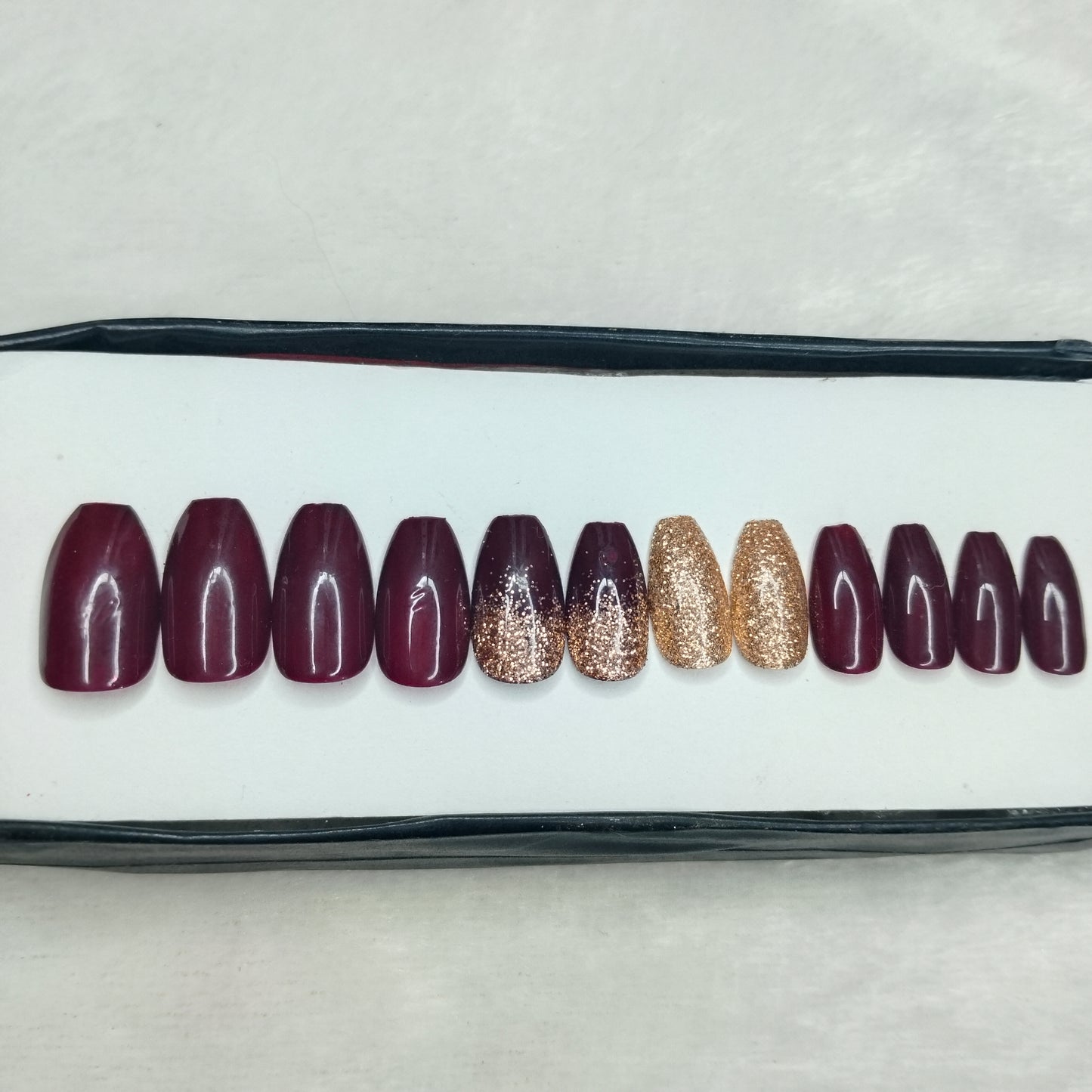 The NailzStation Glossy maroon Glitter Ombre Press on Fake Artificial Nails Set with glue, filer, sticker application kit // 1437