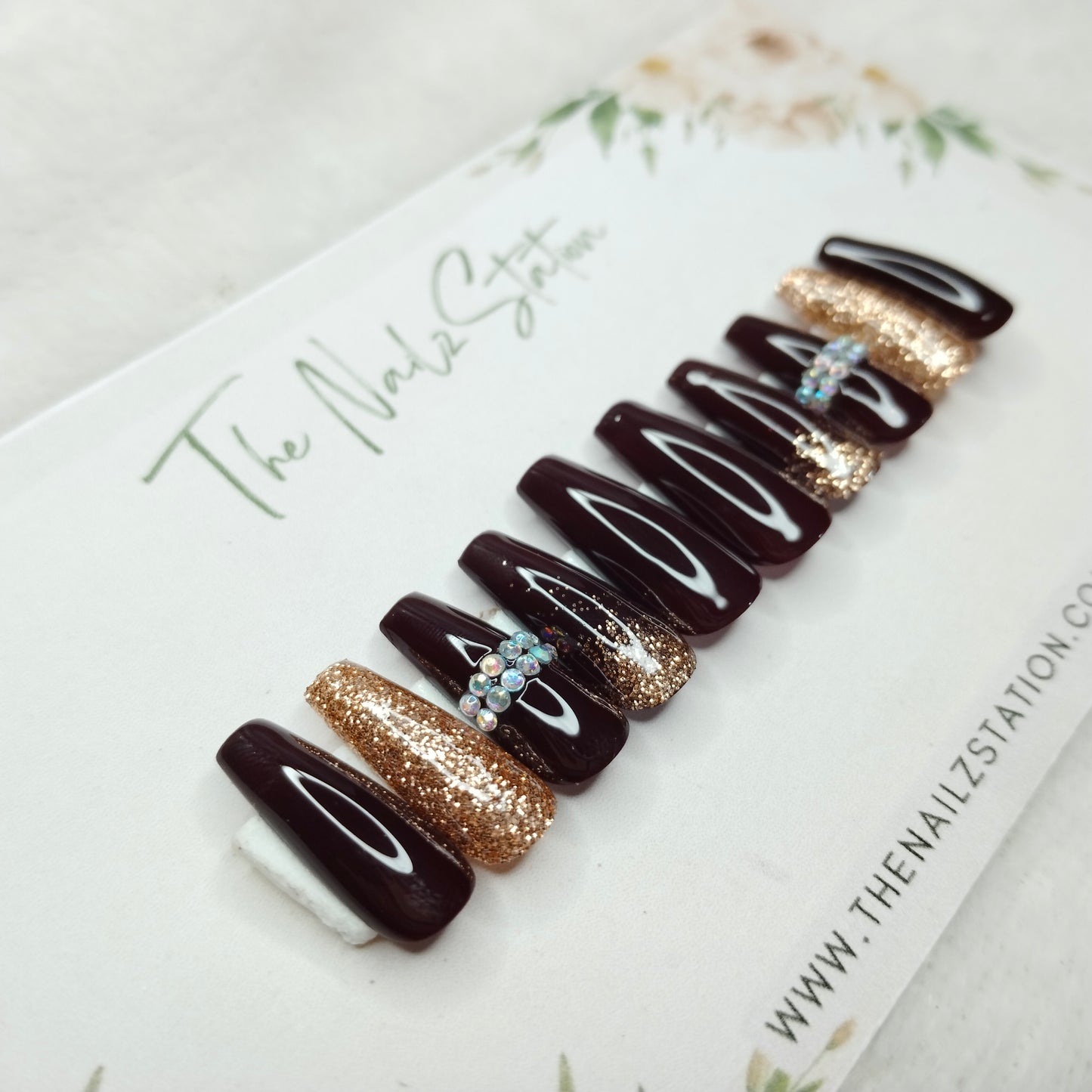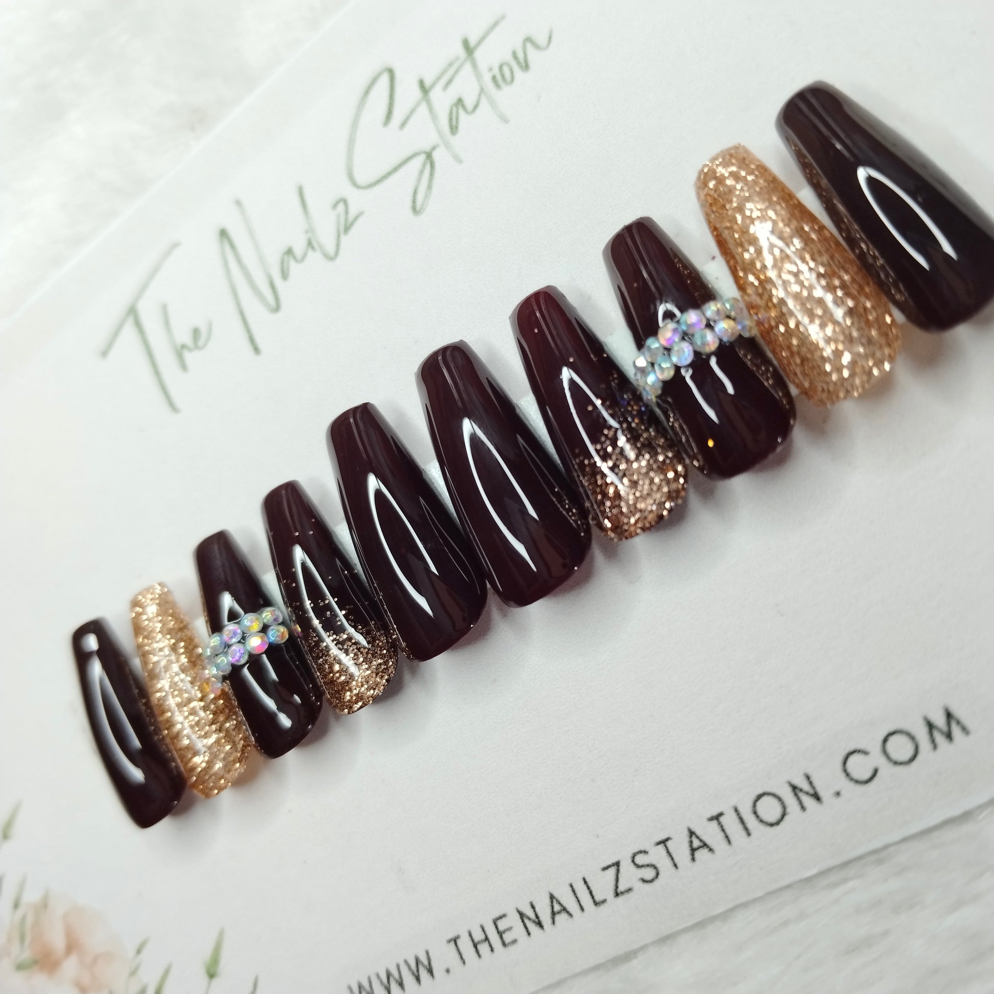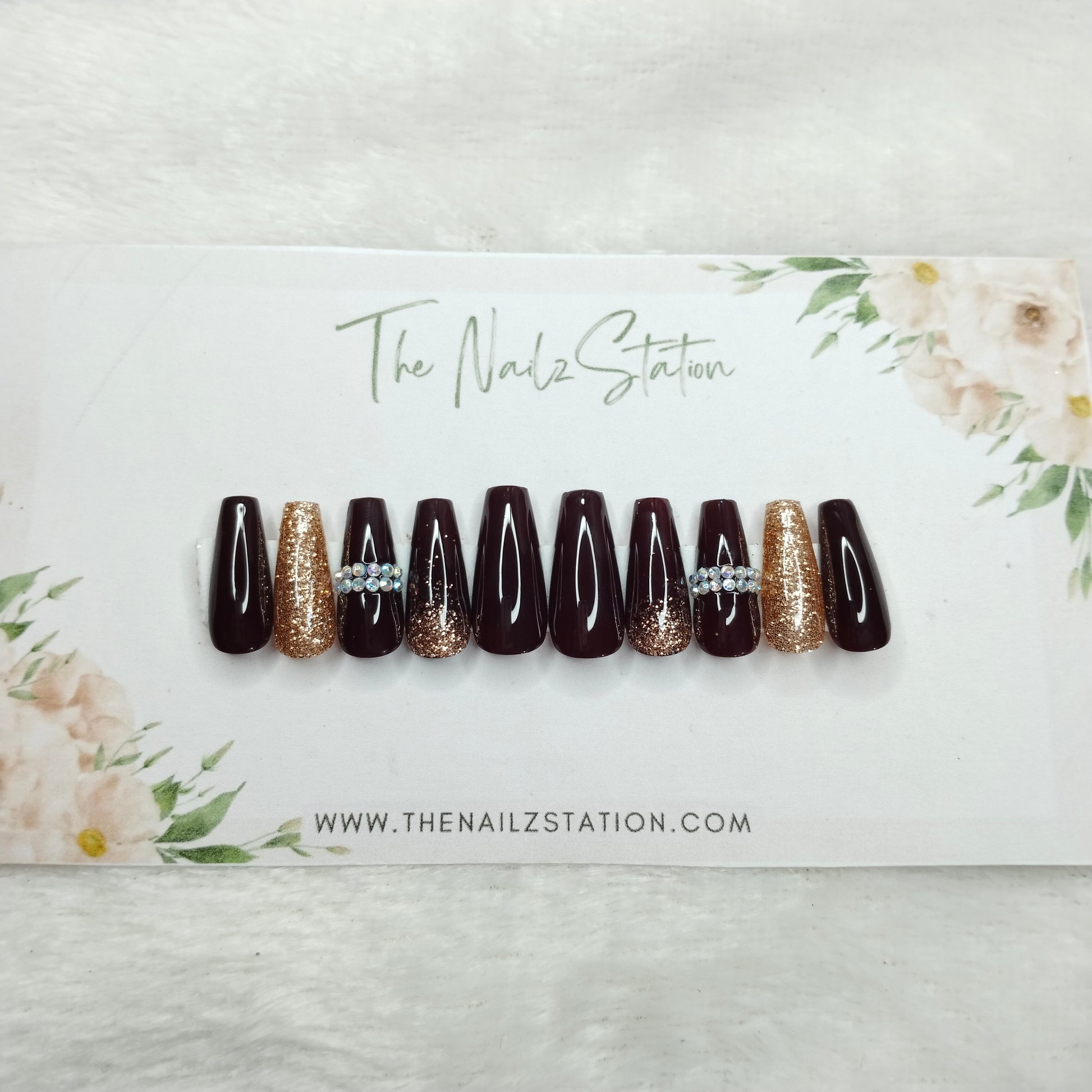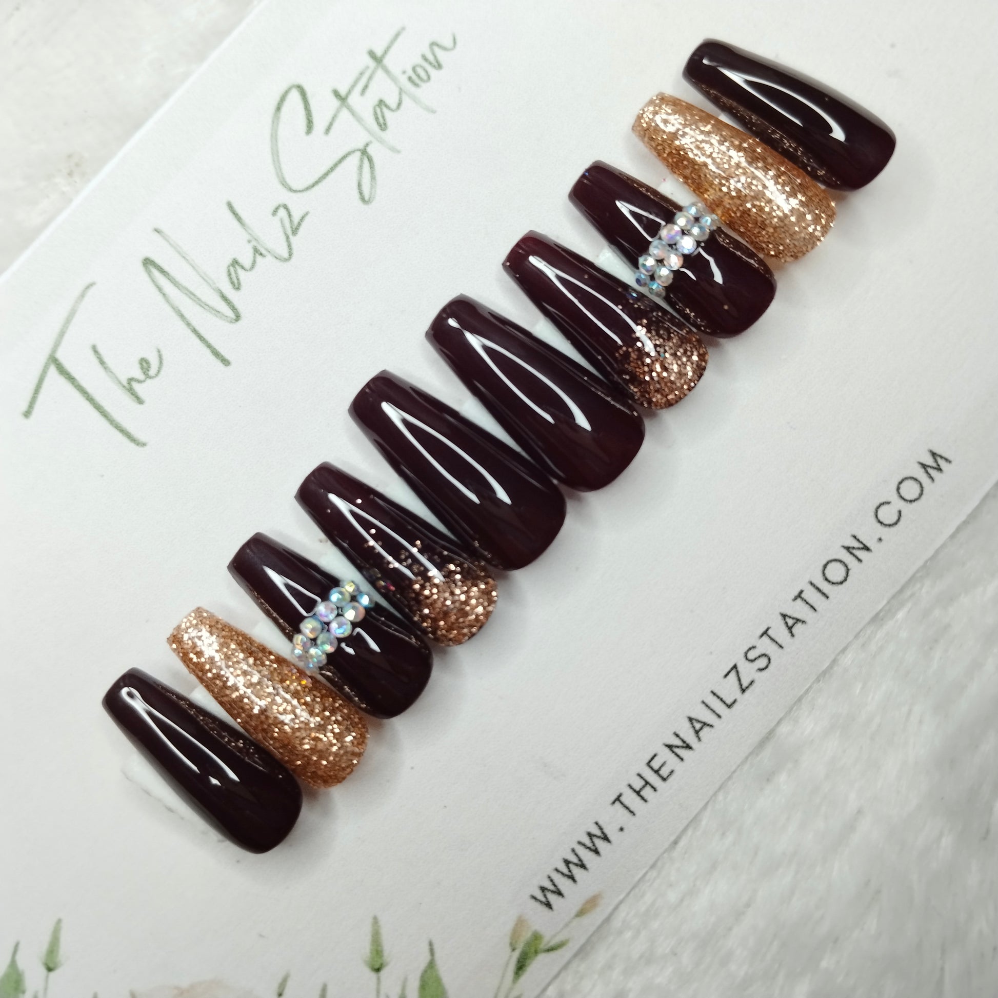 The NailzStation Glossy Maroon Glitter Studded Press on Fake Artificial Nails Set with glue, filer, sticker application kit // 1504