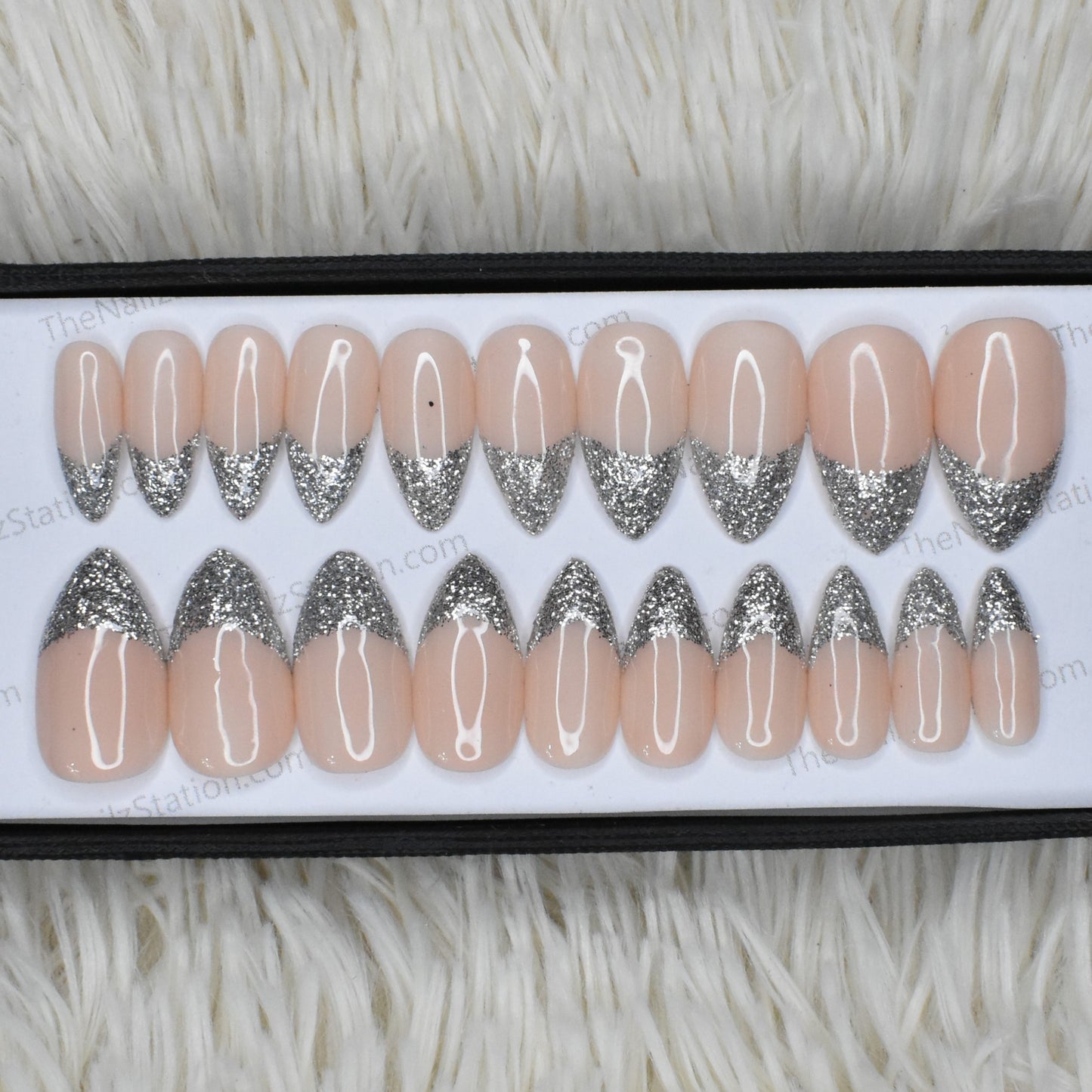 The NailzStation Glossy Nude Silver Glitter French Press on Fake Artificial Nails Set with glue, filer, sticker application kit // 1320