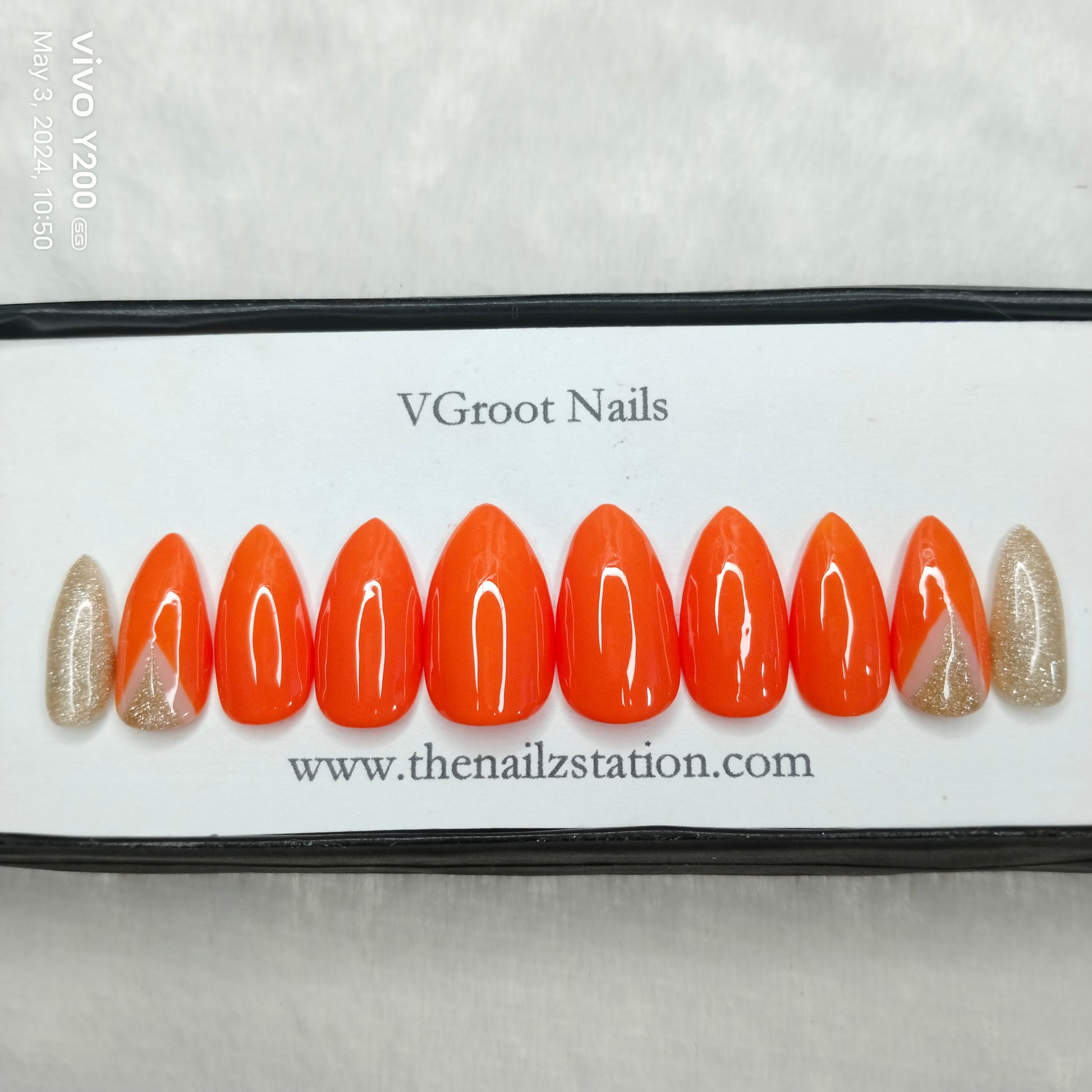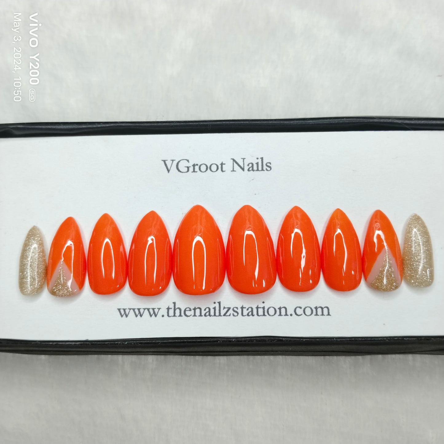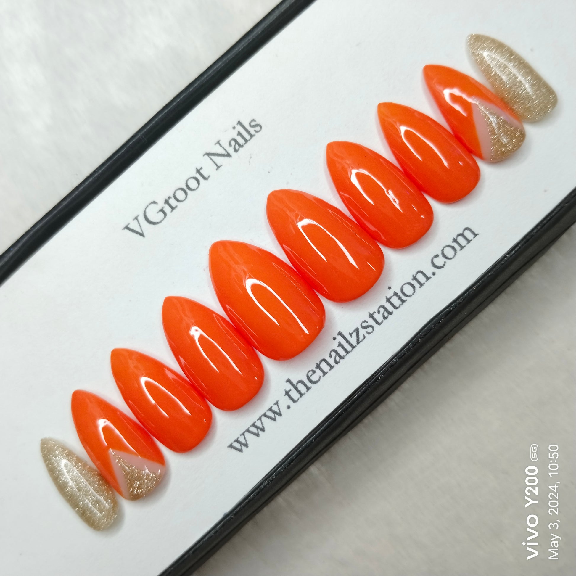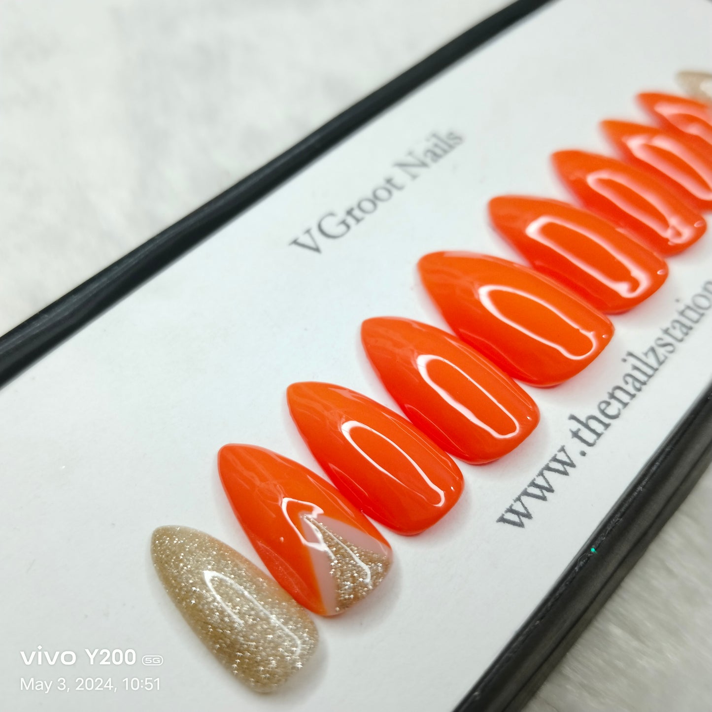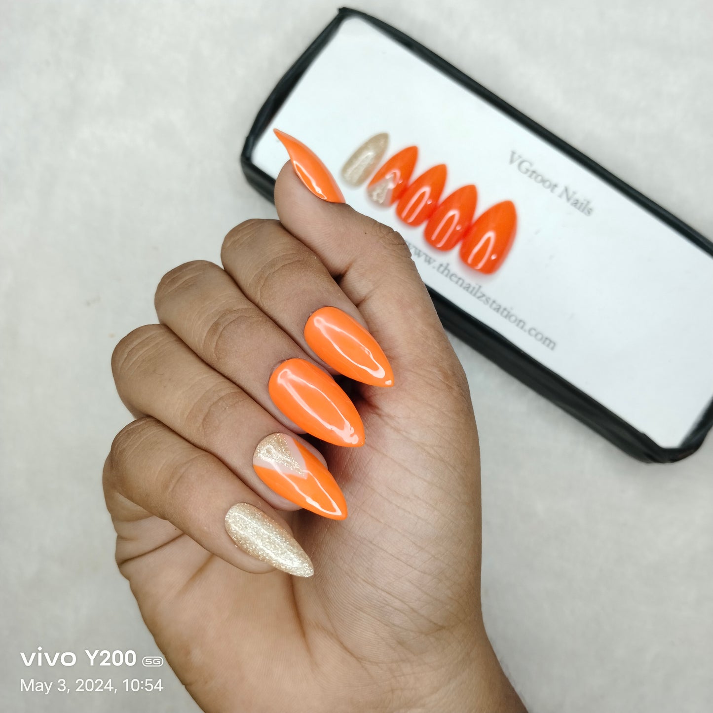 The NailzStation Glossy Orange Glitter Press on Fake Artificial Nails Set with glue, filer, sticker application kit // 1151