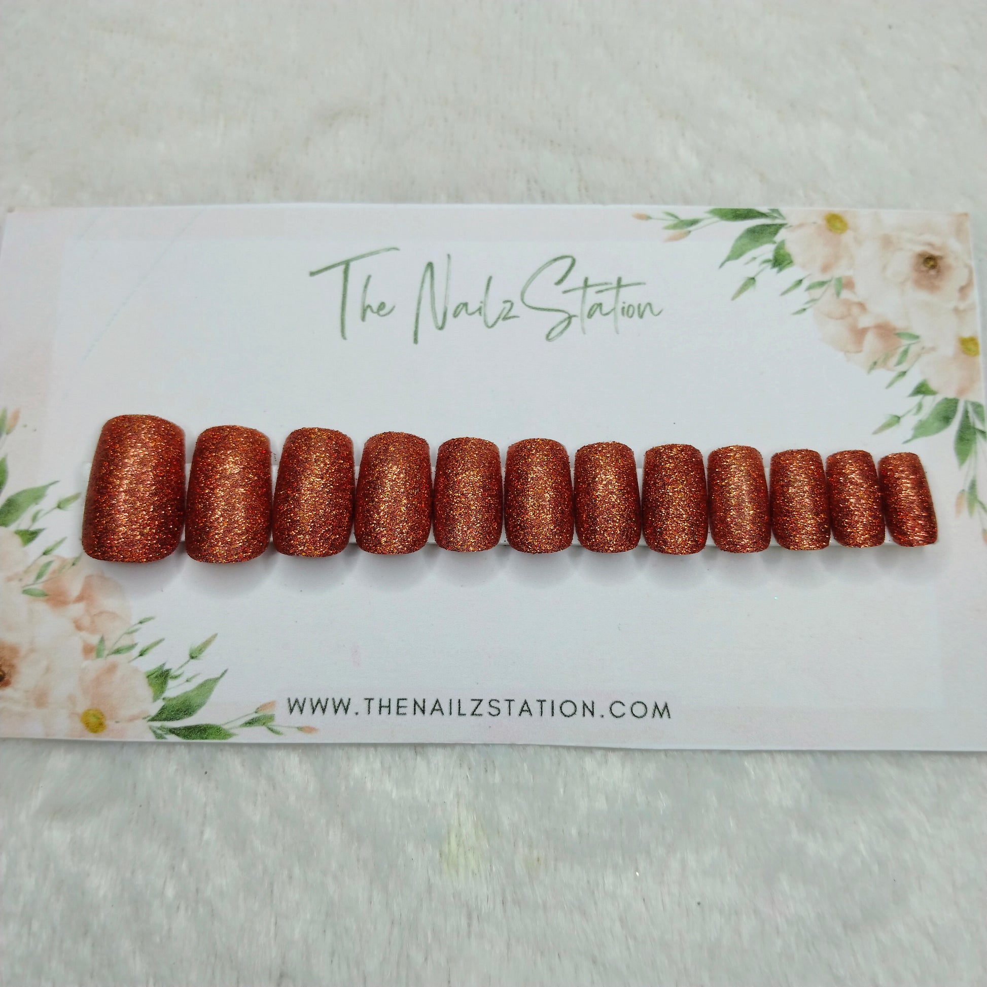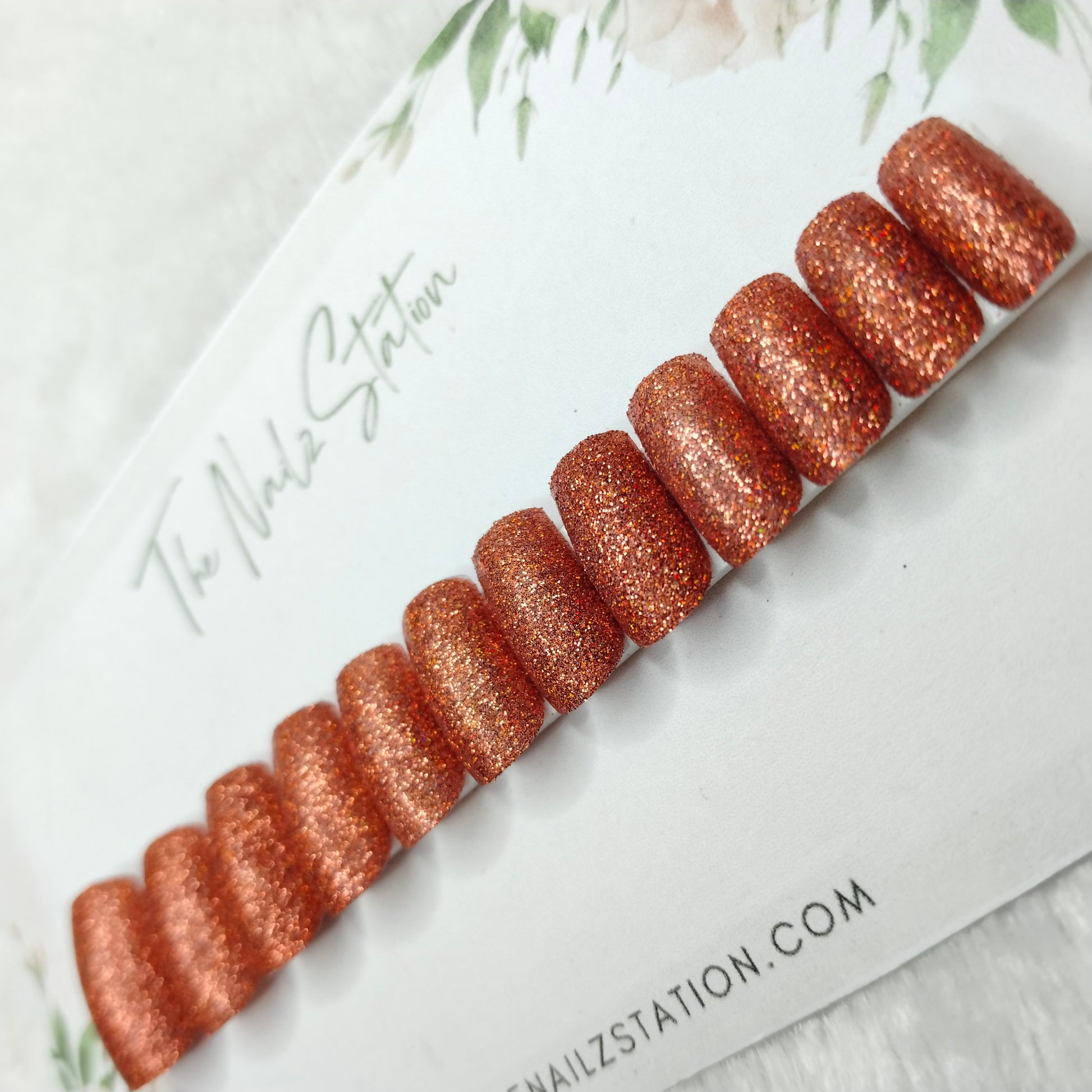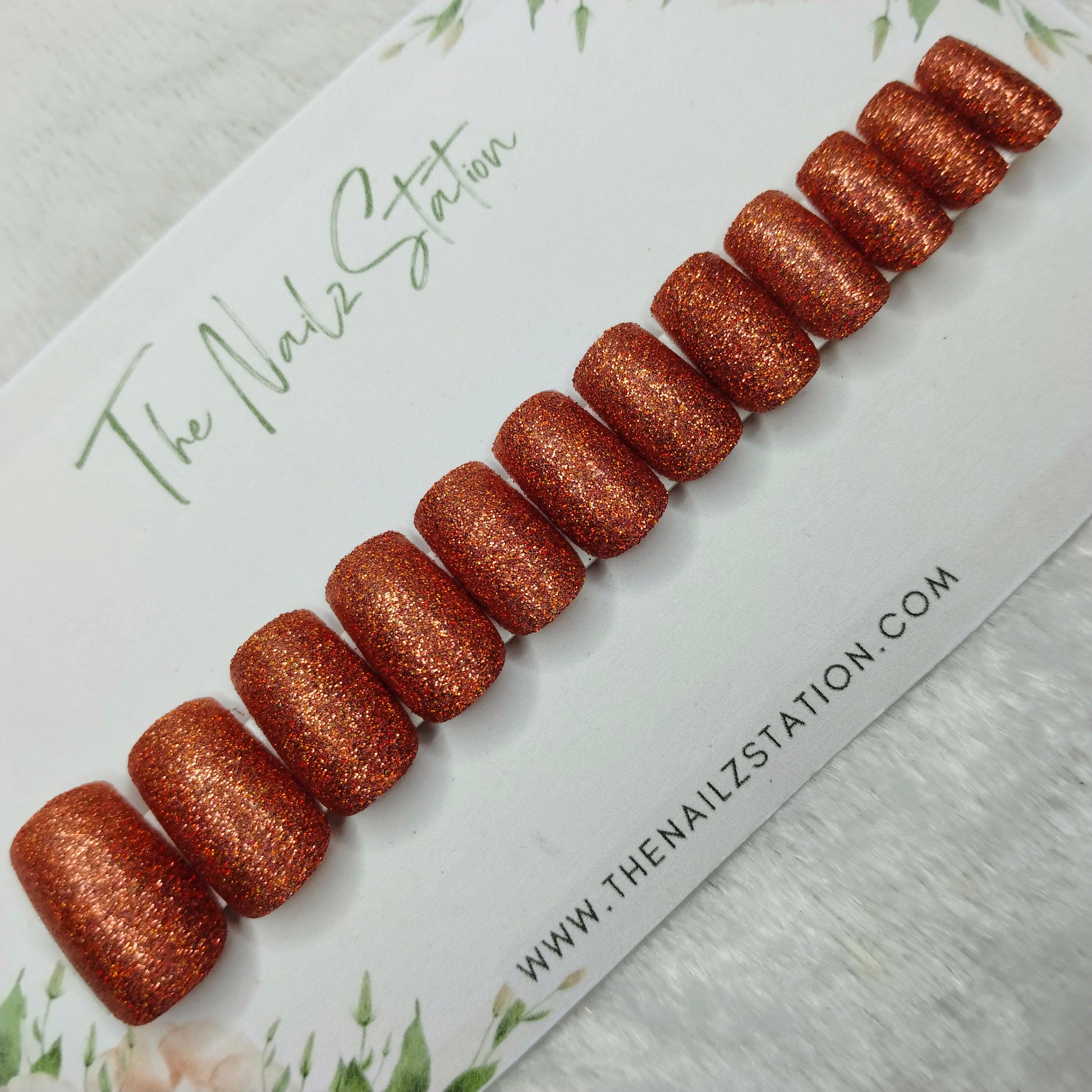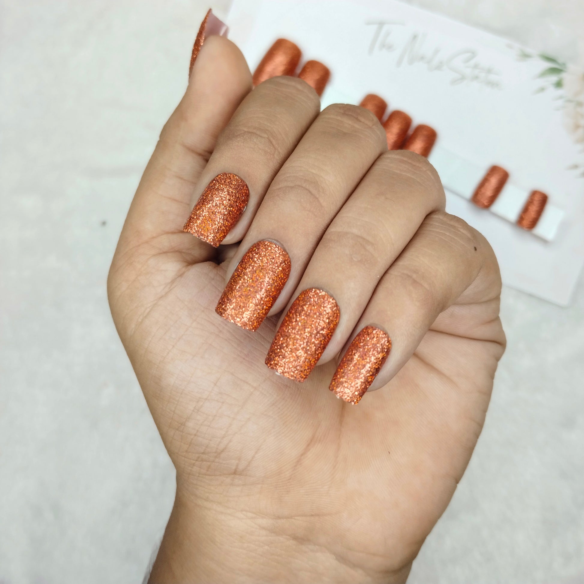 The NailzStation Glossy Orange Glitter Press on Fake Artificial Nails Set with glue, filer, sticker application kit // 1482