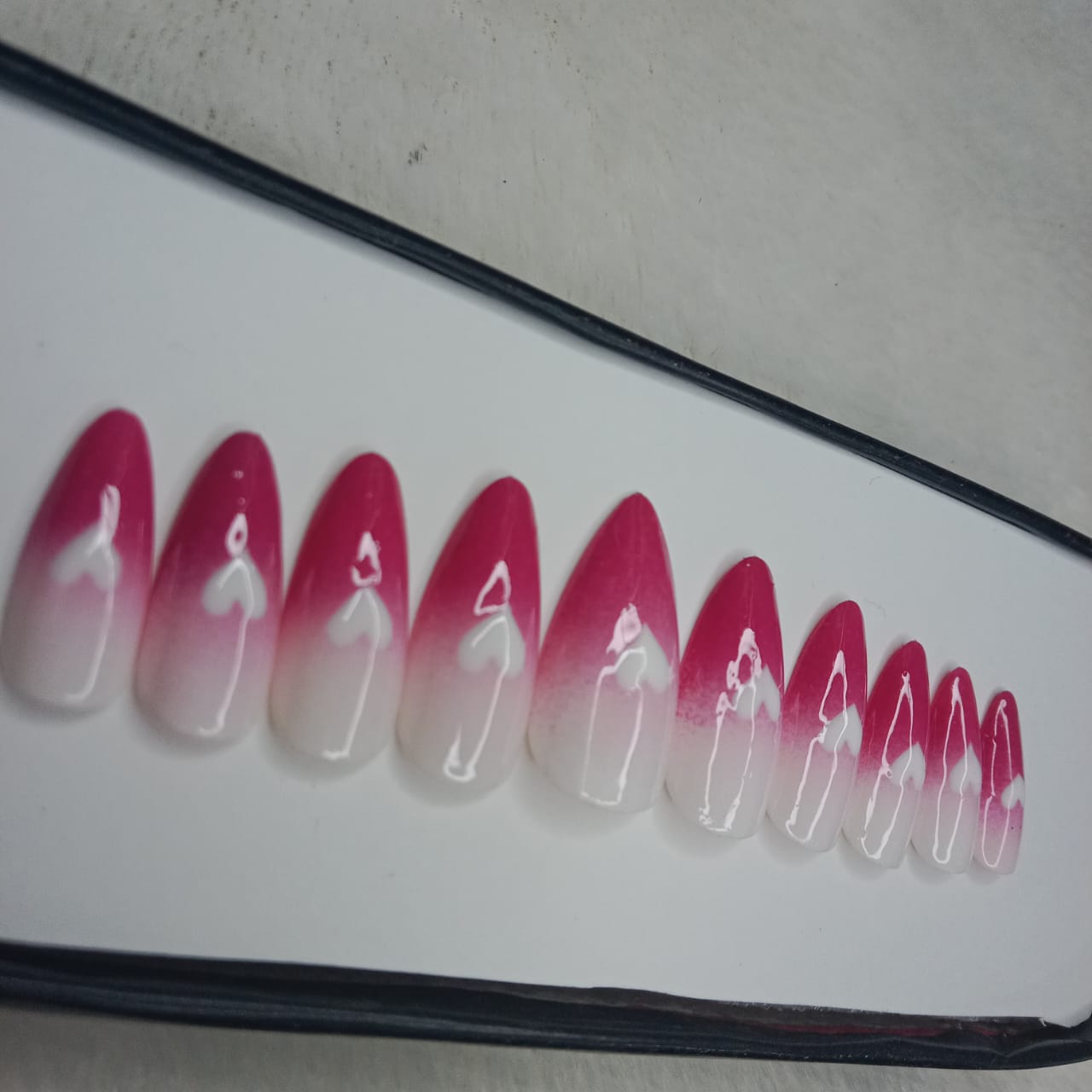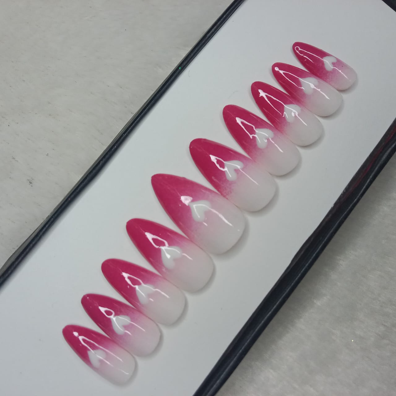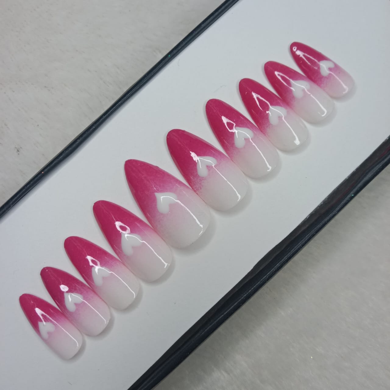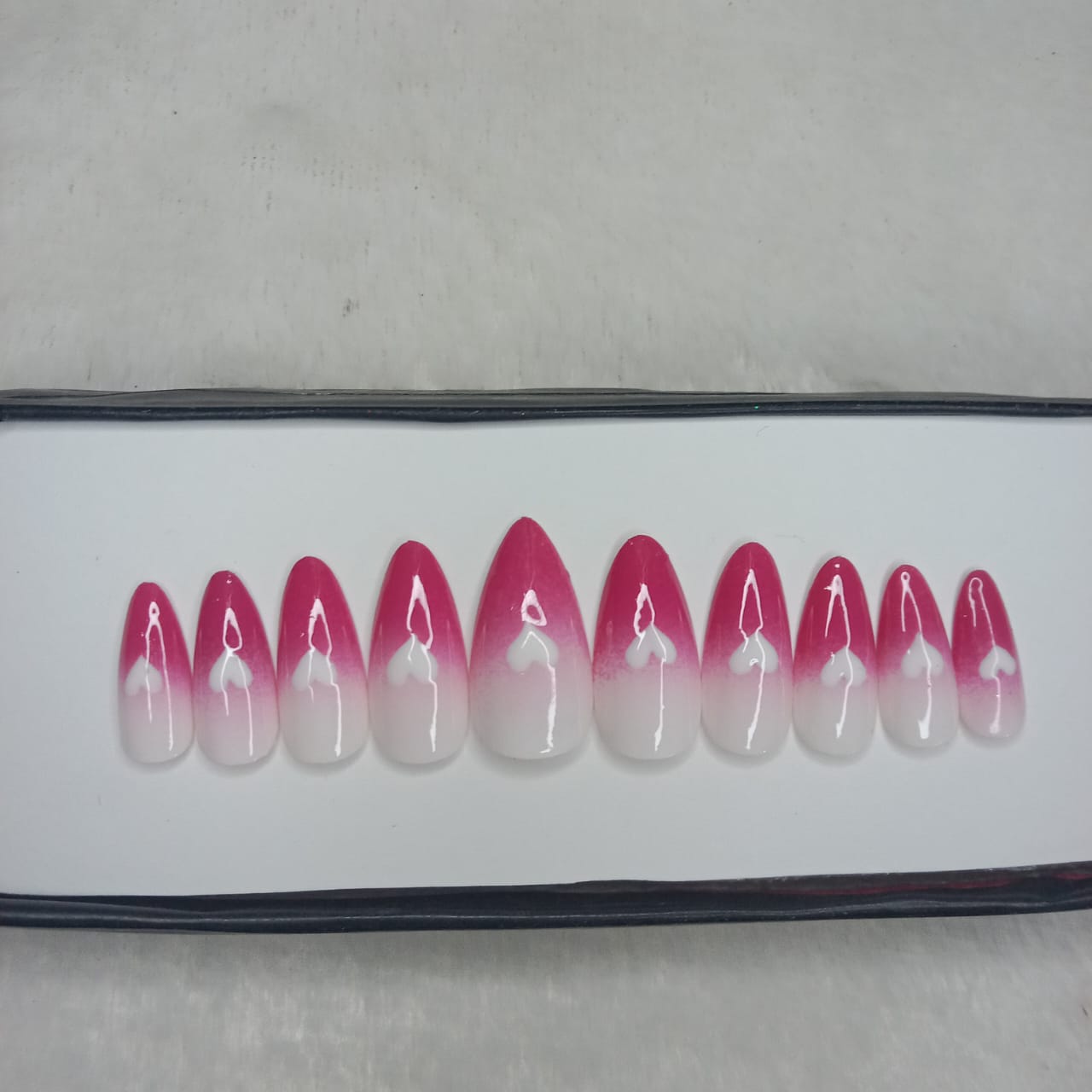 The NailzStation Glossy Pink and White Ombre Hearts Press on Fake Artificial Nails Set with glue, filer, sticker application kit // 1251